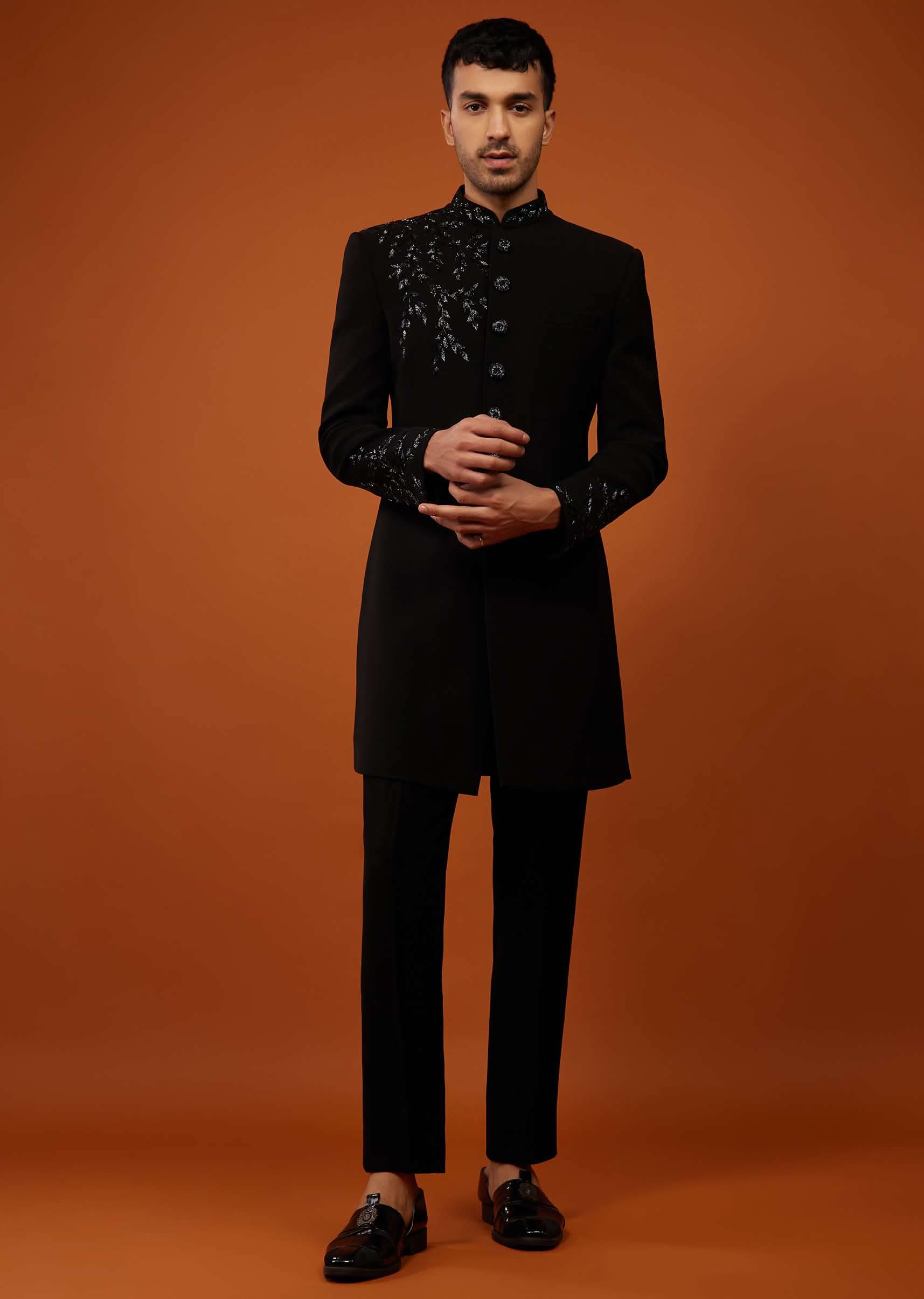 - Black embroidered indo-western sherwani set fabricated in imported suiting fabric.