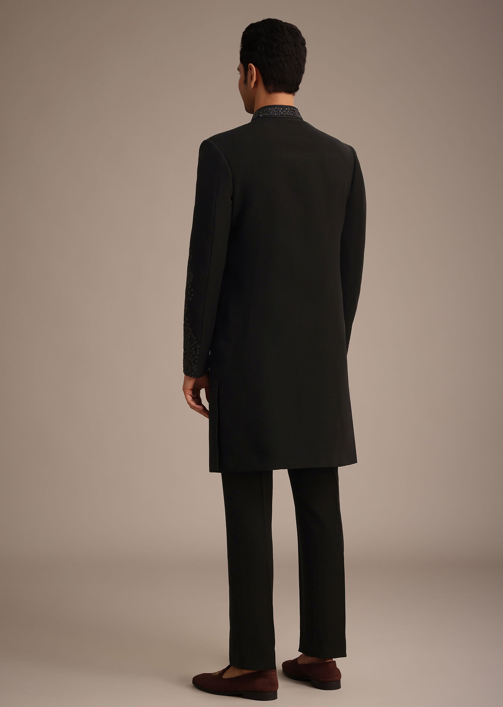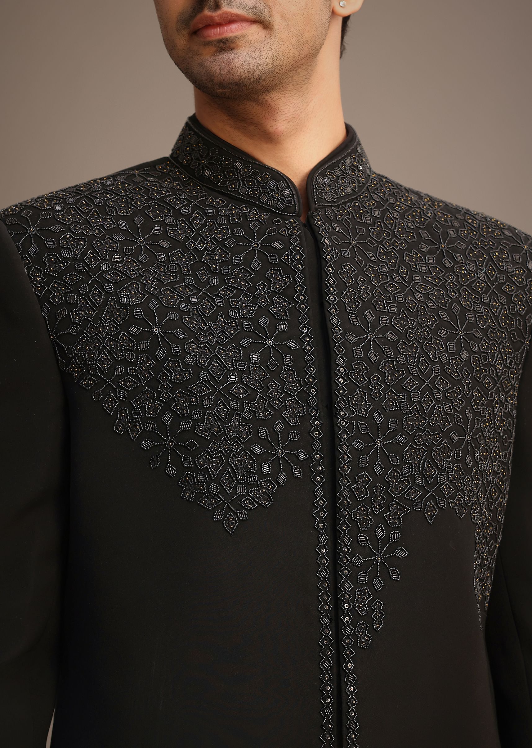 - A subtle and elegant style that is an ideal choice for grandeur celebrations is this black indowestern set.