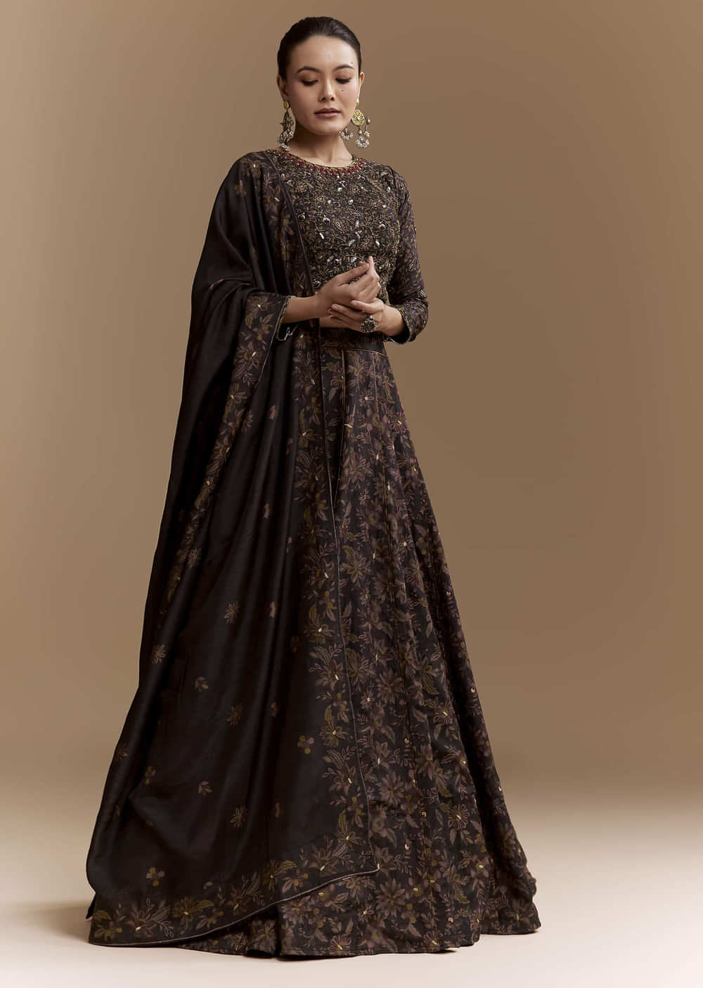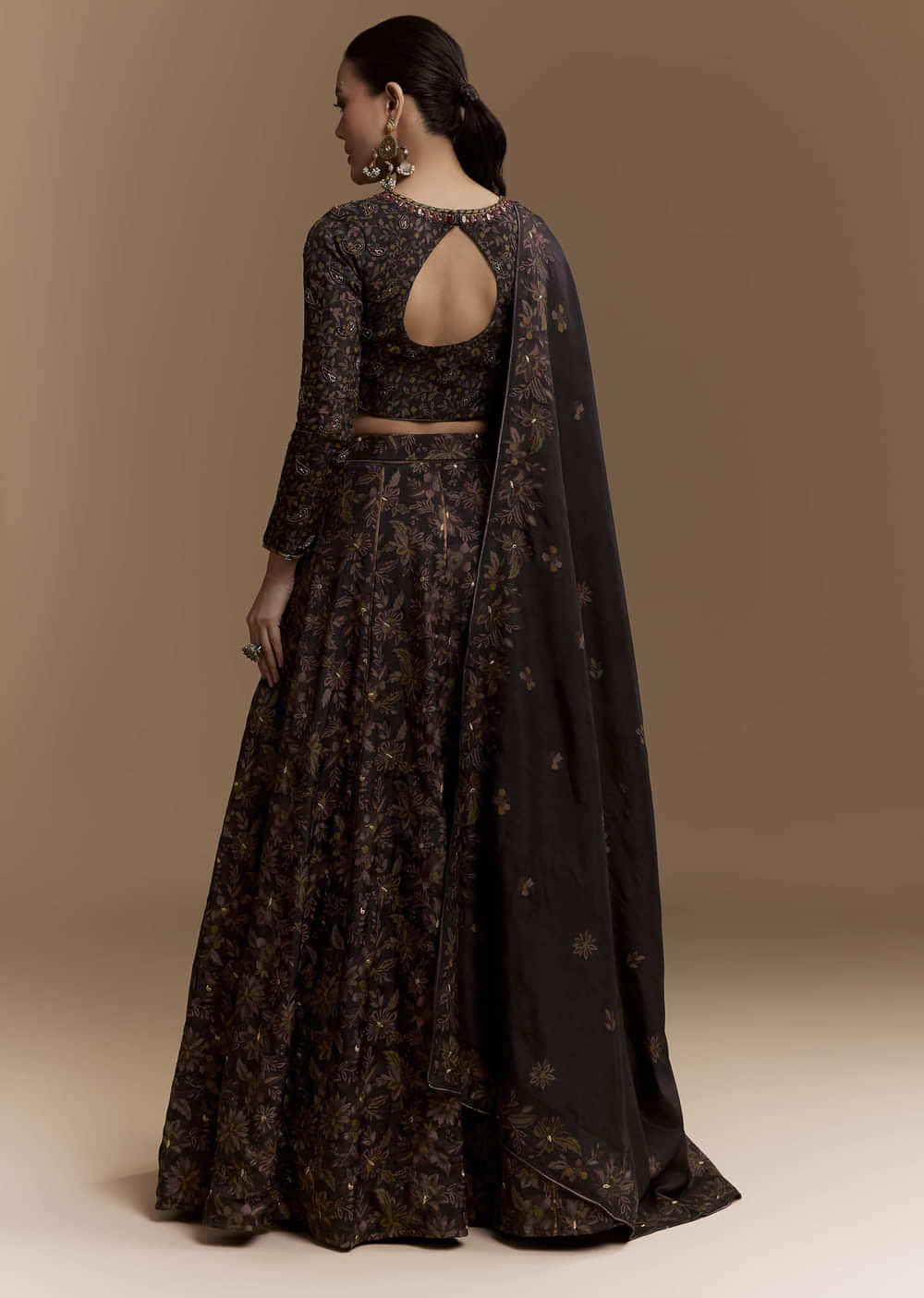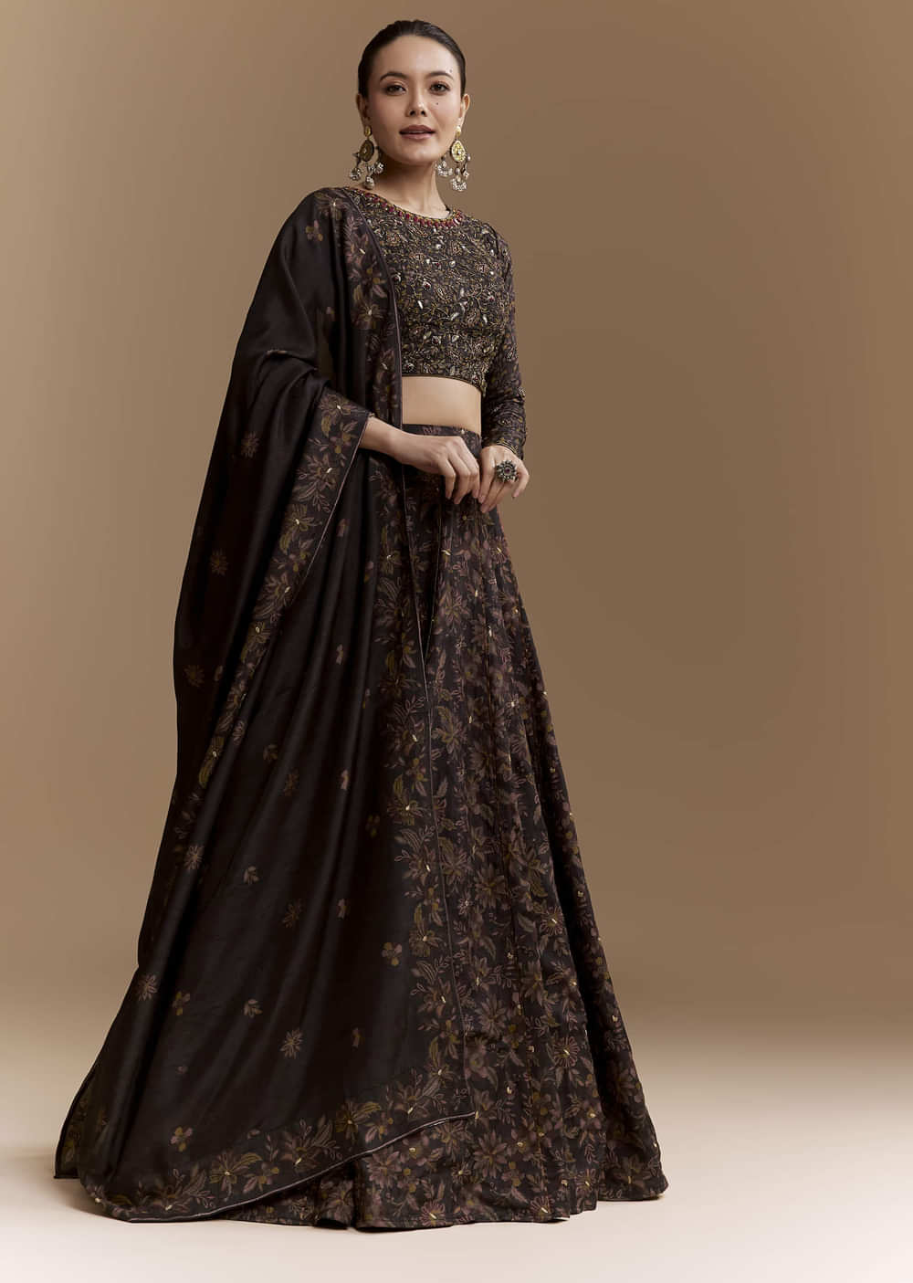 Black Floral Print Silk Brdiesmaid Lehenga Set with Dupatta