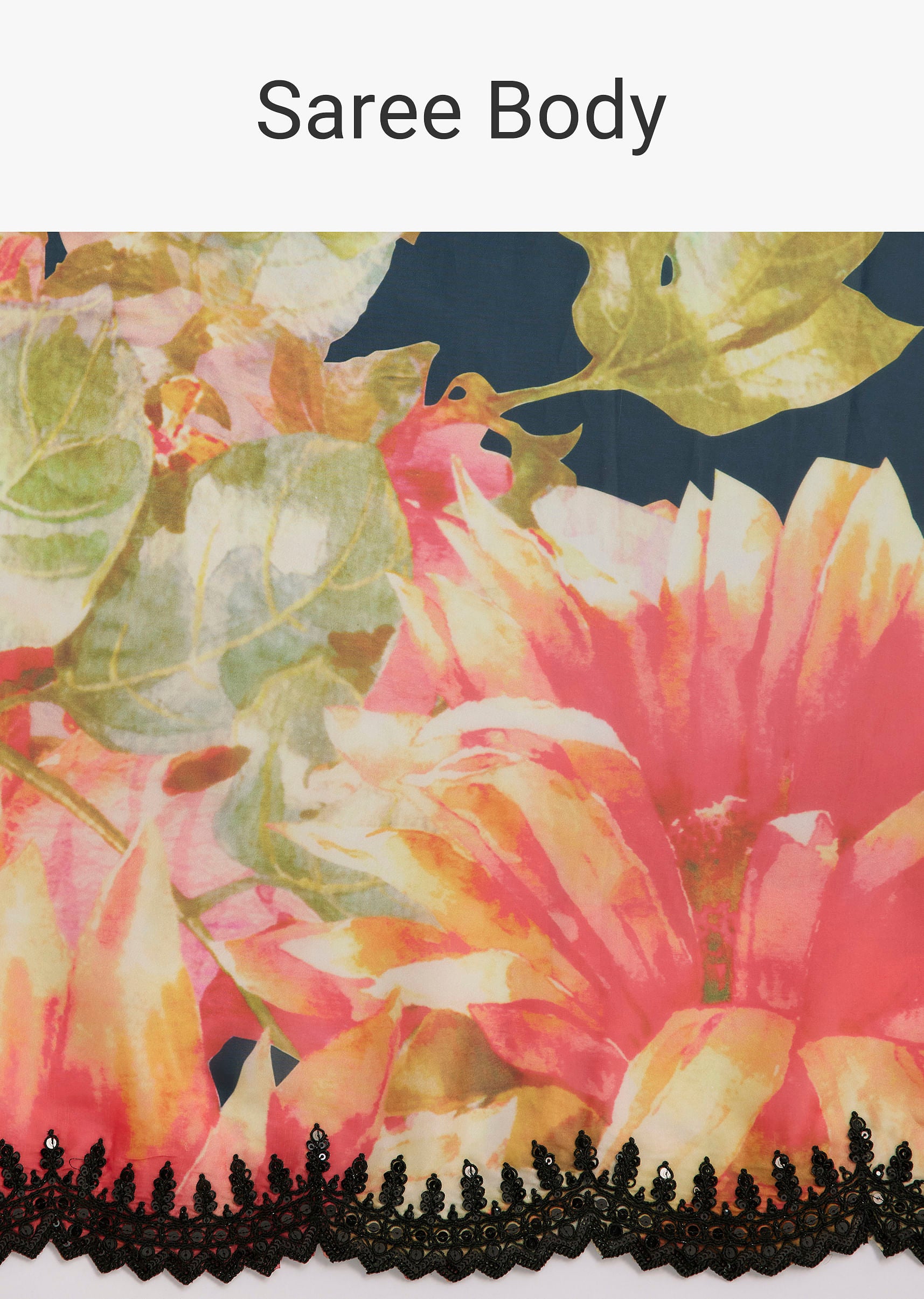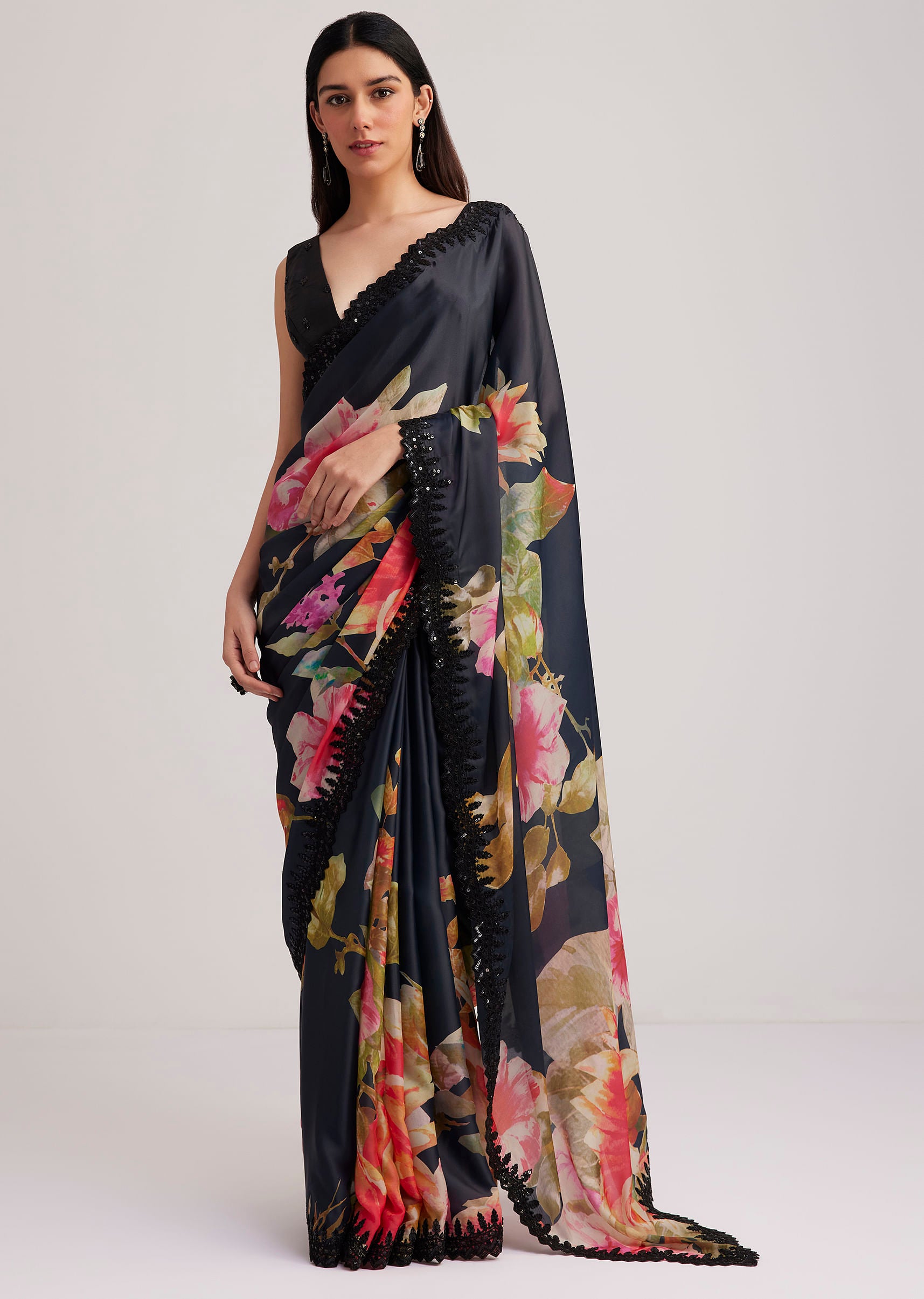 Black Floral Printed Satin Saree With Sequins Lace Border