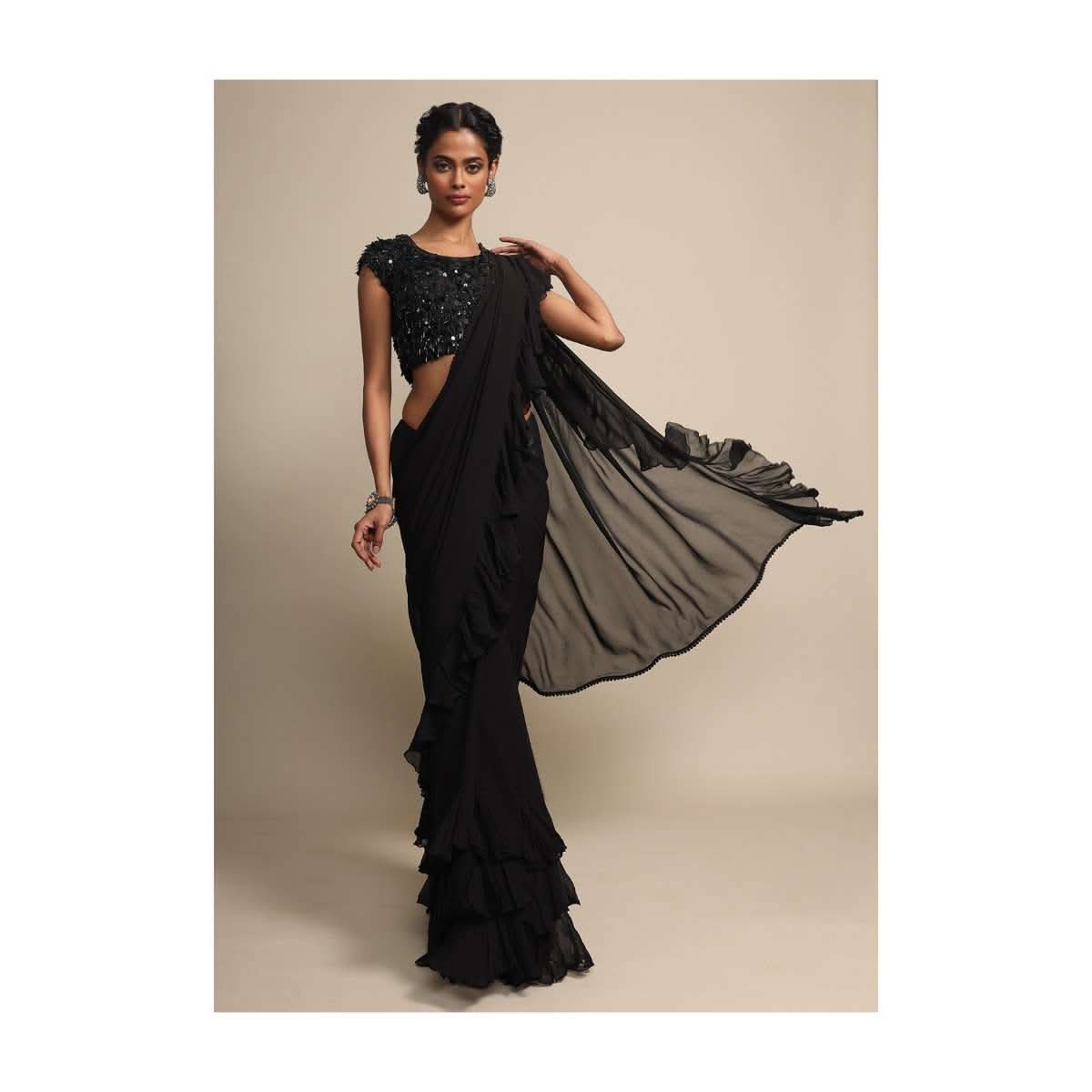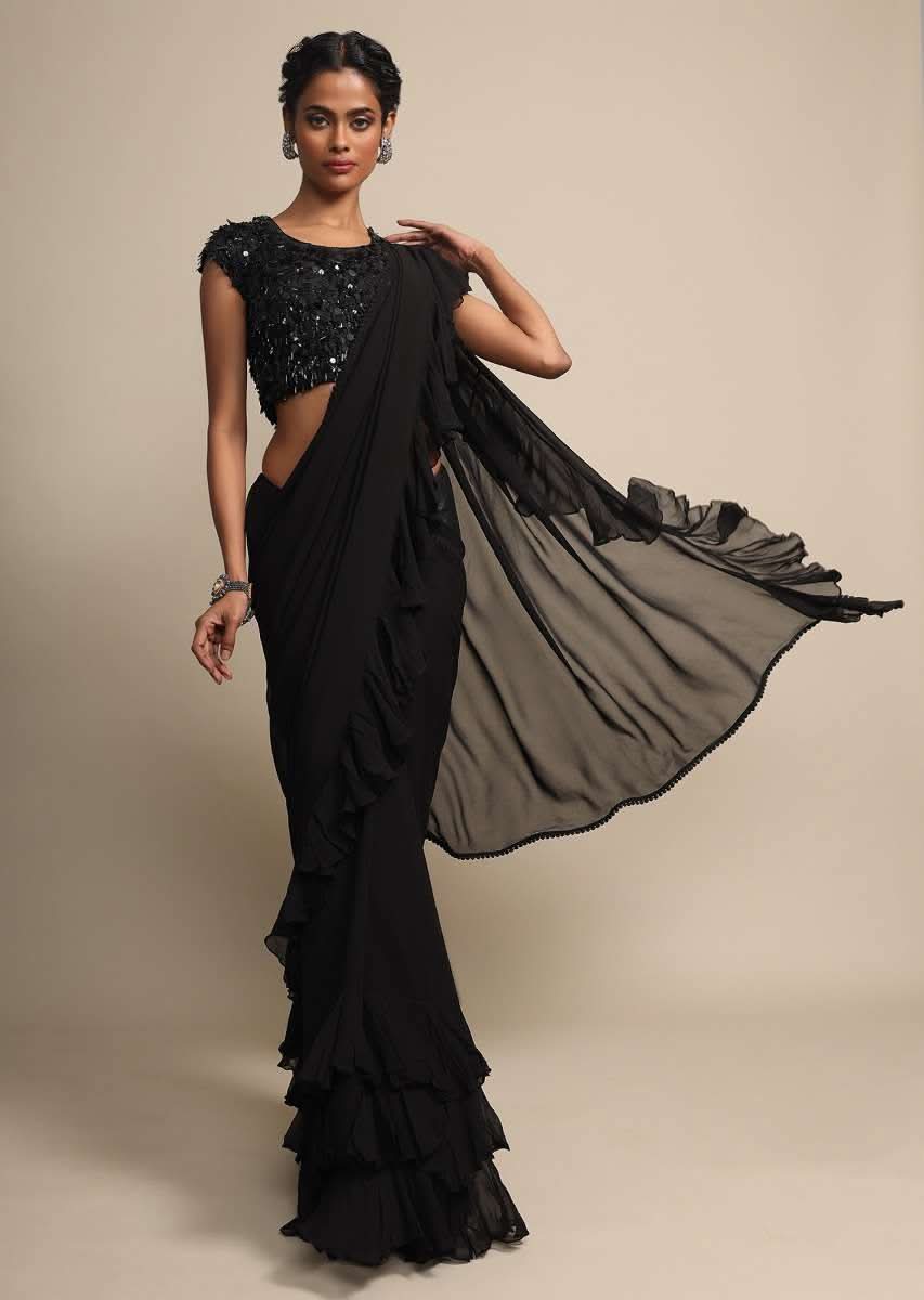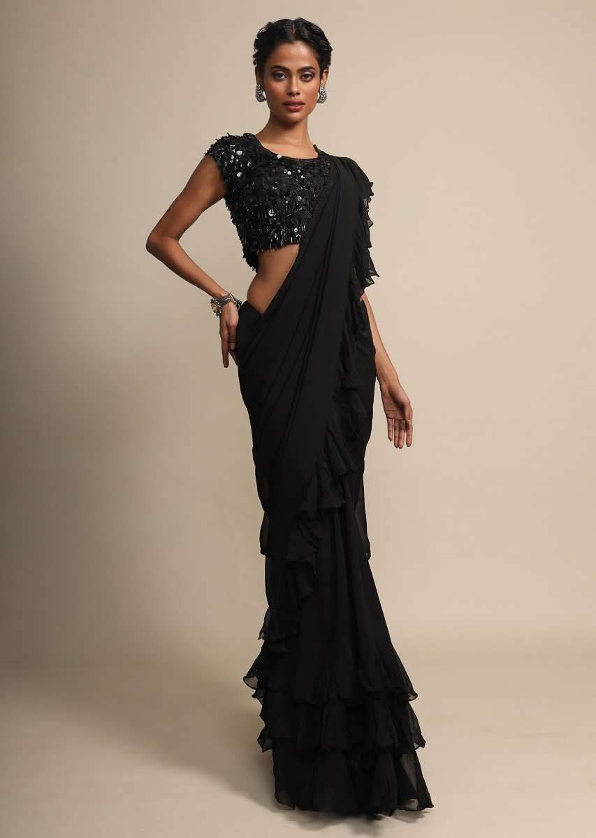 Black Georgette Saree With Frills Online - Kalki Fashion