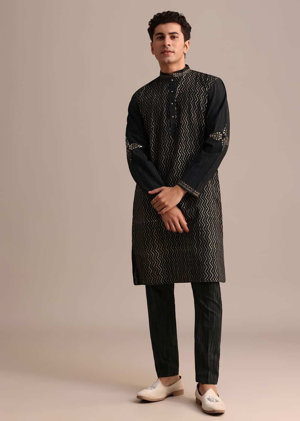- Indulge in the exquisite artistry of Indian craftsmanship with our black hand block printed kurta set adorned with shimmering foil work.