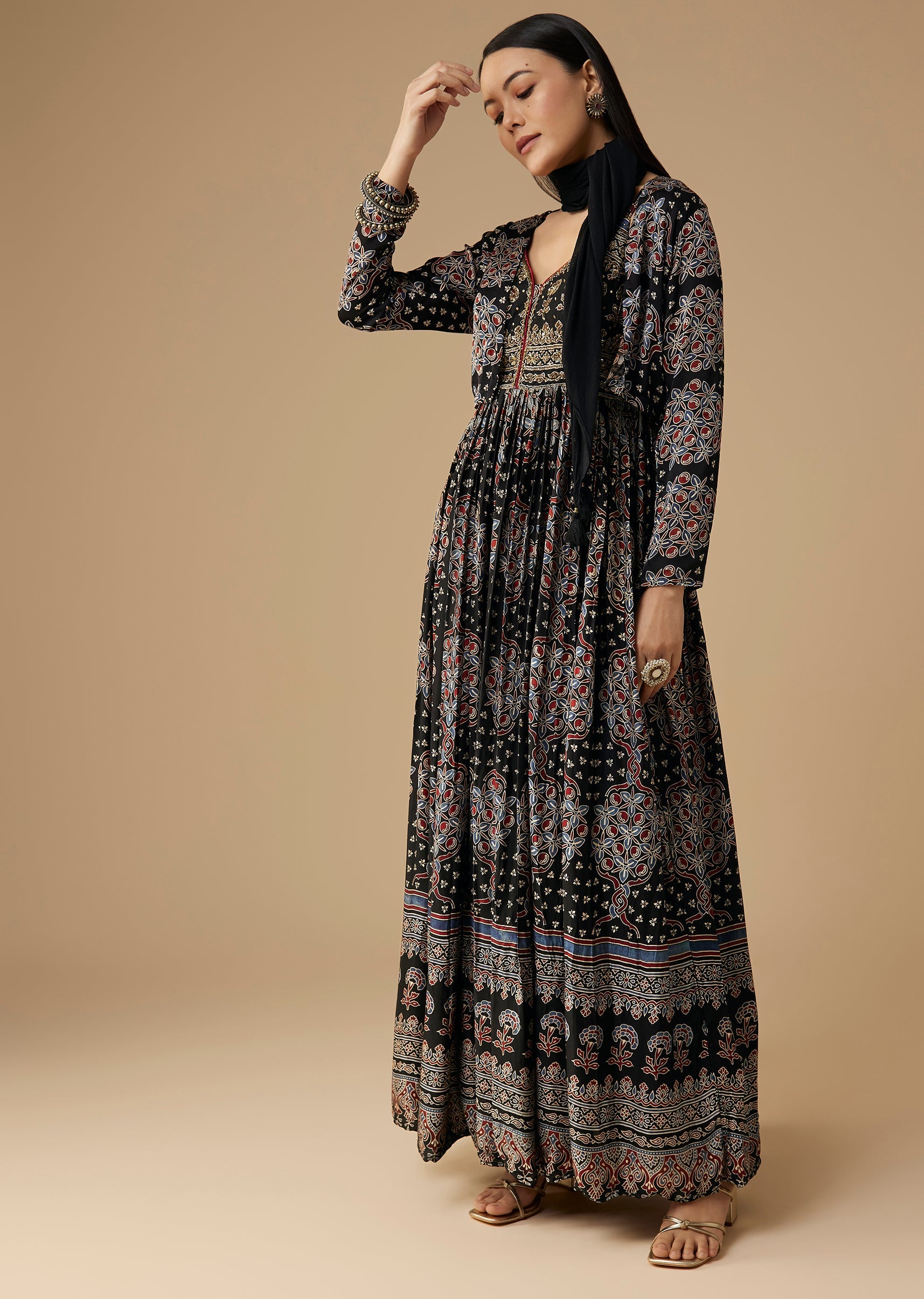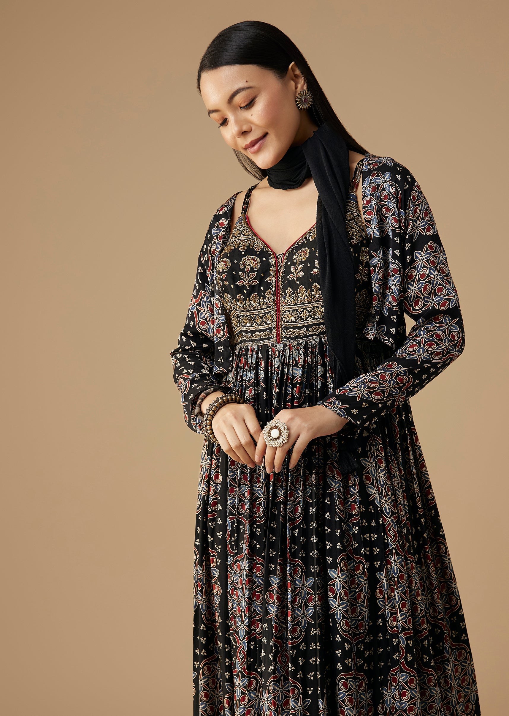 Black Hand Dyed Ajrakh Gown Set with Jacket and Scarf