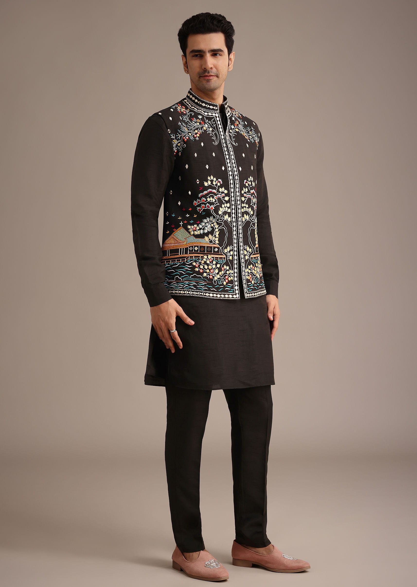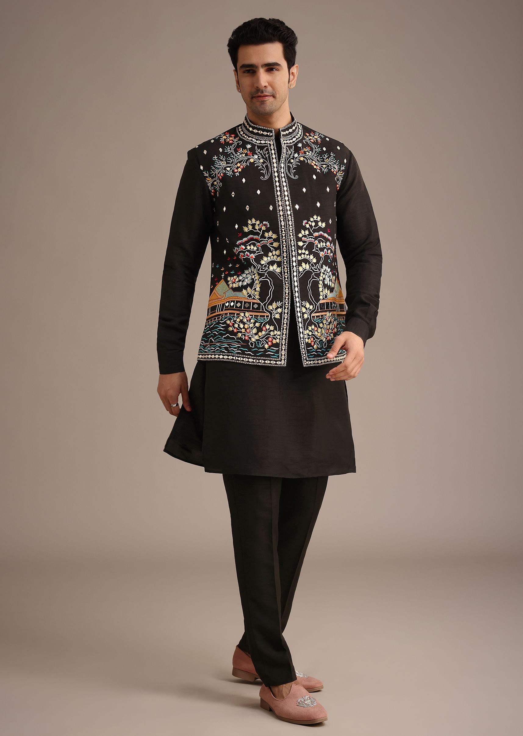 - A dazzling choice to shine through celebratory season is this black kurta and jacket set.