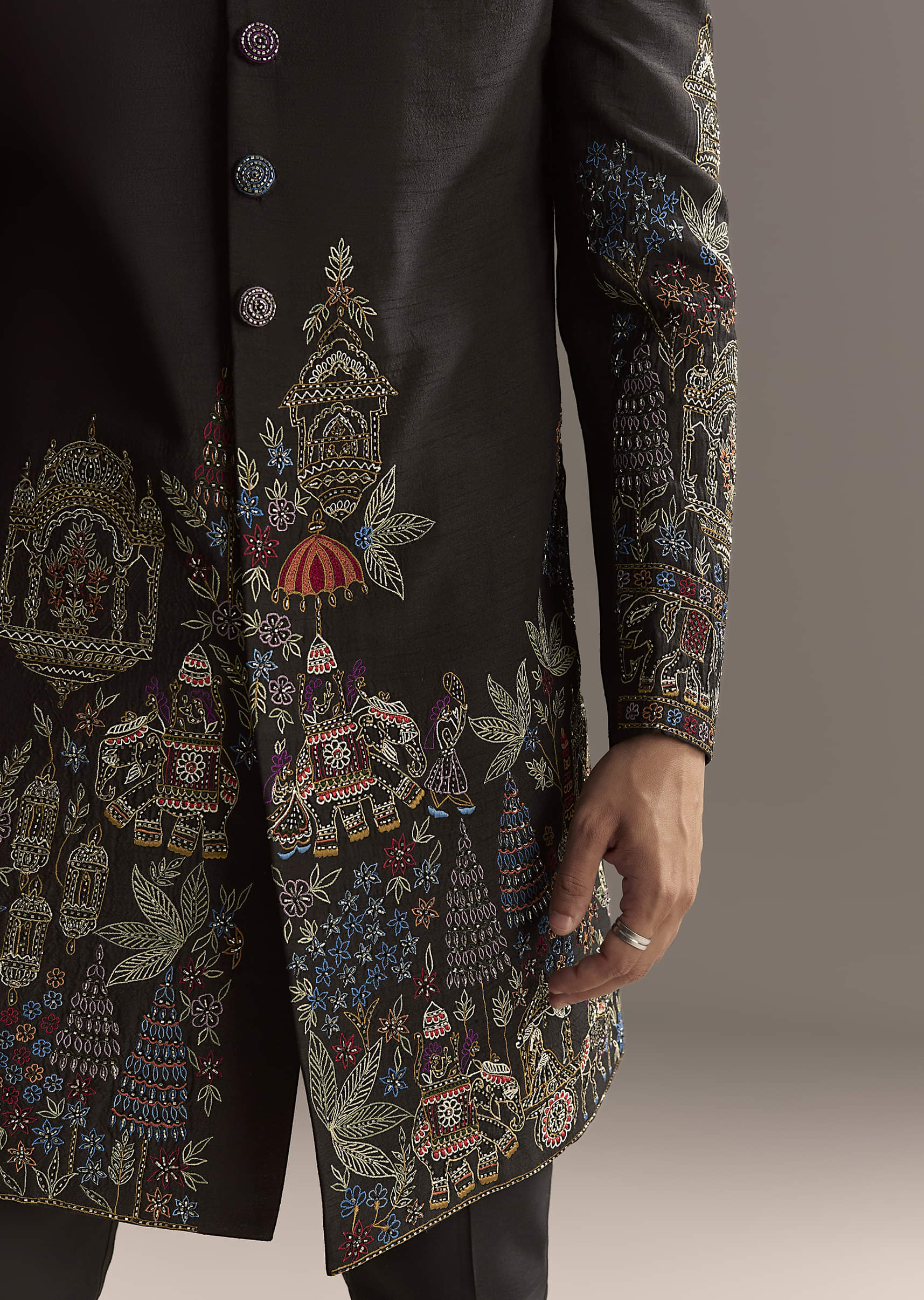 Tradition meets colour in this black indo western set in suiting fabric with vibrant floral and ornamental embroidery across sleeves, cuffs, and hem. Multicolour buttons, a patterned collar, and a coordinated pocket square pull the story together. You bring festive personality to sangeet and reception nights without losing polish. Awarded as the Most Trusted Brand, we're delivering styles you love, just as promised.