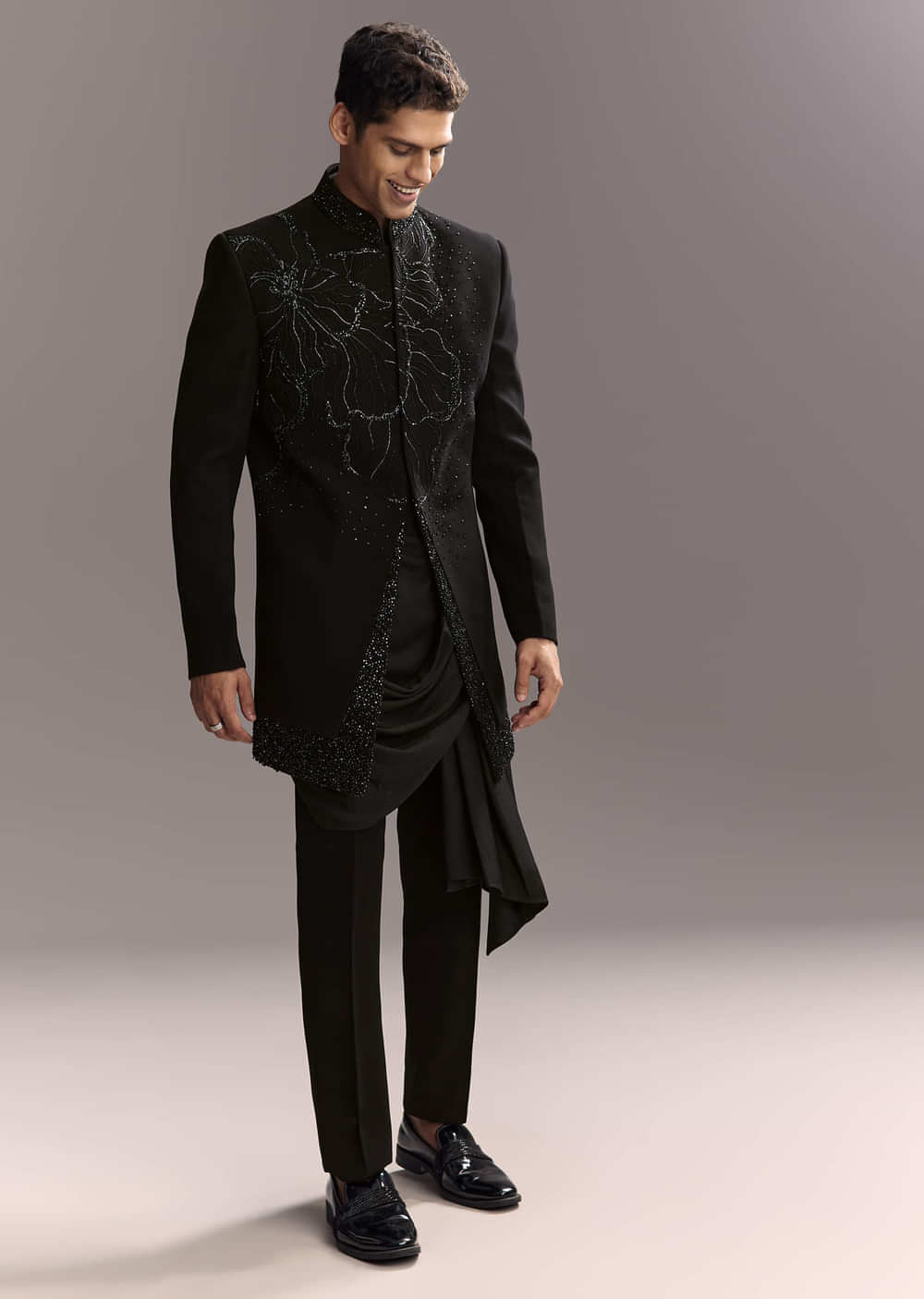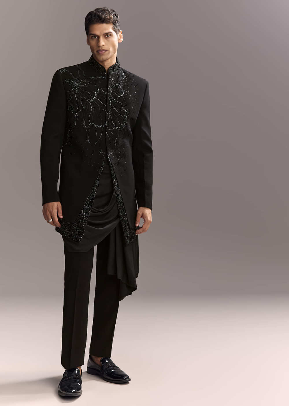 Built for high-energy stages, this black indo western set in suiting fabric combines cut work, moti, and stone embroidery for crisp texture against a dark base. The detailing reads luxe... More Product Details