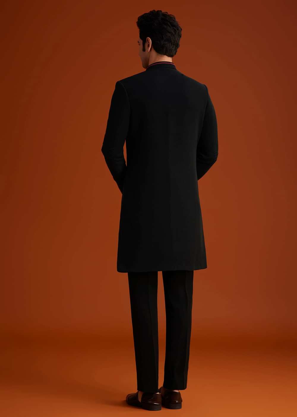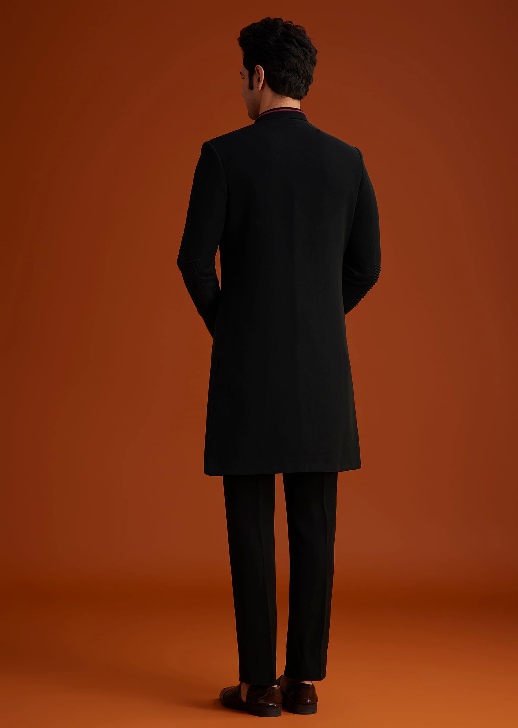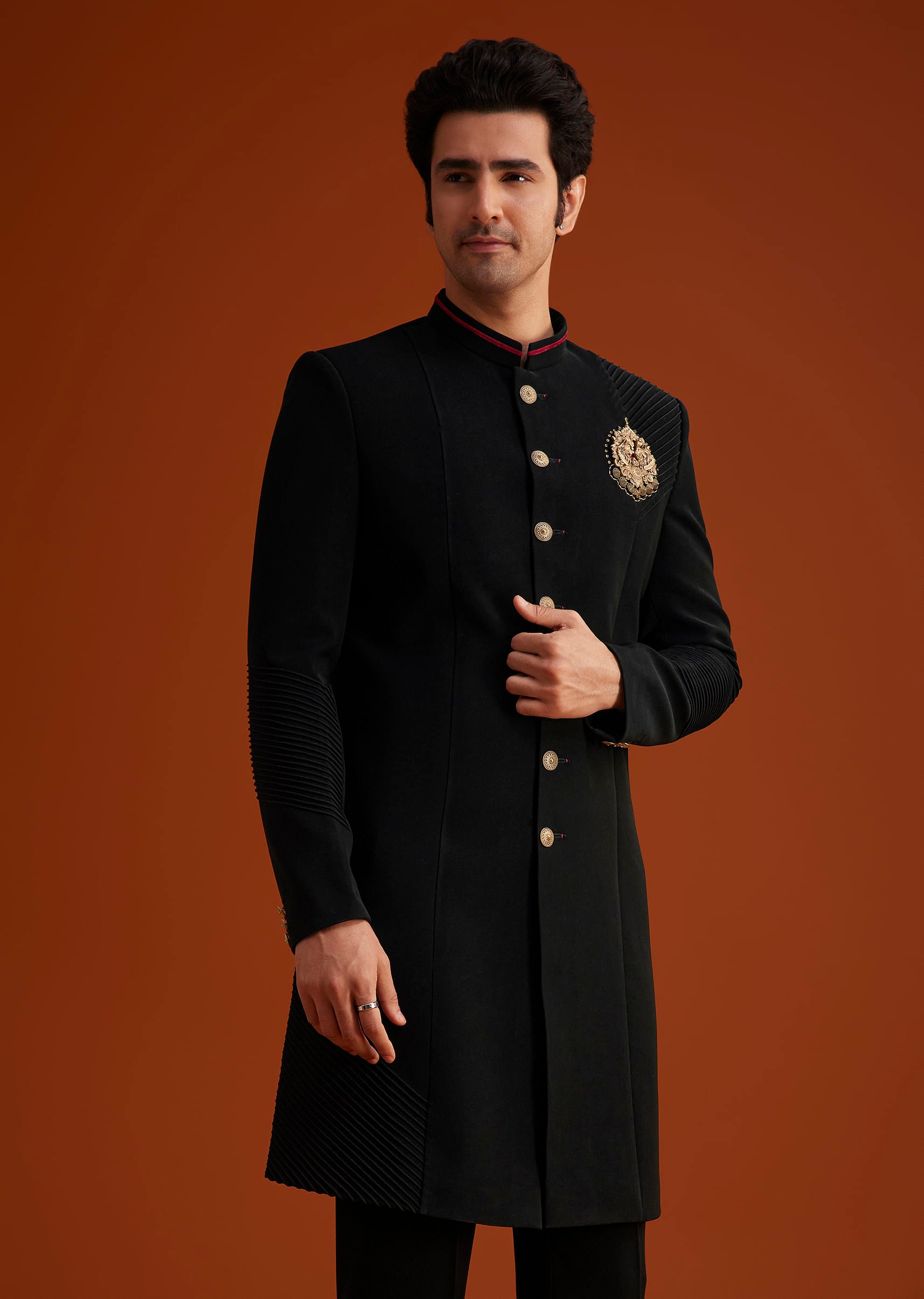 - Make a powerful impression in this black Indo-Western sherwani featuring refined detailing and a regal embroidered crest.