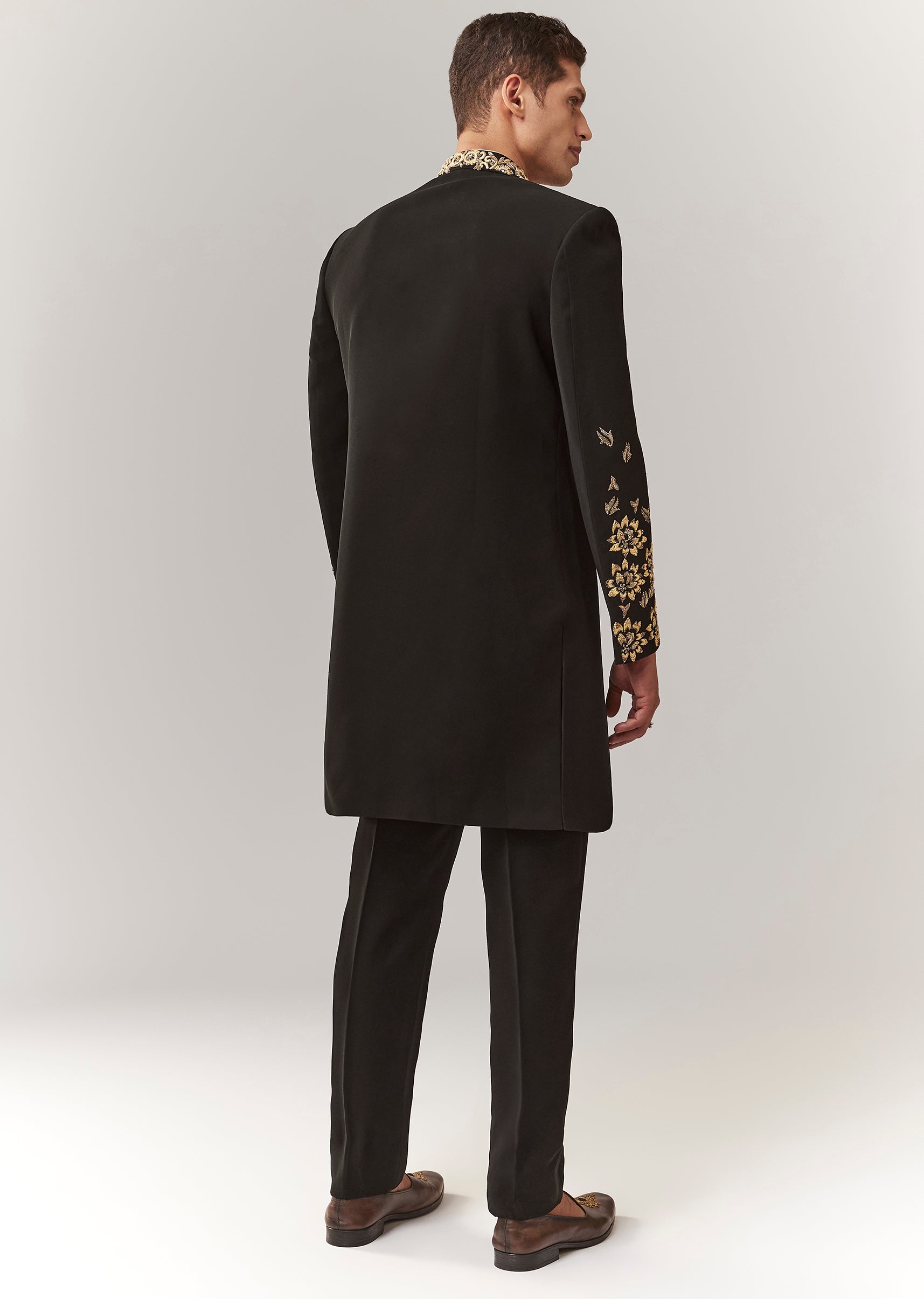 A contemporary black indo-western set featuring zardosi work on imported fabric. Mandarin collar, full sleeves, and front button closure. Paired with straight pants (mid-waist). A solid groomsman pick for mehendi,... More Product Details