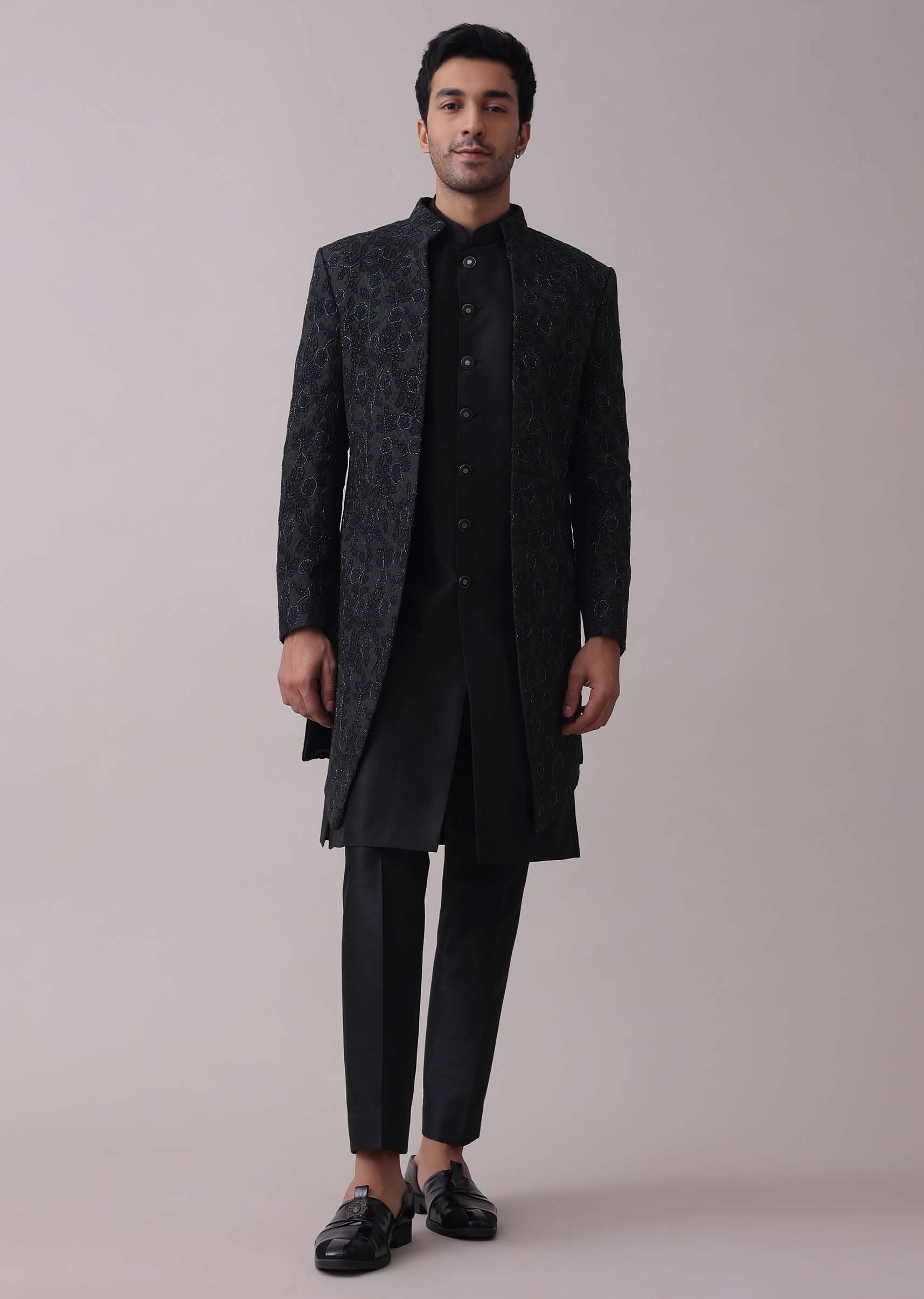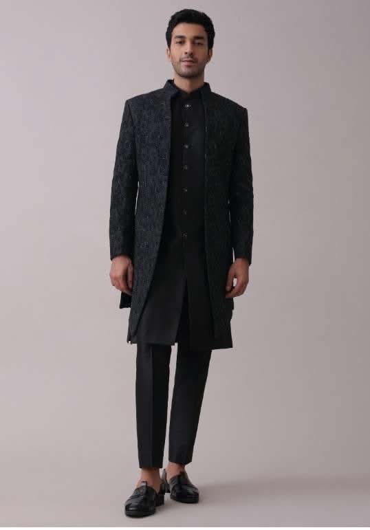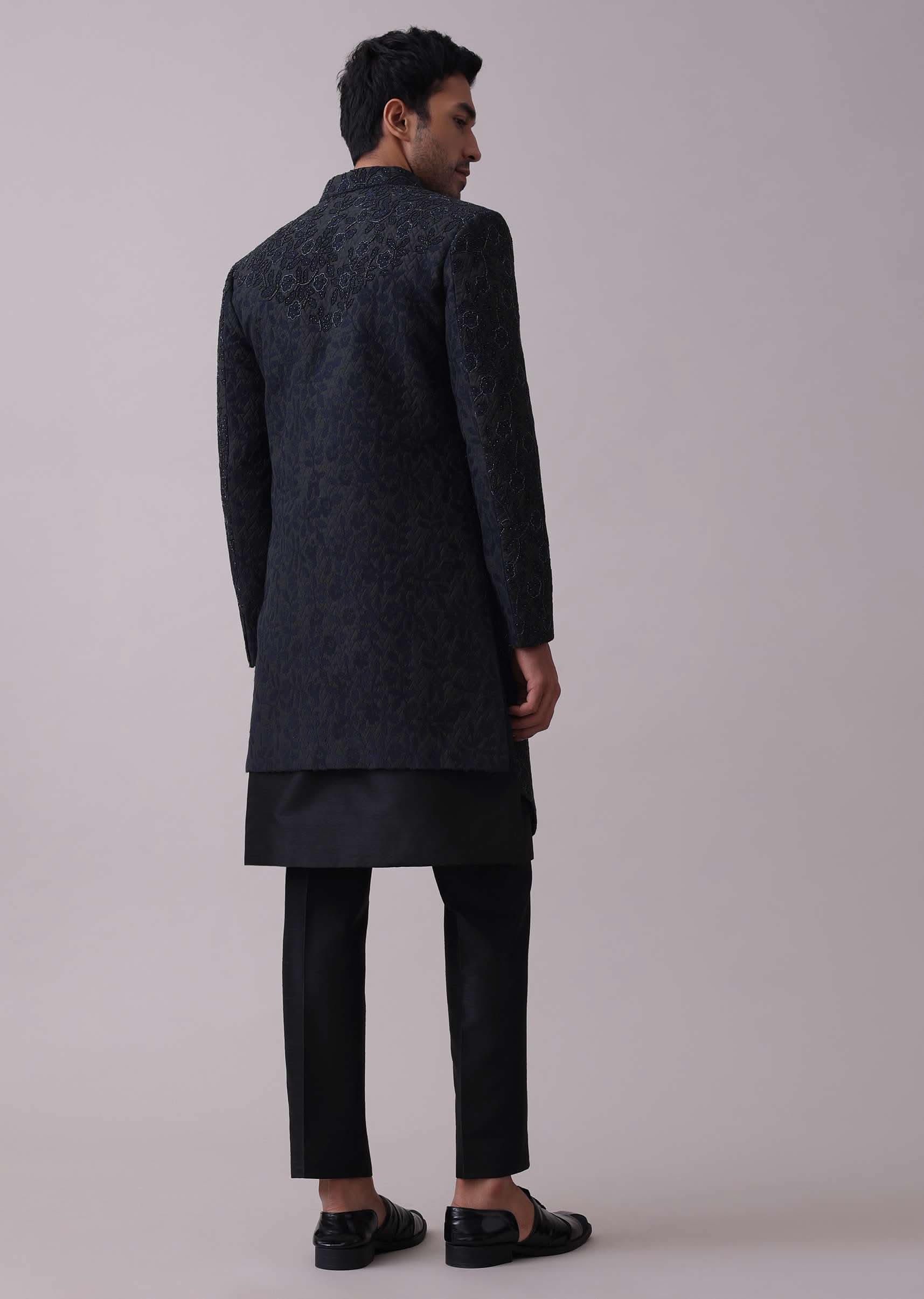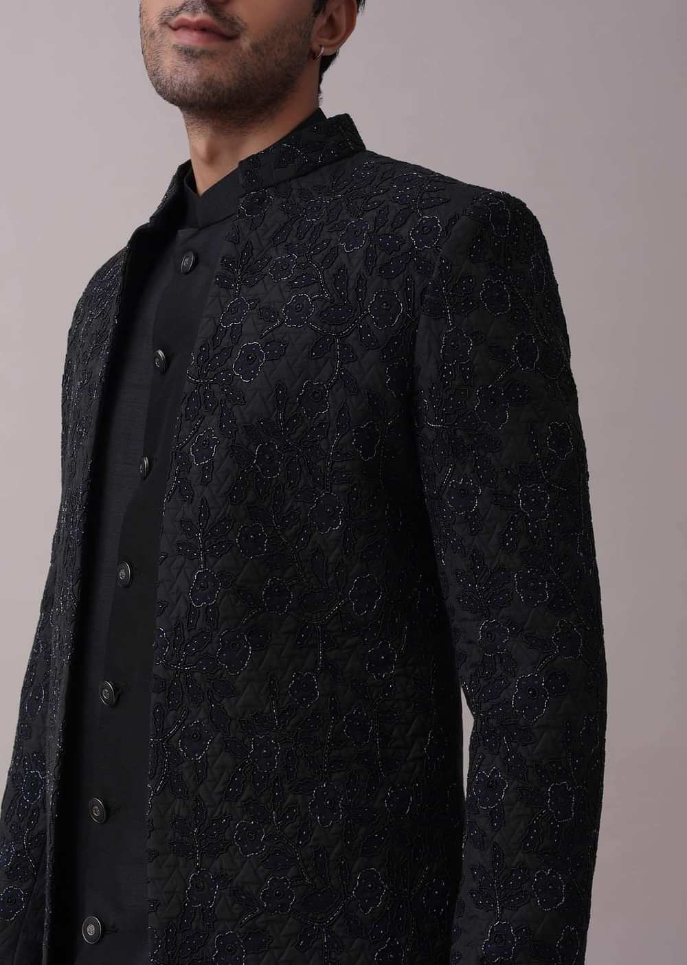 Black Indowestern Achkan Jacket Set In Silk With Moti Embroidery