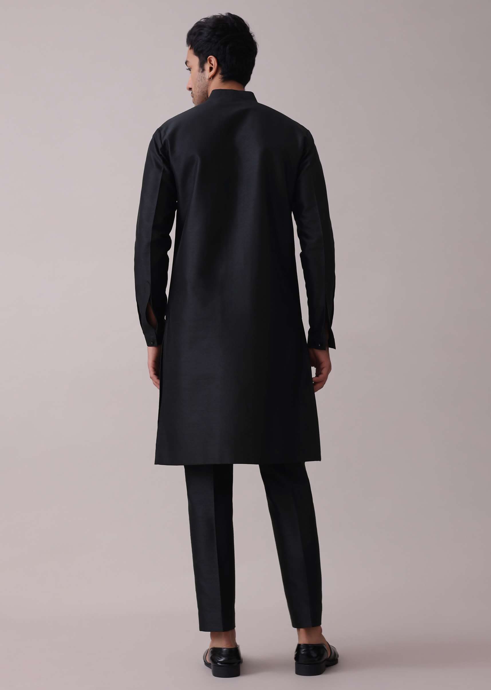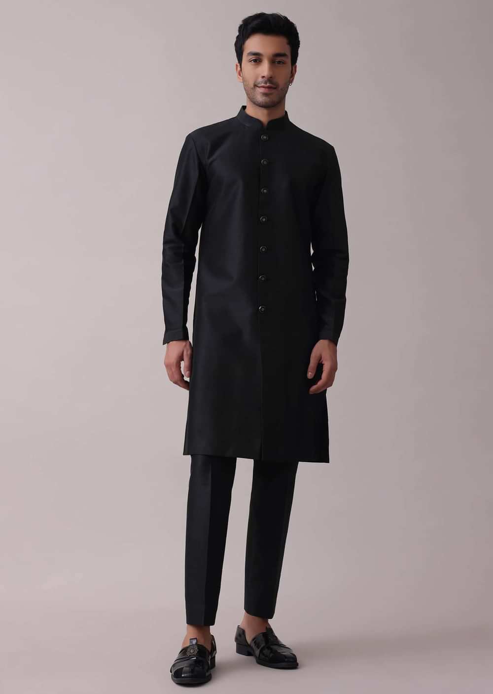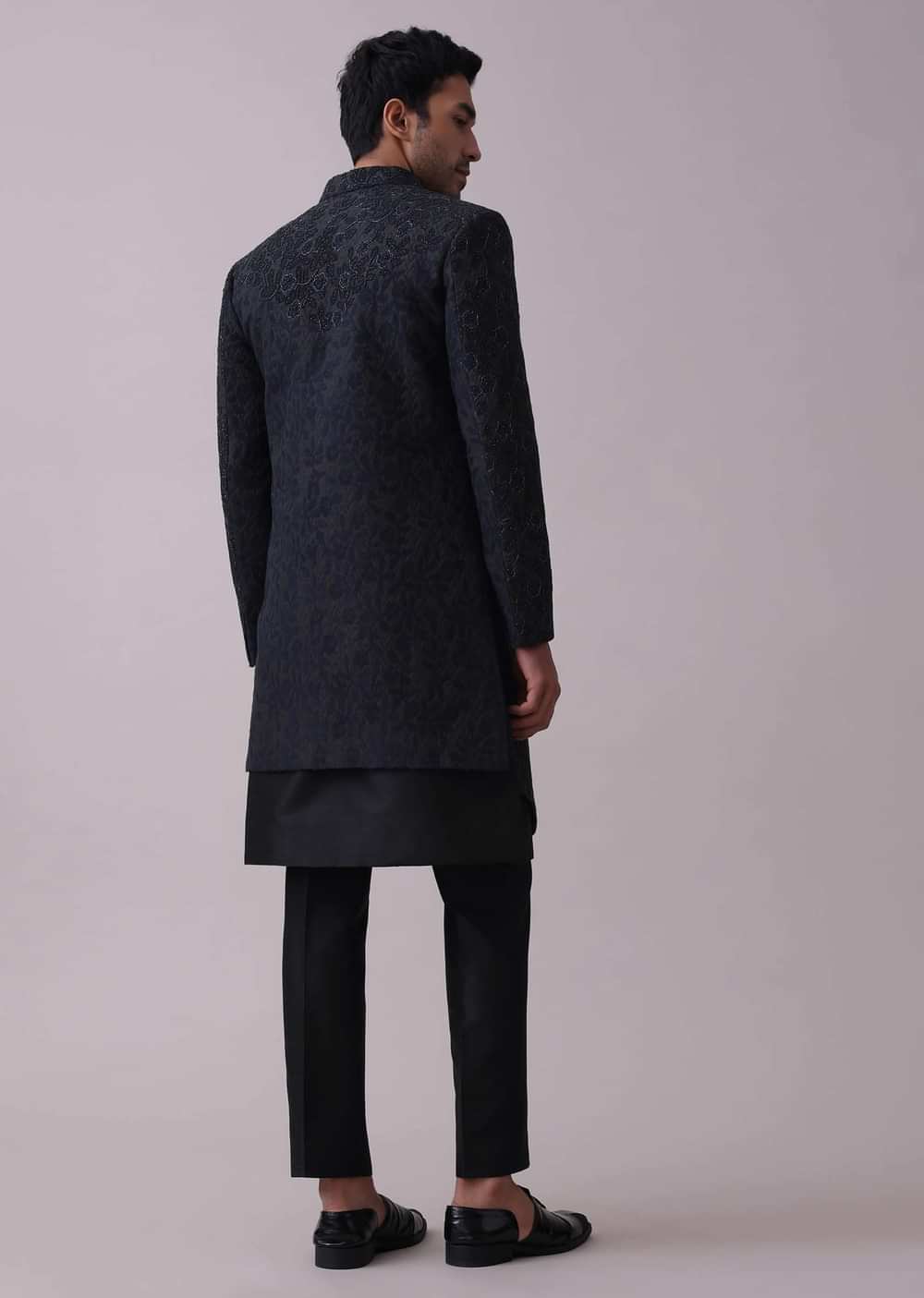 Black Indowestern Achkan Jacket Set In Silk With Moti Embroidery