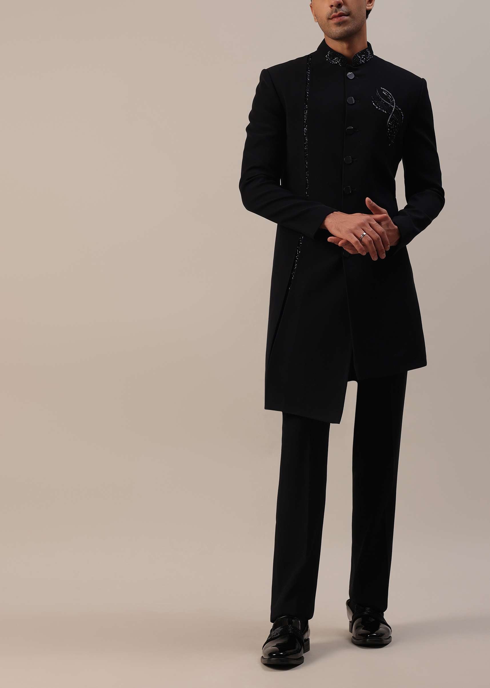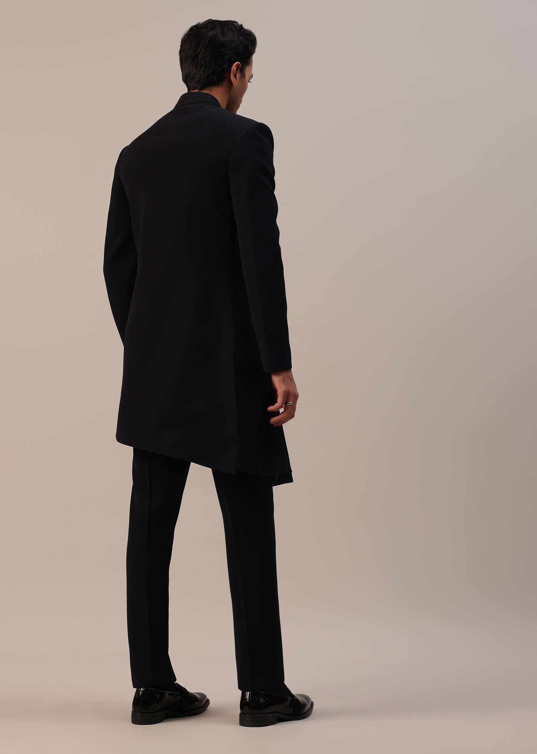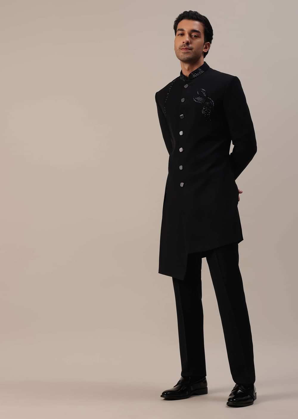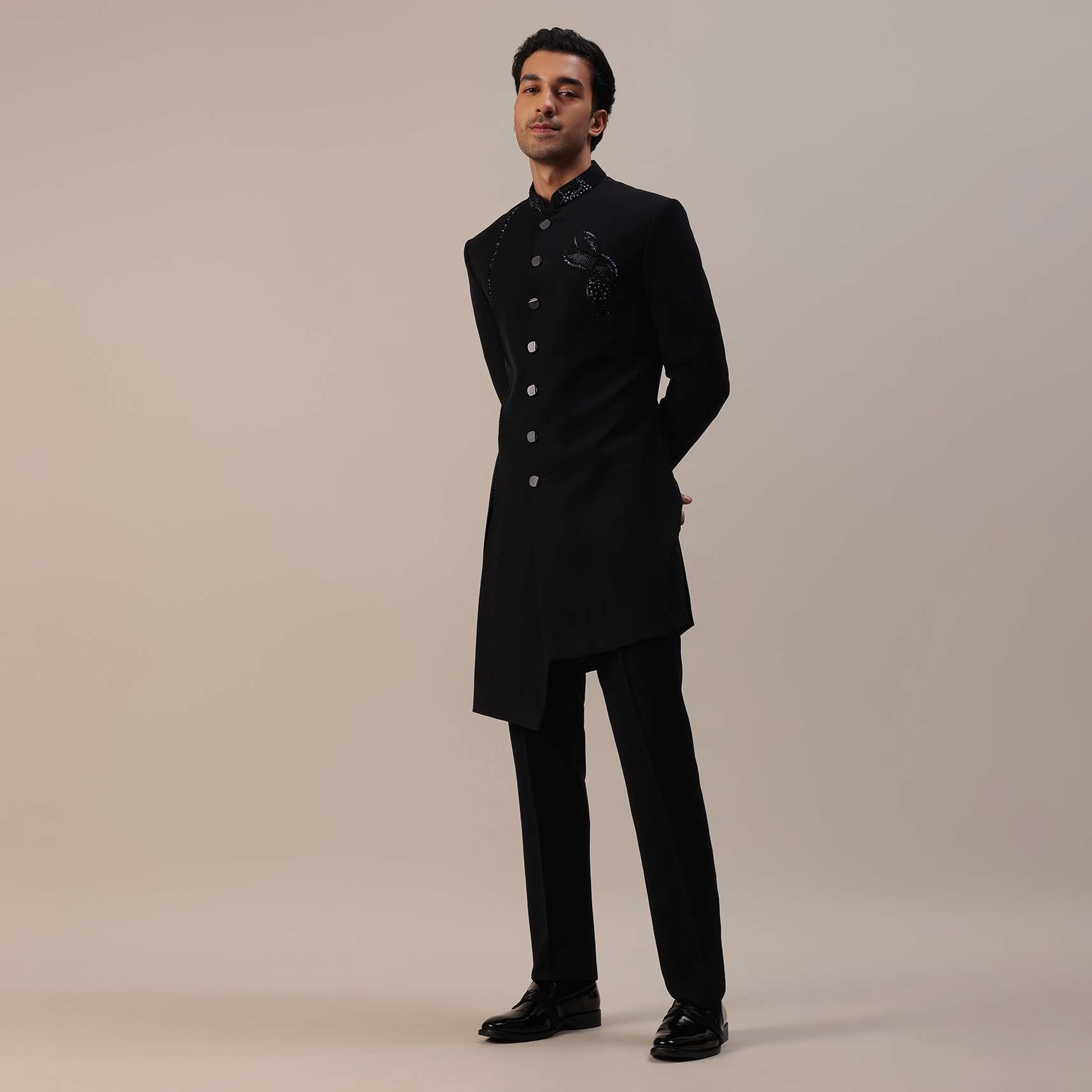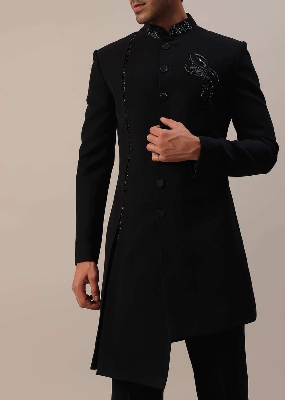 - Introducing the epitome of contemporary opulence – the black asymmetrical Indowestern in exquisite suiting fabric.
