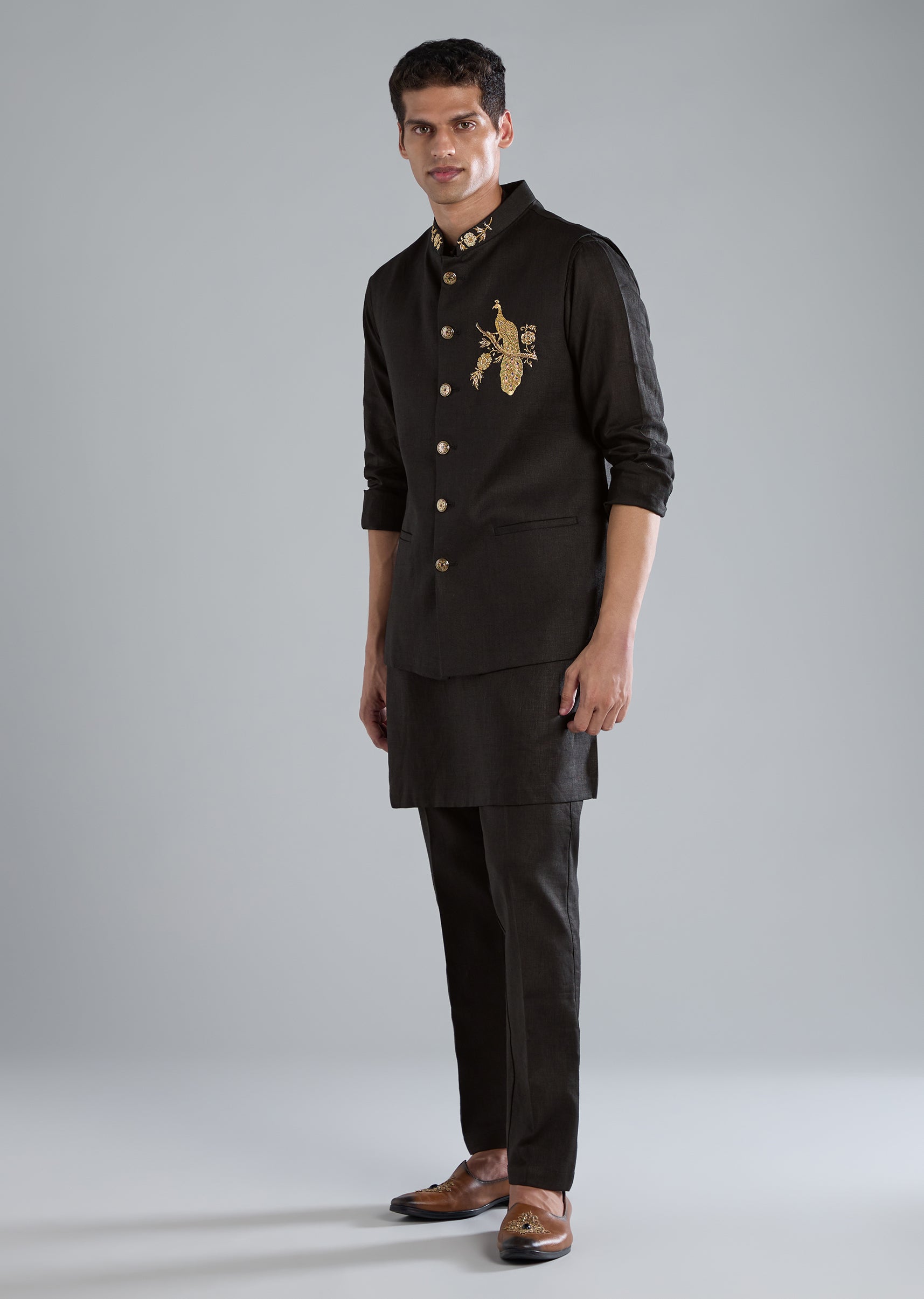 Elegant and impactful, this black kurta jacket set is crafted in pure linen and enriched with intricate zardosi hand work, making it ideal for festive nights, sangeet celebrations, and wedding... More Product Details
