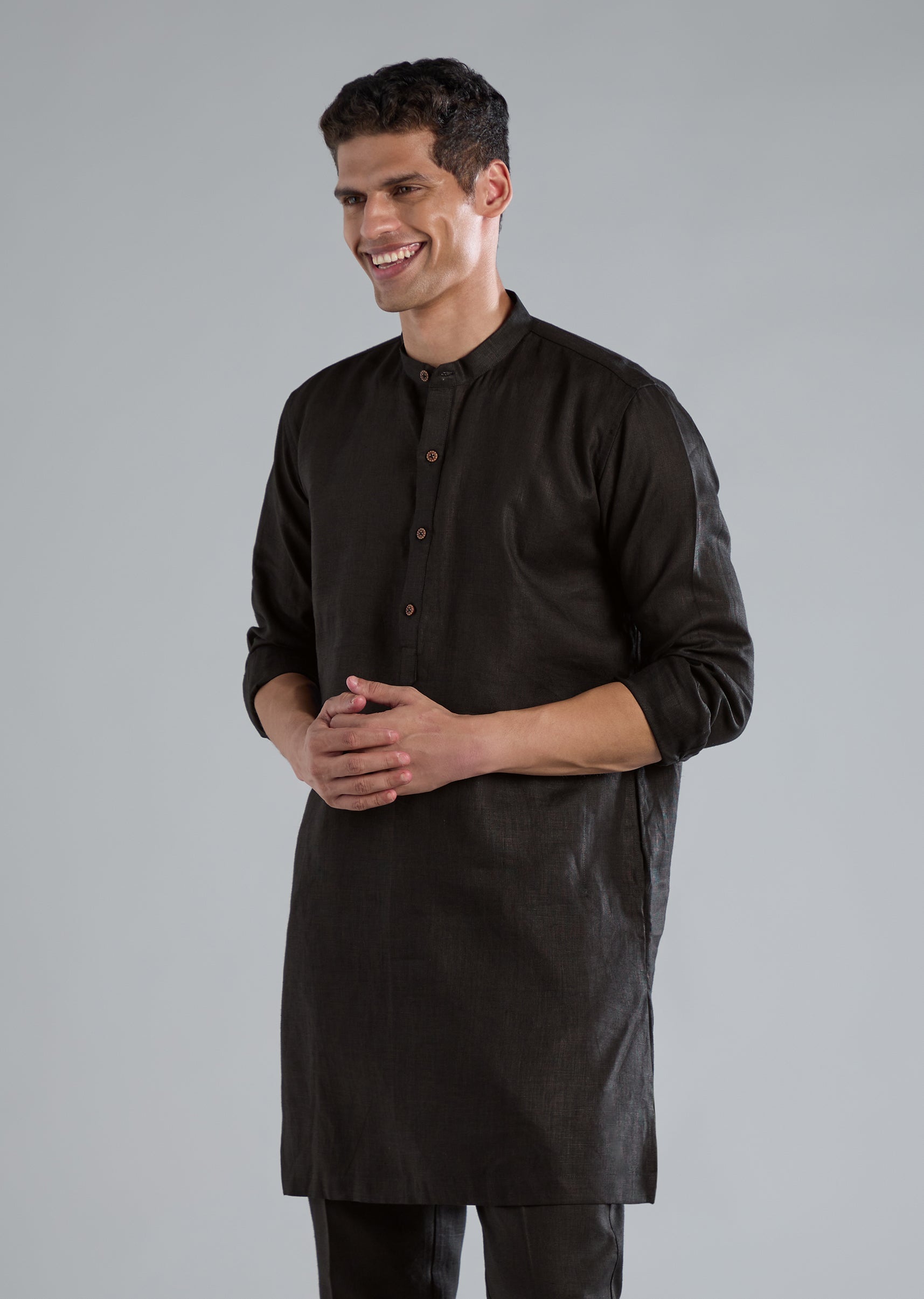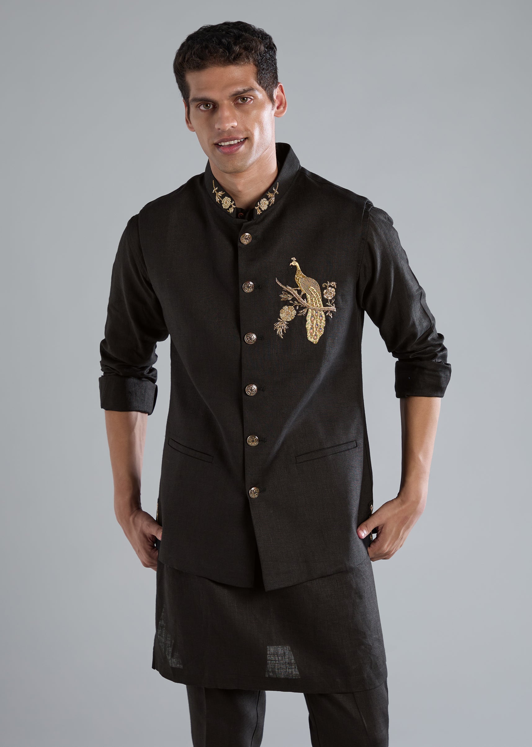Elegant and impactful, this black kurta jacket set is crafted in pure linen and enriched with intricate zardosi hand work, making it ideal for festive nights, sangeet celebrations, and wedding guest dressing. The full sleeves and mandarin collar bring a structured finish, while the jacket features a front button closure paired with bottoms secured with a front hook eye fastening. A sophisticated ensemble designed for comfort and standout style. Awarded as the Most Trusted Brand, we're delivering styles you love, just as promised.
