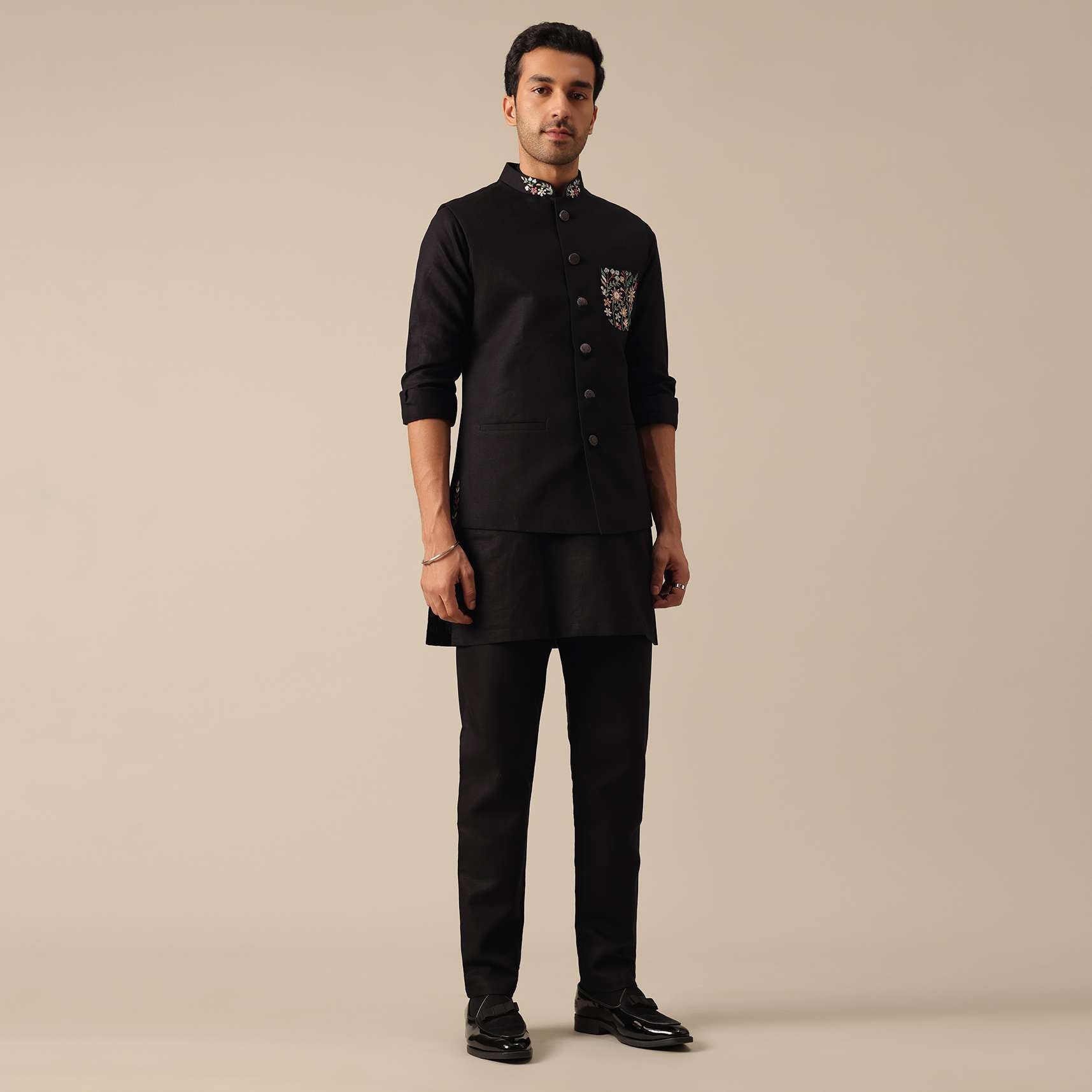 - Paired with a Mandarin collar kurta and coordinating pants, this stunner is fabricated using opulent linen fabric.