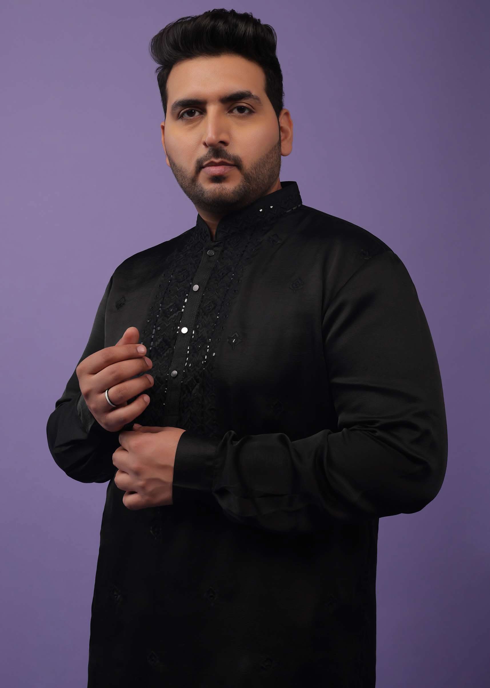 Black Lucknowi Embroidered Kurta In Mini Silk