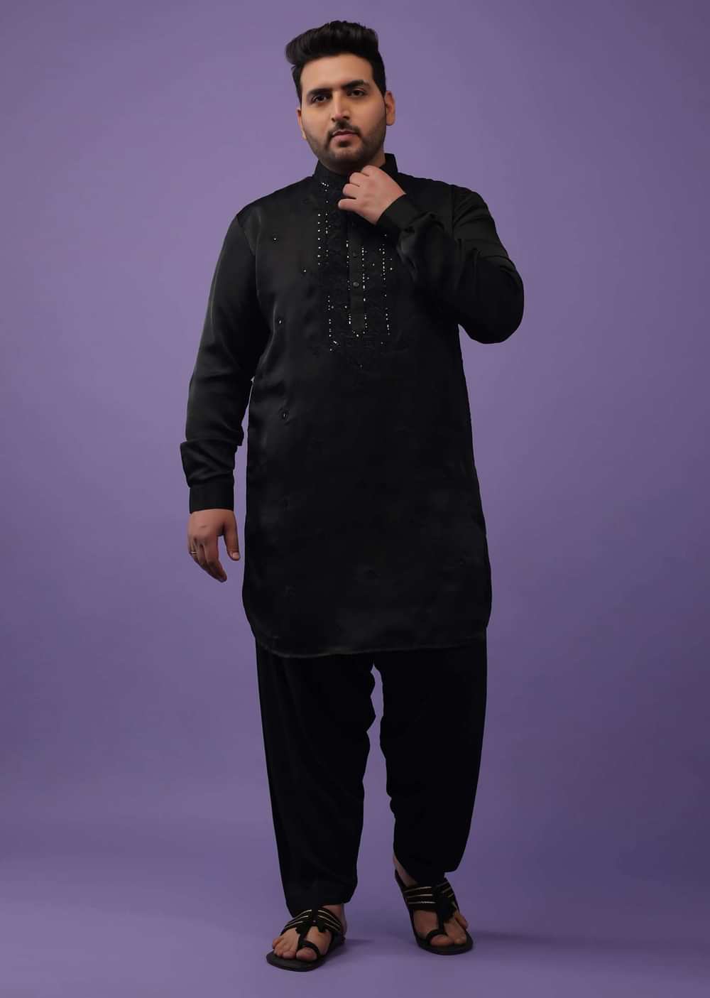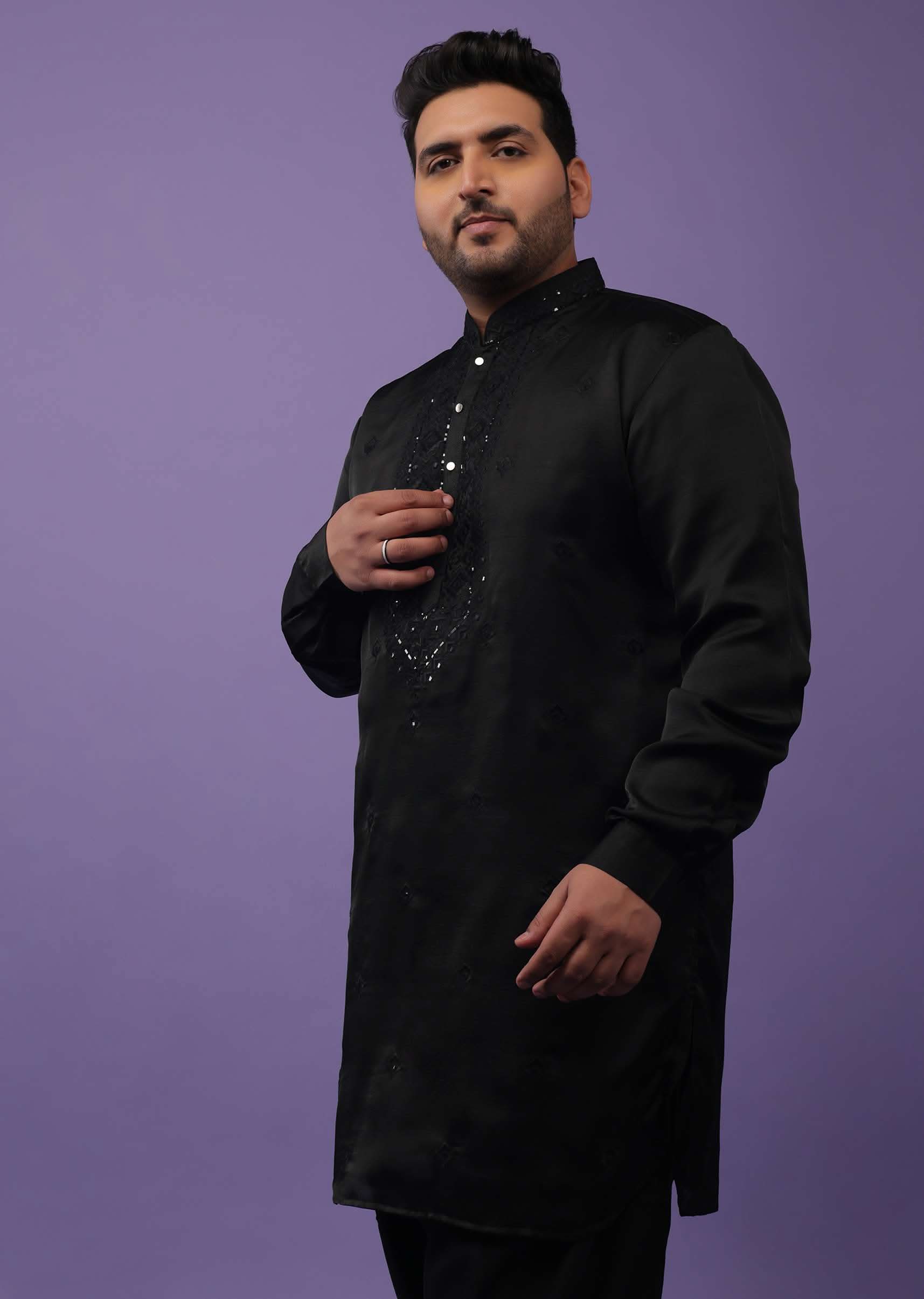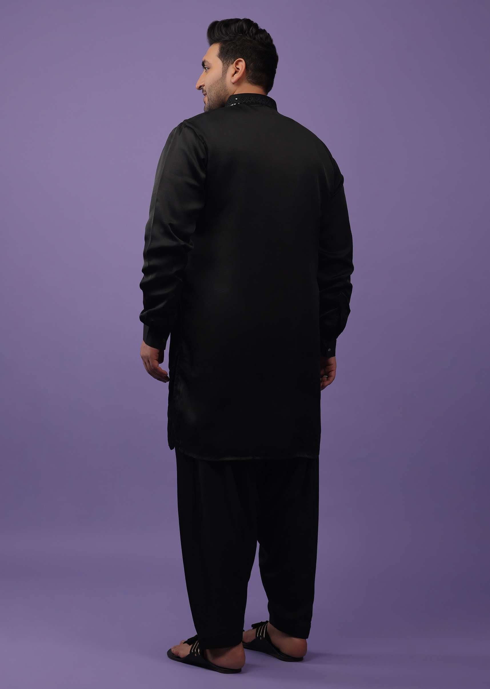 - Festive Jet Black Kurta set in handloom silk suiting fabric.