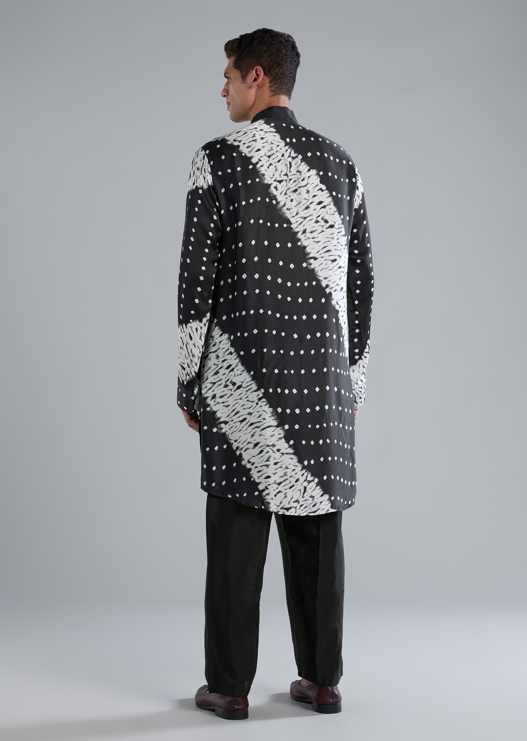 Modern yet deeply rooted, this black kurta set showcases handmade bandhani and shibori inspired prints on breathable modal fabric. The full sleeve structure with a mandarin collar keeps the look... More Product Details
