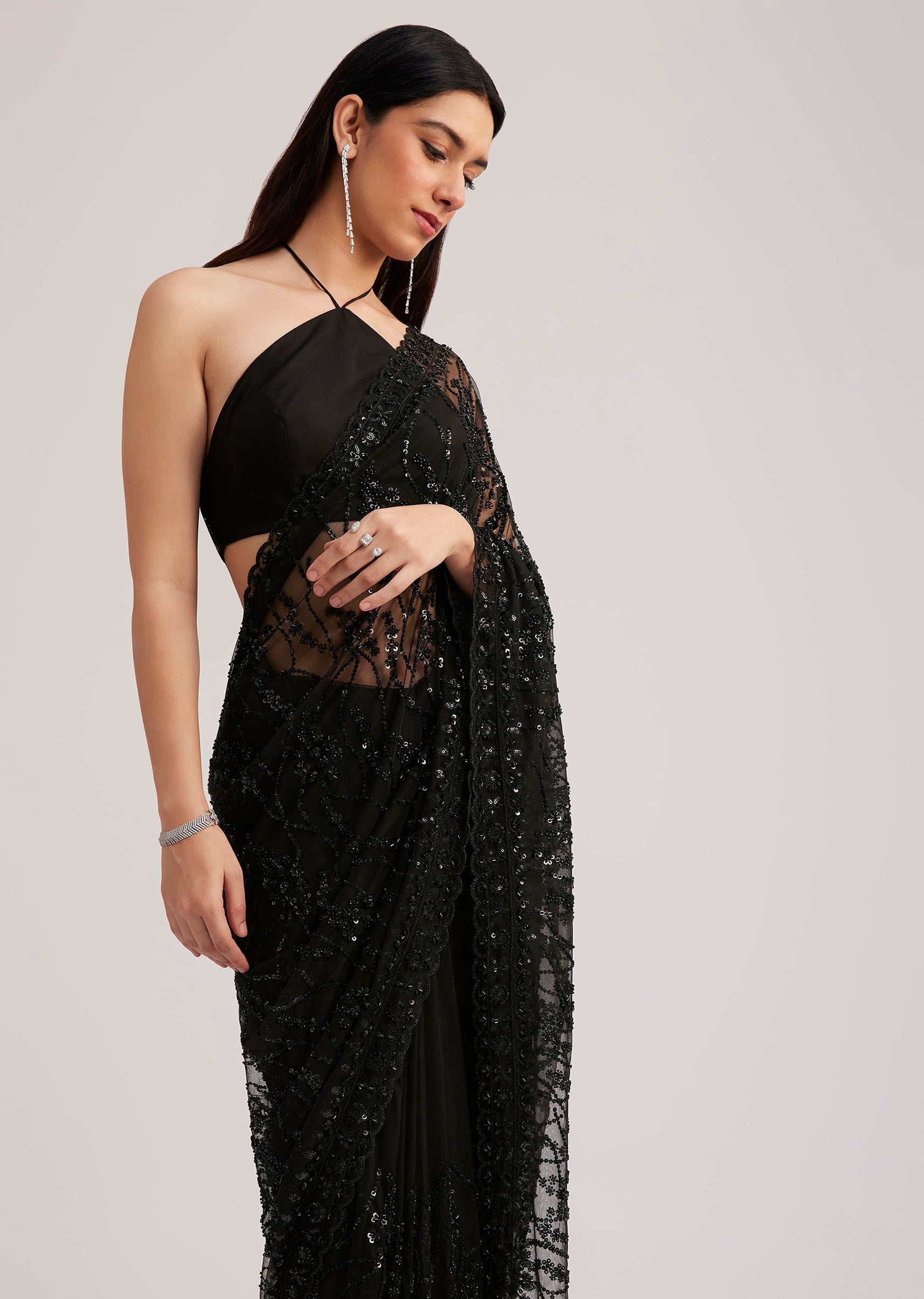 Make a statement at your next cocktail party or evening gala with this black net saree, exquisitely embroidered with sequins and stones. The design strikes the perfect balance between sophistication and glamour, making it an ideal choice for festive celebrations, wedding receptions, cocktails, party and high-end social events. Pair it with bold accessories to complete your look. Awarded as the Most Trusted Brand, we're delivering styles you love, just as promised.