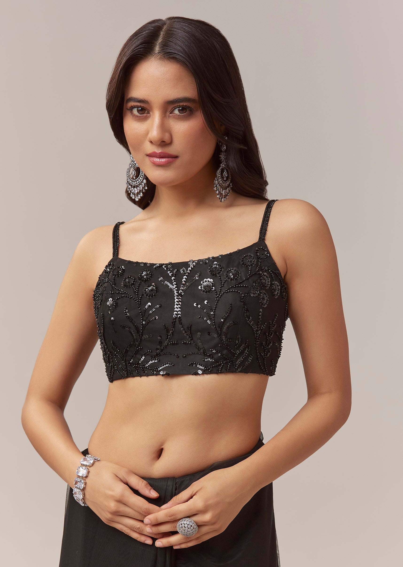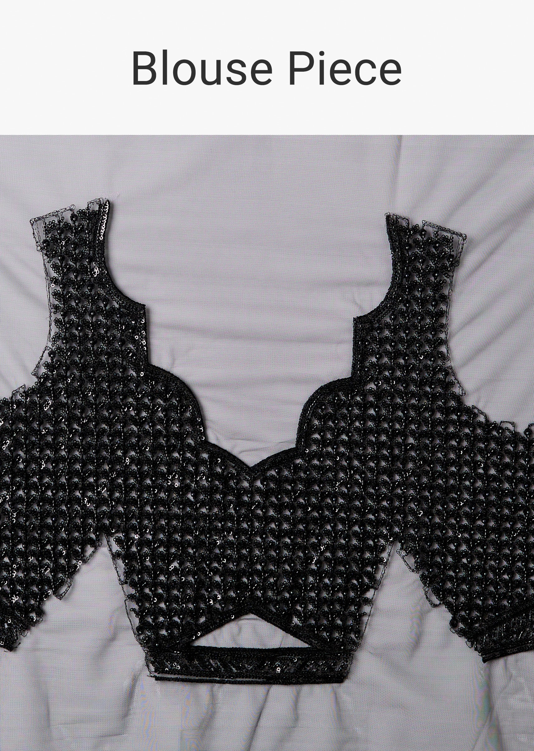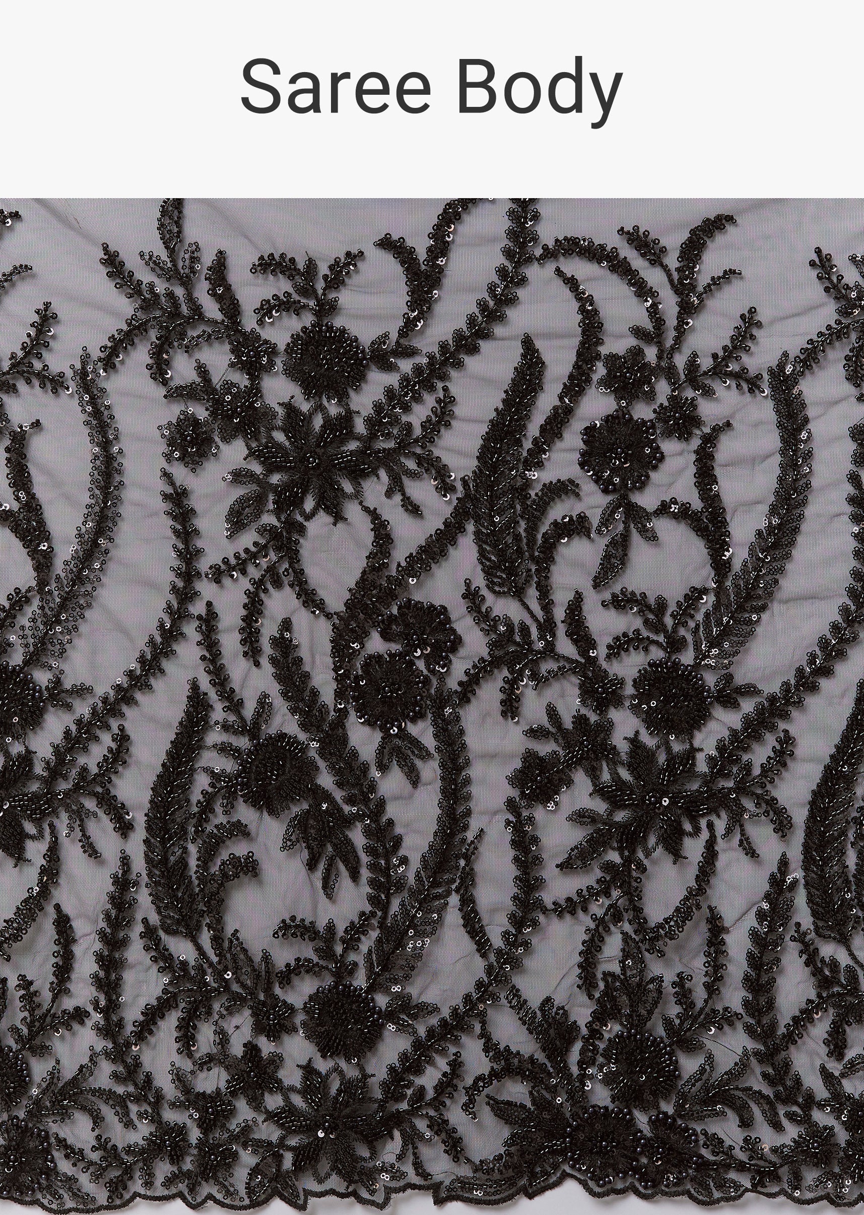This black net saree exudes contemporary elegance perfect for cocktail parties bridesmaids and wedding guest looks. The sheer net base is adorned with all over floral jaal embroidery featuring cutdana sequins and beads creating a striking shimmer and textured depth. The border is finished with intricate cutwork enhancing the saree’s sophisticated appeal. It comes with an unstitched heavily embroidered blouse allowing you to tailor it to your preferred style for a flawless and statement worthy look. Awarded as the Most Trusted Brand, we're delivering styles you love, just as promised.