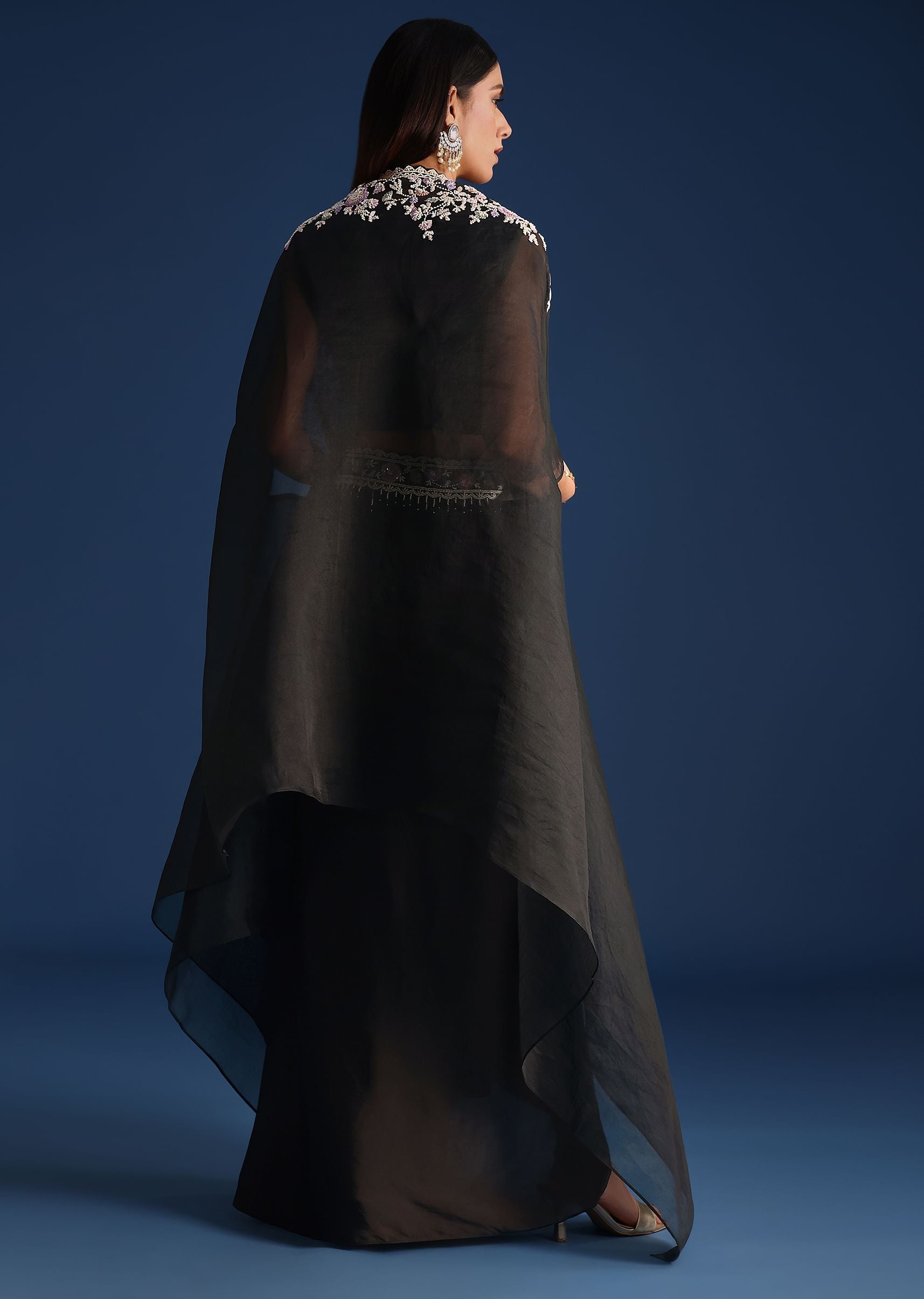 Black Organza Jacket With Embroidered Crop Top And Draped Skirt