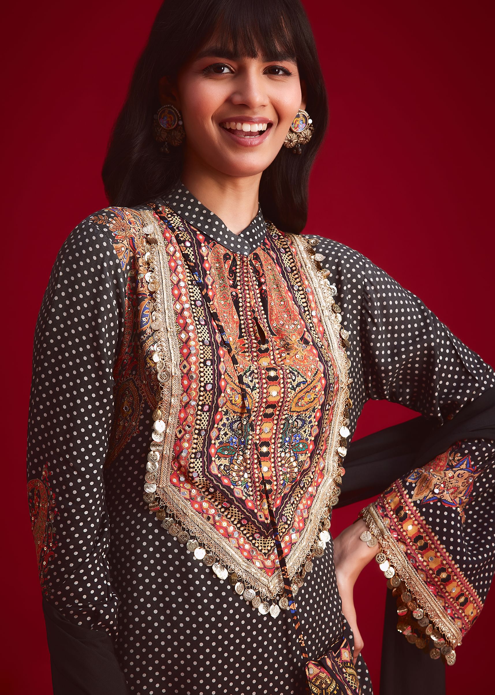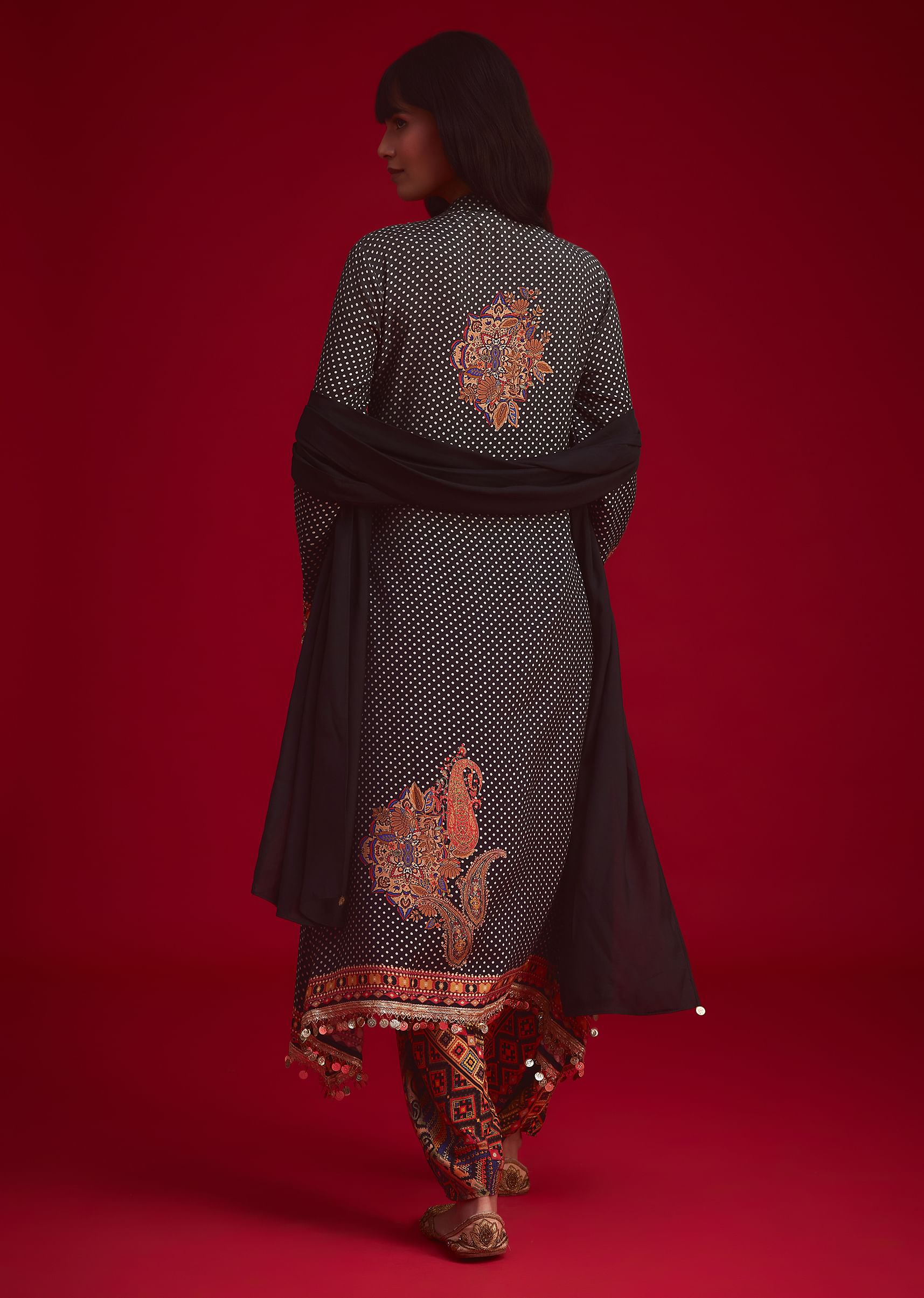 Add a playful touch to your festive wardrobe with this Black polka dot printed kurta and Patiala set. Adorned with mirror, stone, and sequin work on the neckline and sleeves.... More Product Details