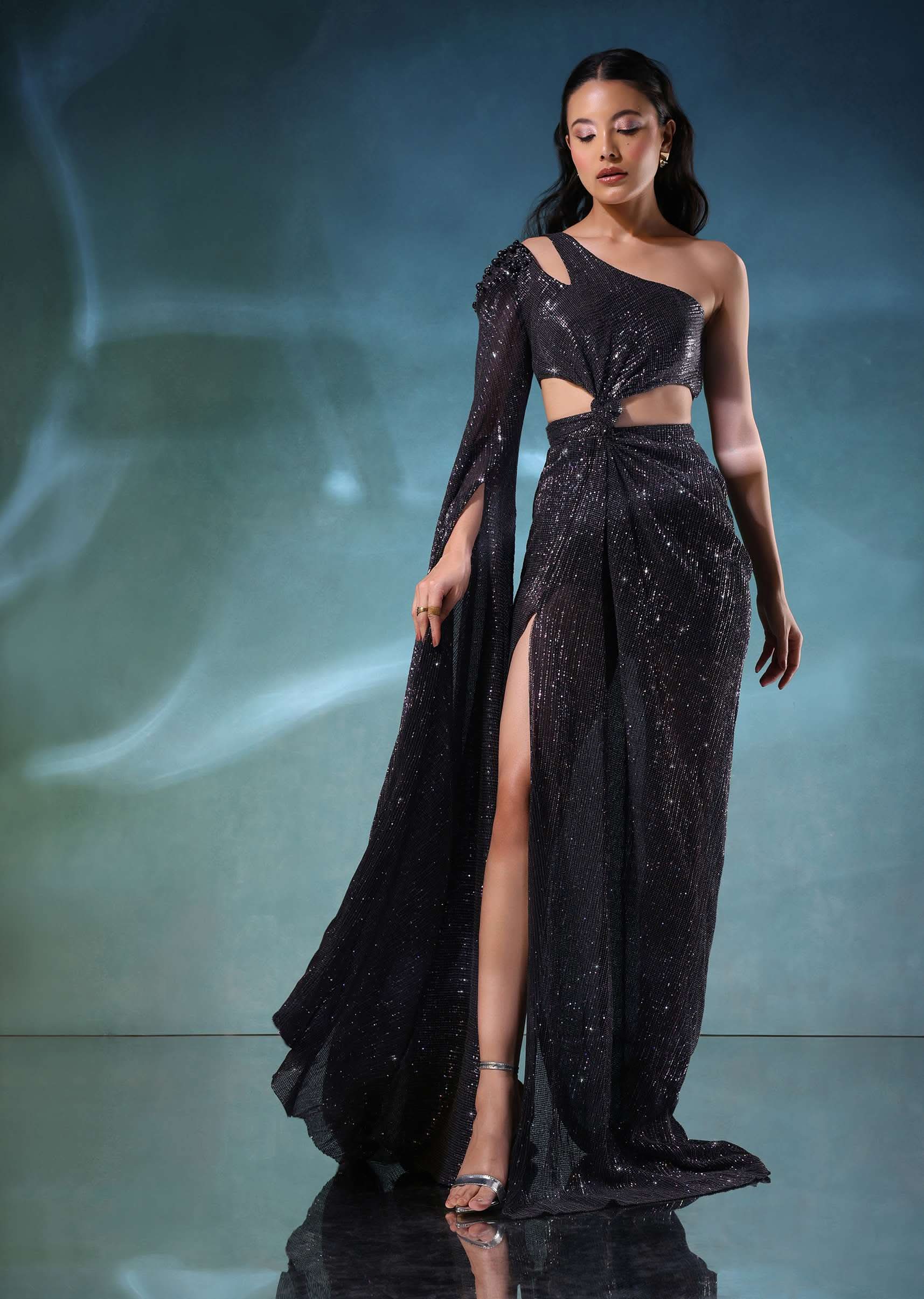 - The waist cuts and alluring side slit adds a touch of dazzle to the overall design.