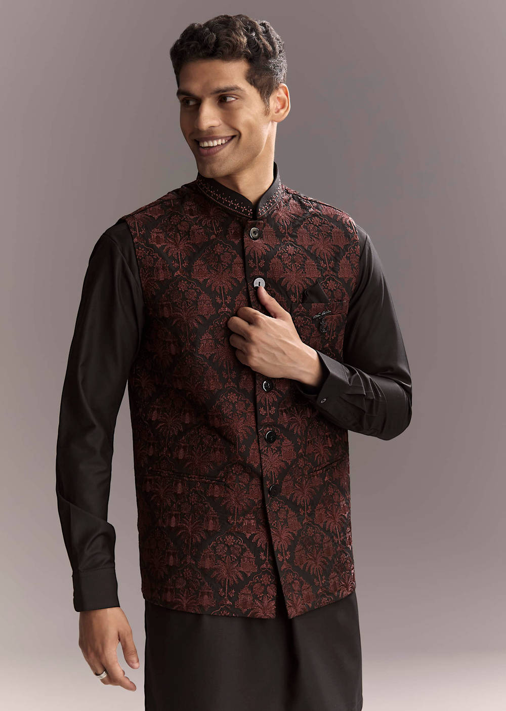 Fit Tips:The jacket skims the torso with defined shoulders, and the men’s kurta beneath falls straight and breathable for easy motion.