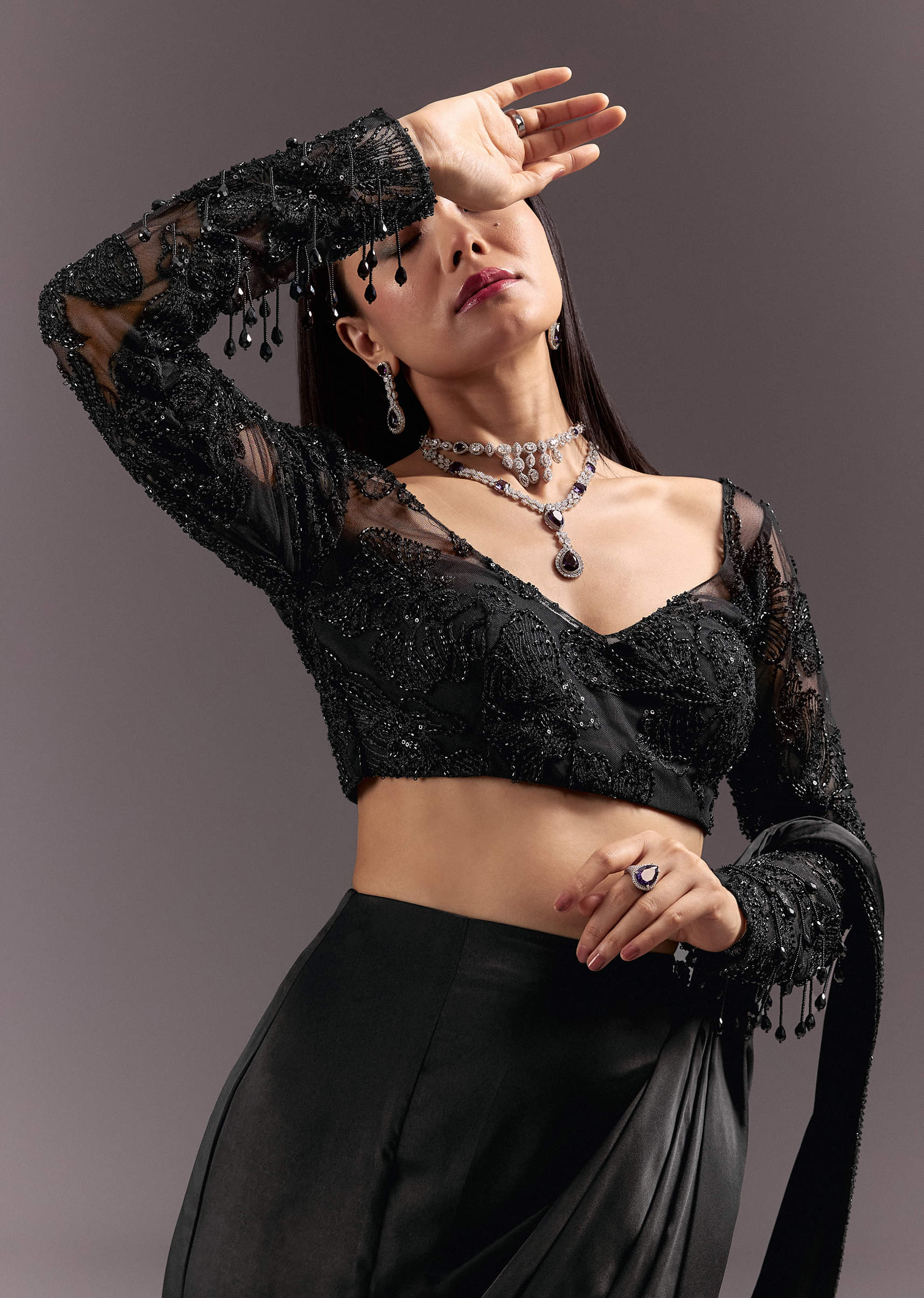 This full sleeve black ensemble brings a strong structured look. Cut dana embroidery shimmers on the tailored silhouette. The slit adds movement to this bold pre-drape saree. Ideal for fashion-forward parties. Awarded as the Most Trusted Brand, we're delivering styles you love, just as promised.