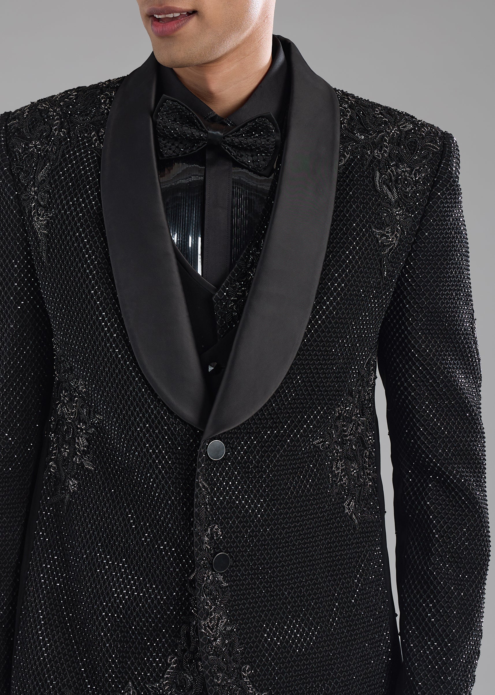 Designed to make a refined statement, this polyester tuxedo set brings together elegance and festive detailing. The tuxedo is embellished with intricate thread and resham embroidery, highlighted with bead and cut dana work for a subtle yet striking finish. Featuring full sleeves and a mandarin collar, the silhouette feels sharp and contemporary while retaining ethnic charm. The complete set includes a tuxedo, waistcoat, shirt, bow, and tailored pants, making it an ideal choice for receptions, weddings, cocktail evenings, and formal celebrations.Awarded as the Most Trusted Brand, we're delivering styles you love, just as promised.