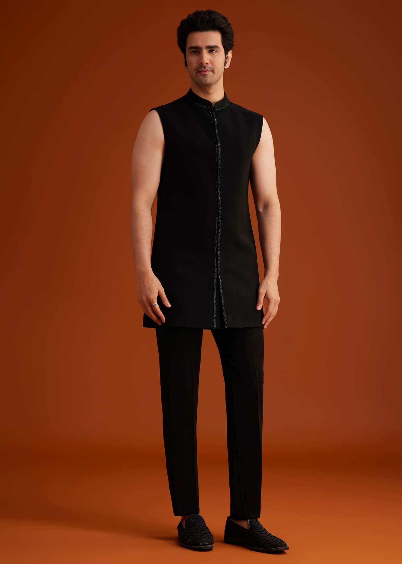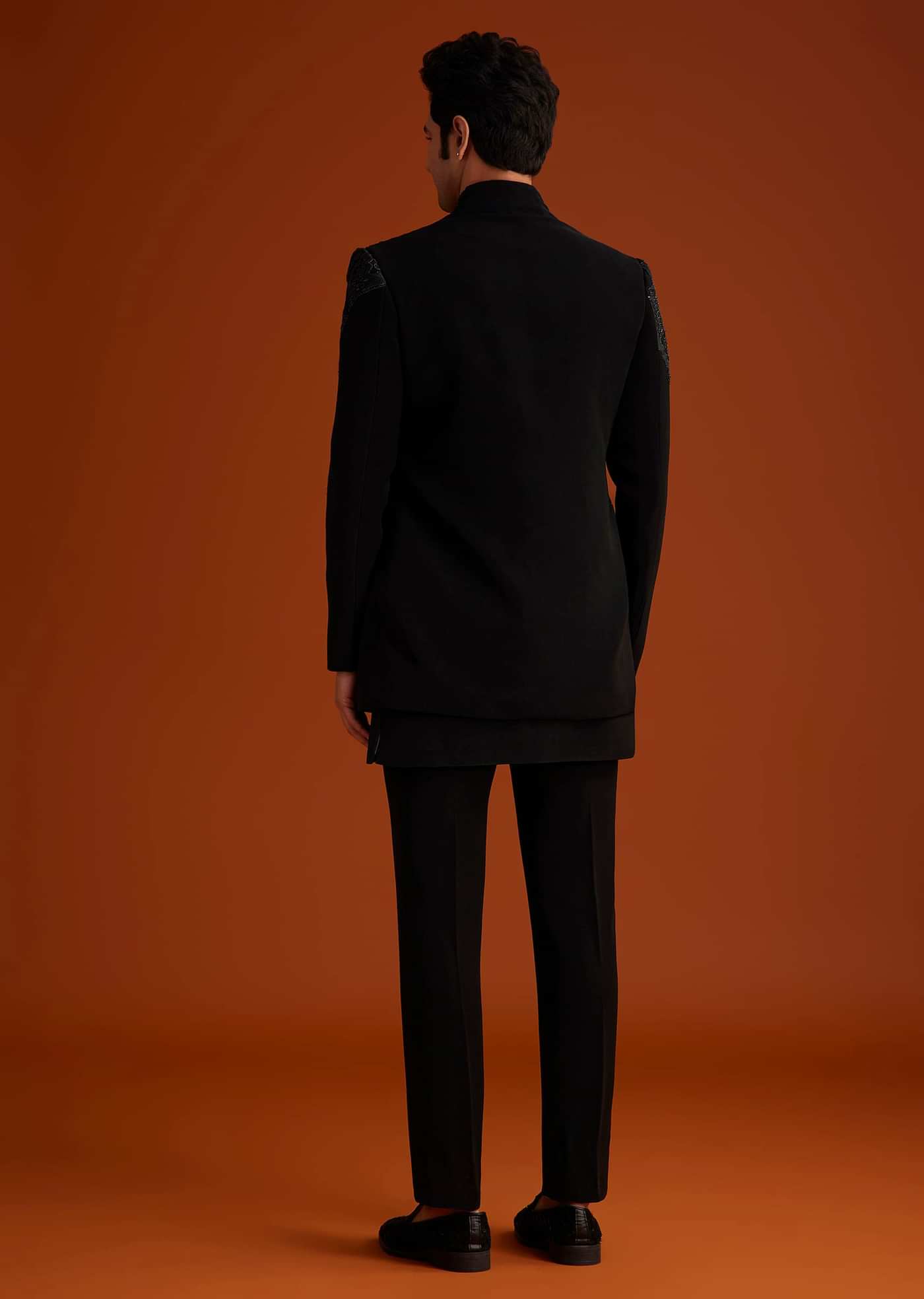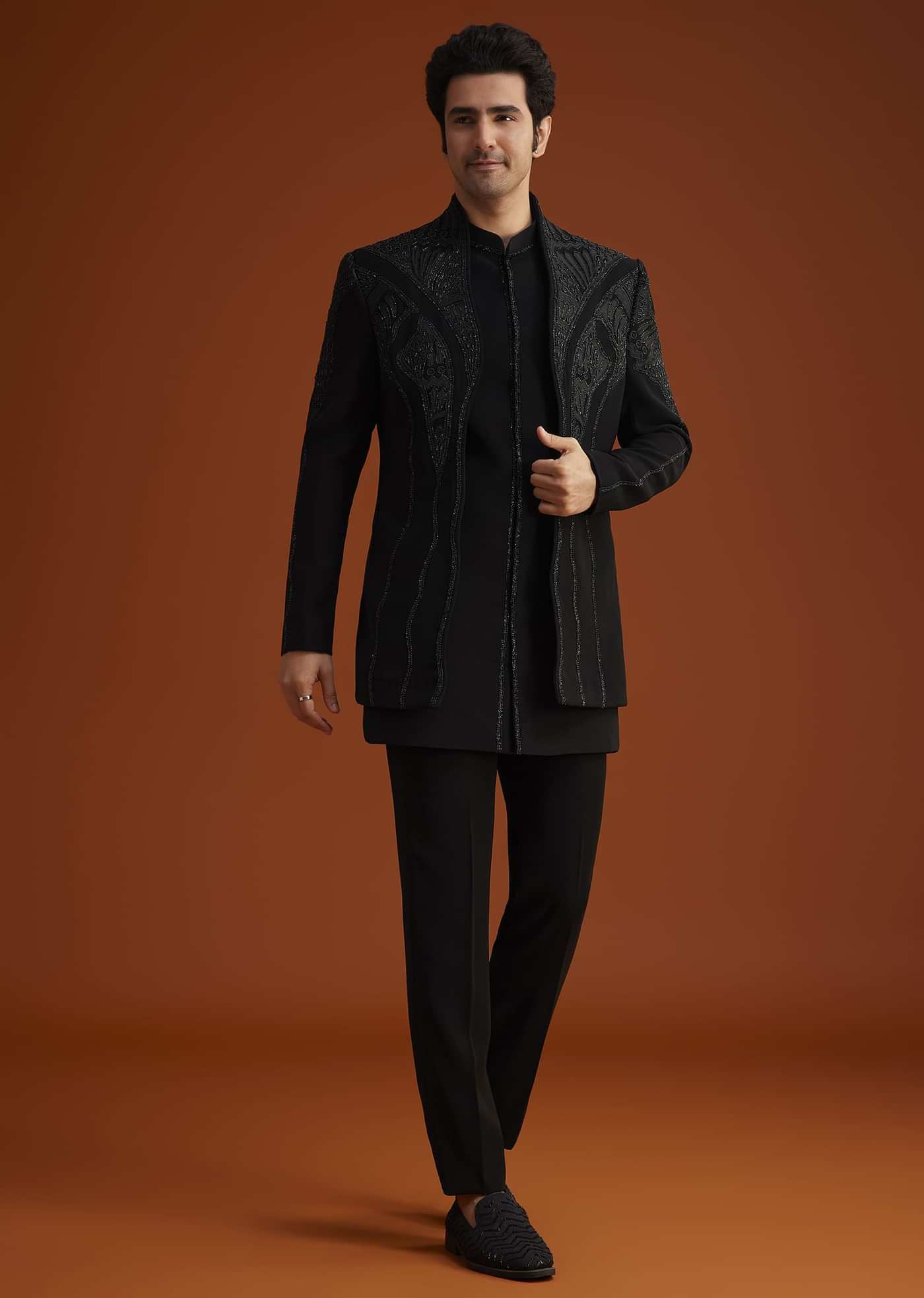 • Redefine power dressing with this sharp black Indo-western set featuring intricate tonal embroidery and subtle sequin highlights.