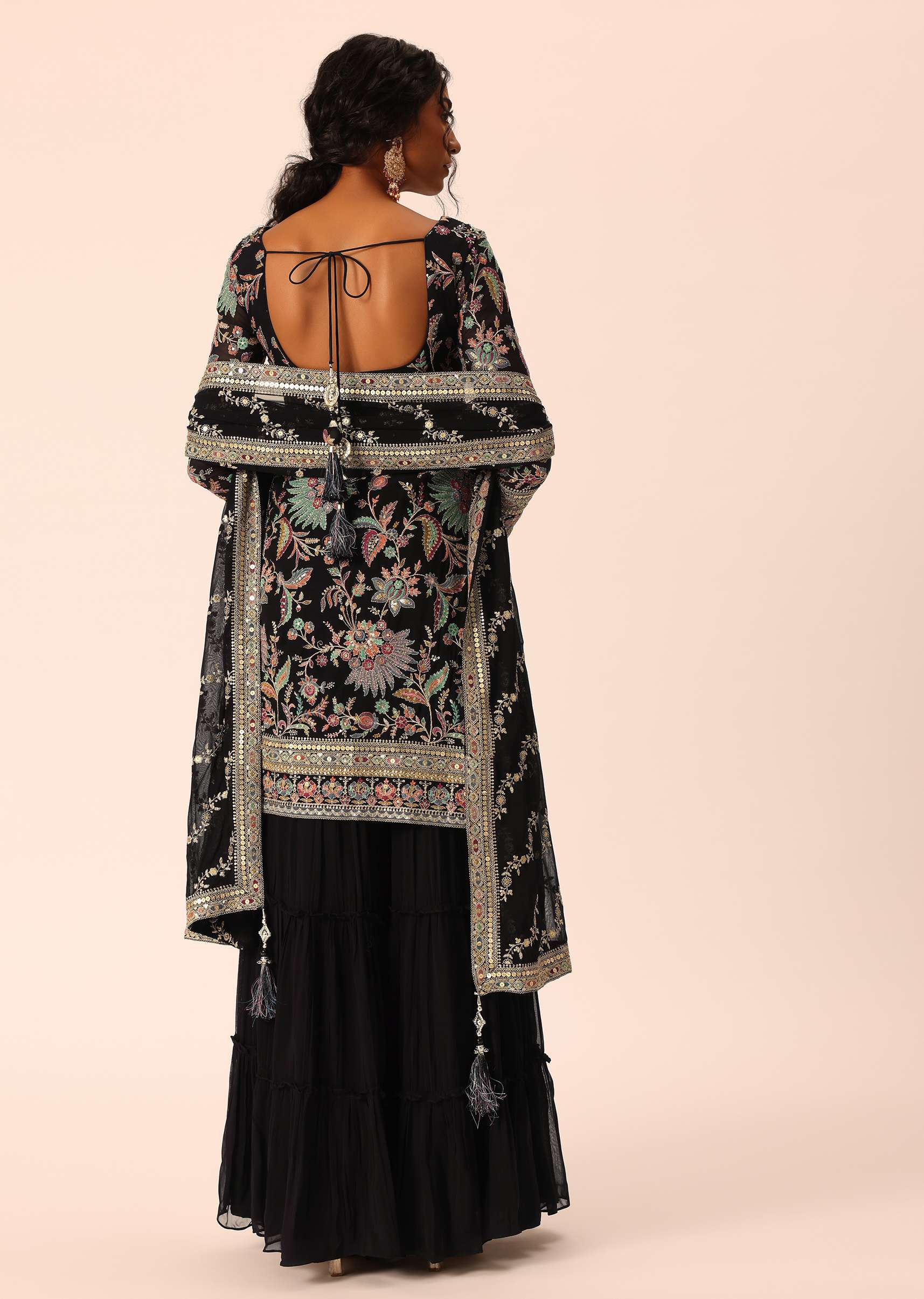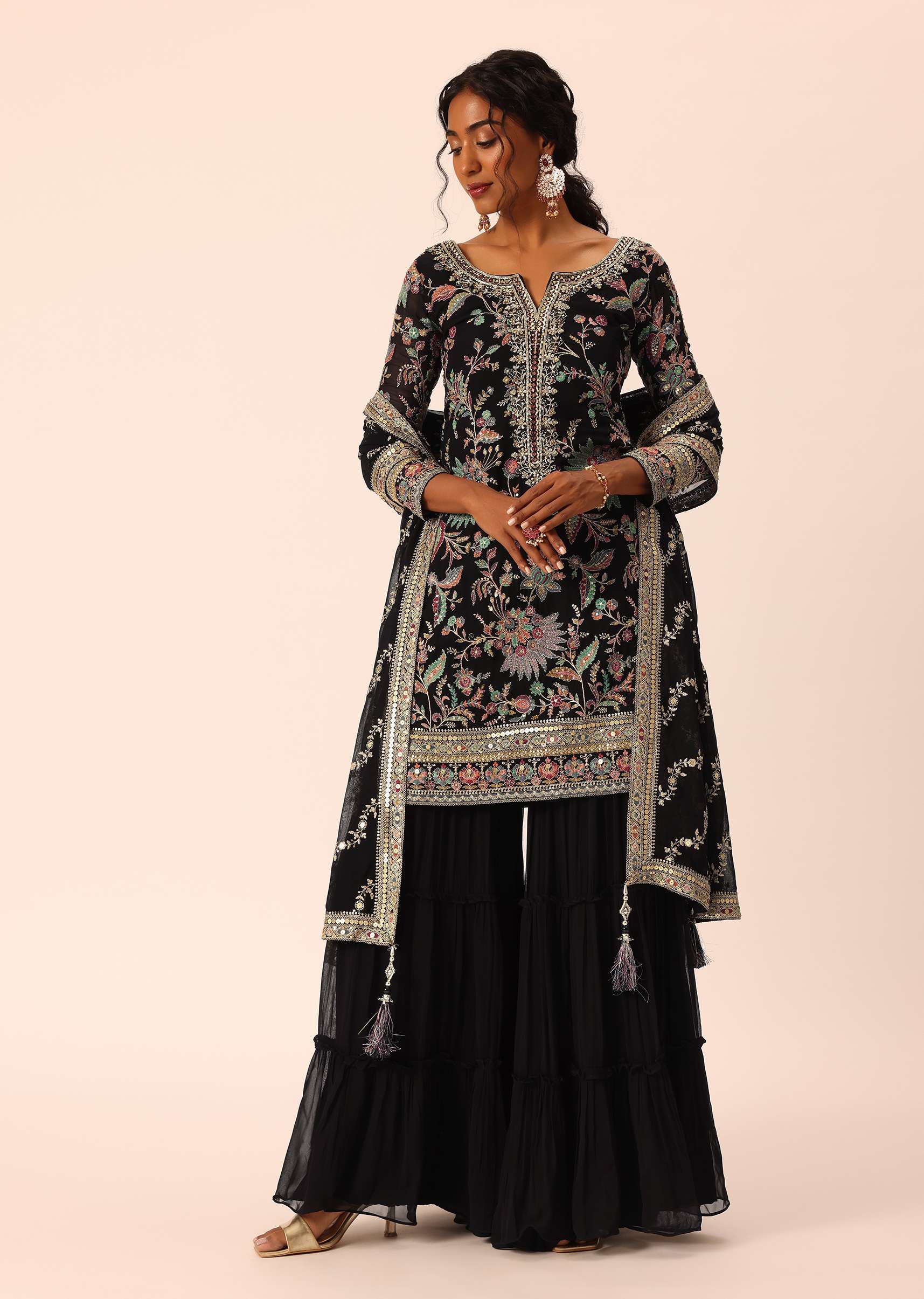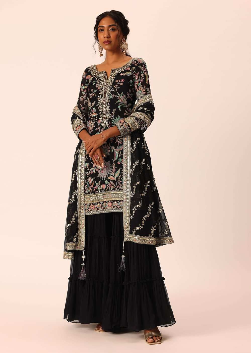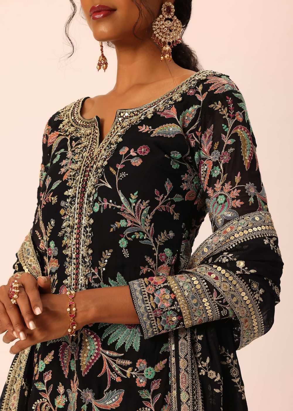 - Crafted in georgette, the kurta showcases intricate sequin, resham thread, zari, mirror, and cutdana work.