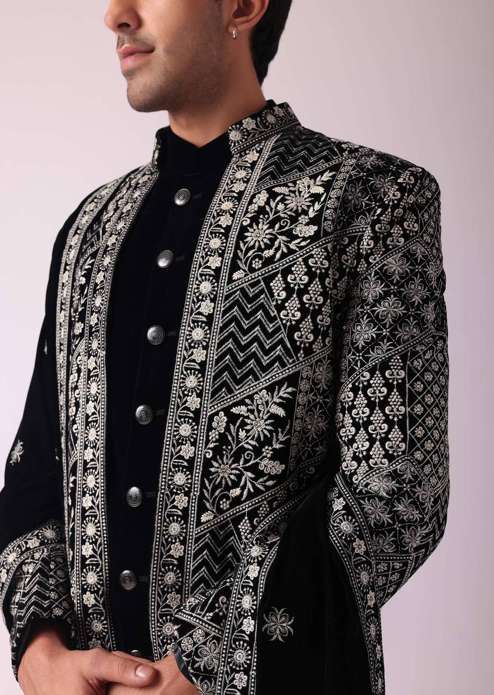 - Tailored from luxe velvet, this sherwani set is sure to garner the attention of many.