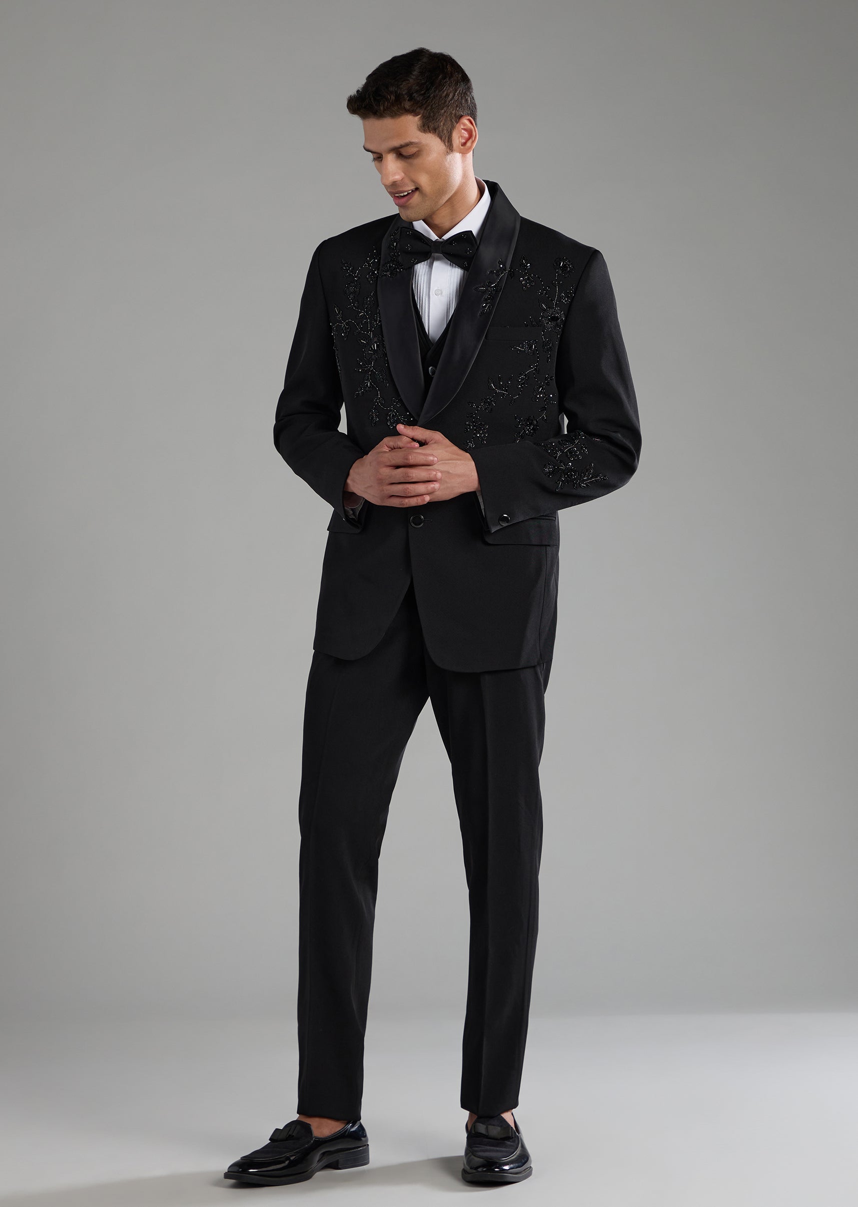 Black Silk Cutdana Embellished Tuxedo Set with Bow Tie