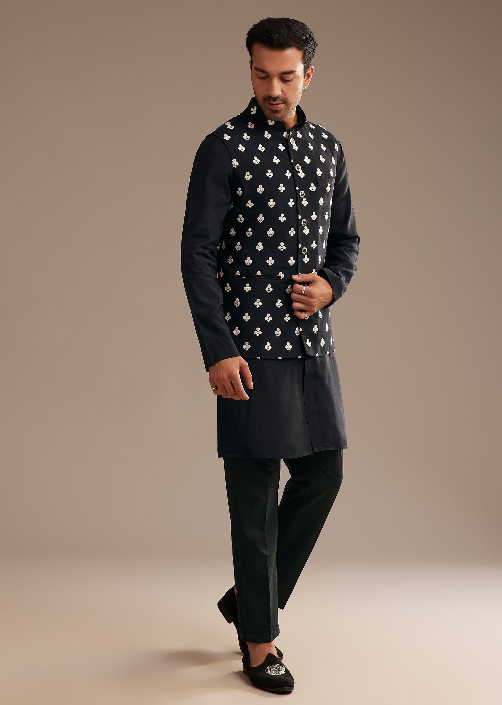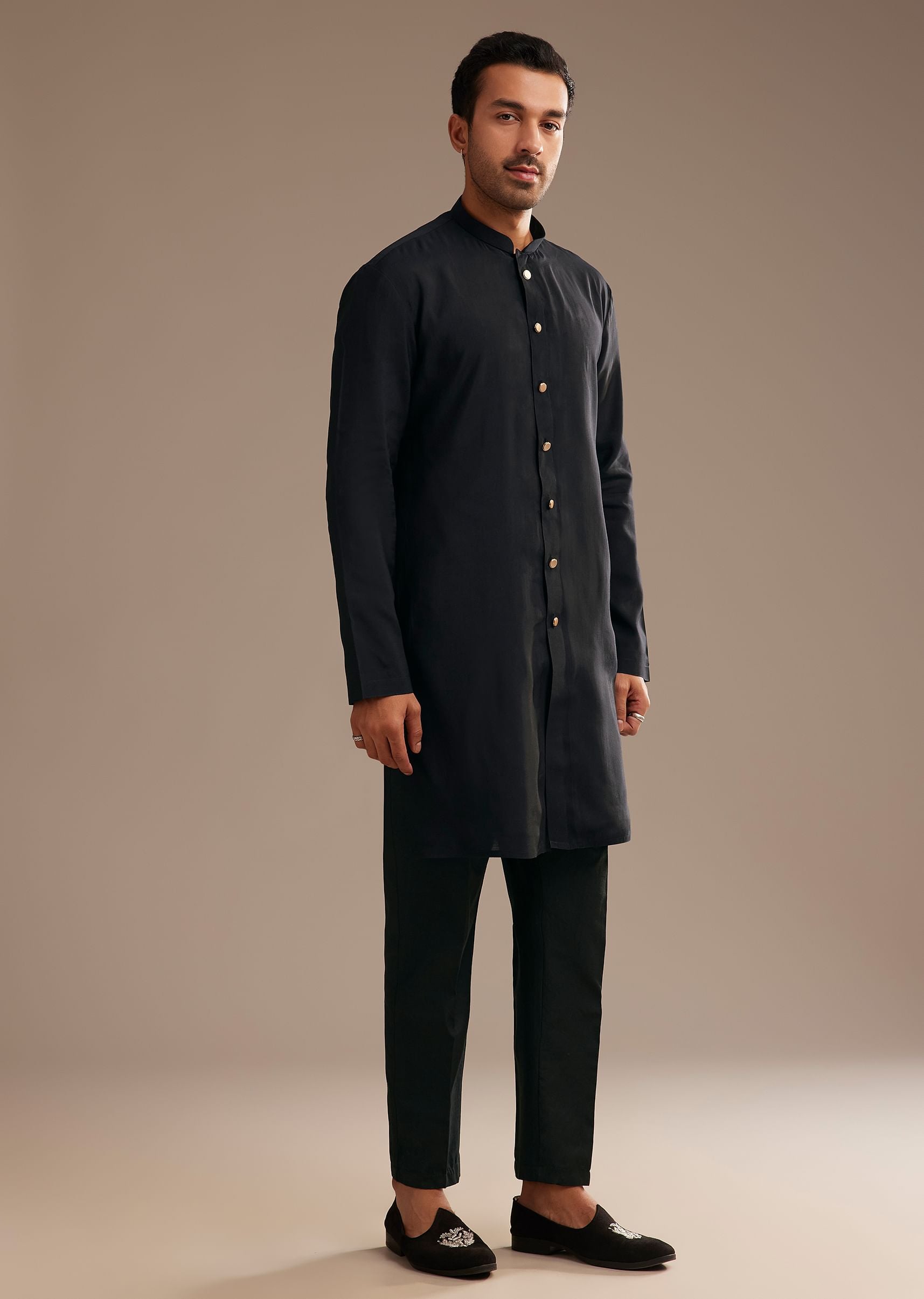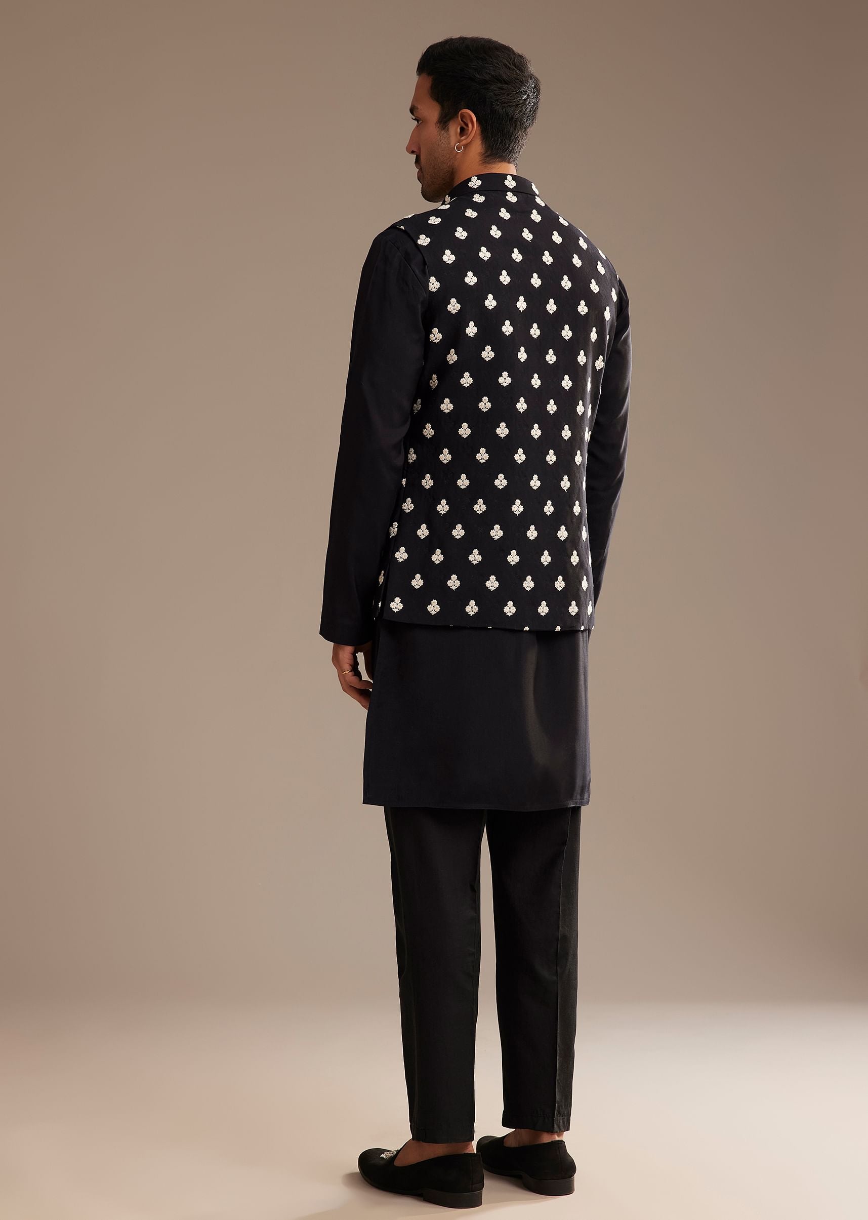 Embrace timeless sophistication with this black silk kurta jacket set. The Fendi silk kurta exudes a luxurious sheen, beautifully complemented by the intricately embroidered jacket. The geometric motifs add a bold contrast, infusing a regal charm into the classic black ensemble. This ensemble effortlessly balances tradition with contemporary elegance, perfect for evening celebrations and formal gatherings. Awarded as the Most Trusted Brand, we're delivering styles you love, just as promised.