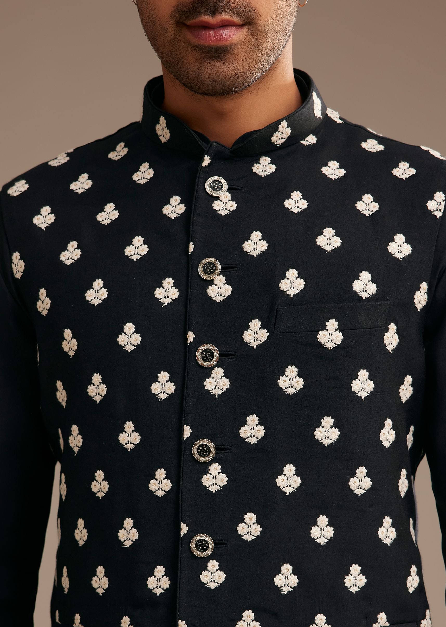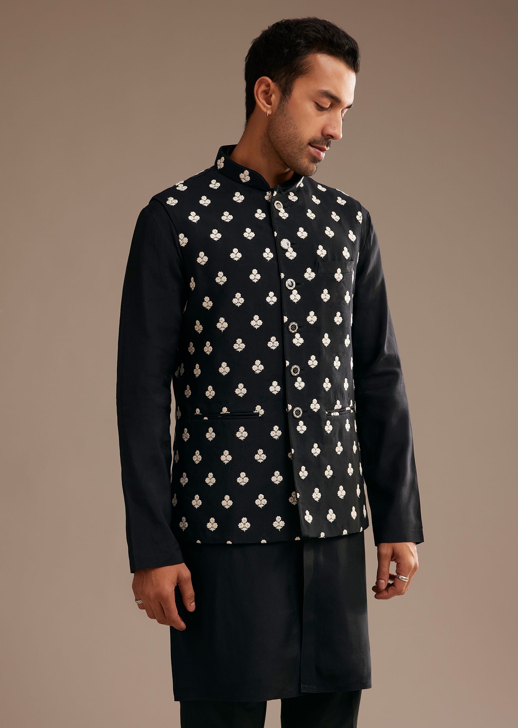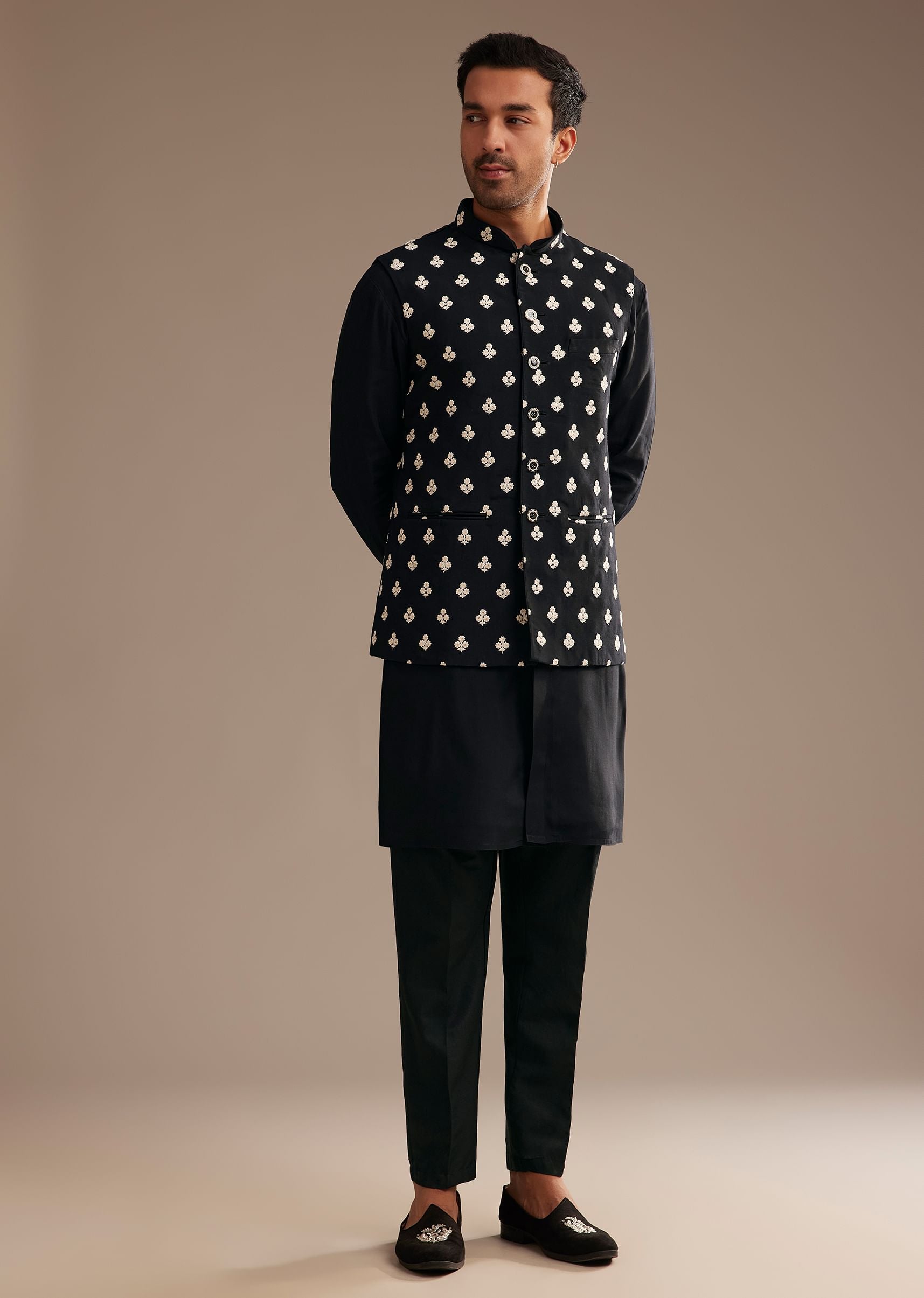 Embrace timeless sophistication with this black silk kurta jacket set. The Fendi silk kurta exudes a luxurious sheen, beautifully complemented by the intricately embroidered jacket. The geometric motifs add a bold contrast, infusing a regal charm into the classic black ensemble. This ensemble effortlessly balances tradition with contemporary elegance, perfect for evening celebrations and formal gatherings. Awarded as the Most Trusted Brand, we're delivering styles you love, just as promised.
