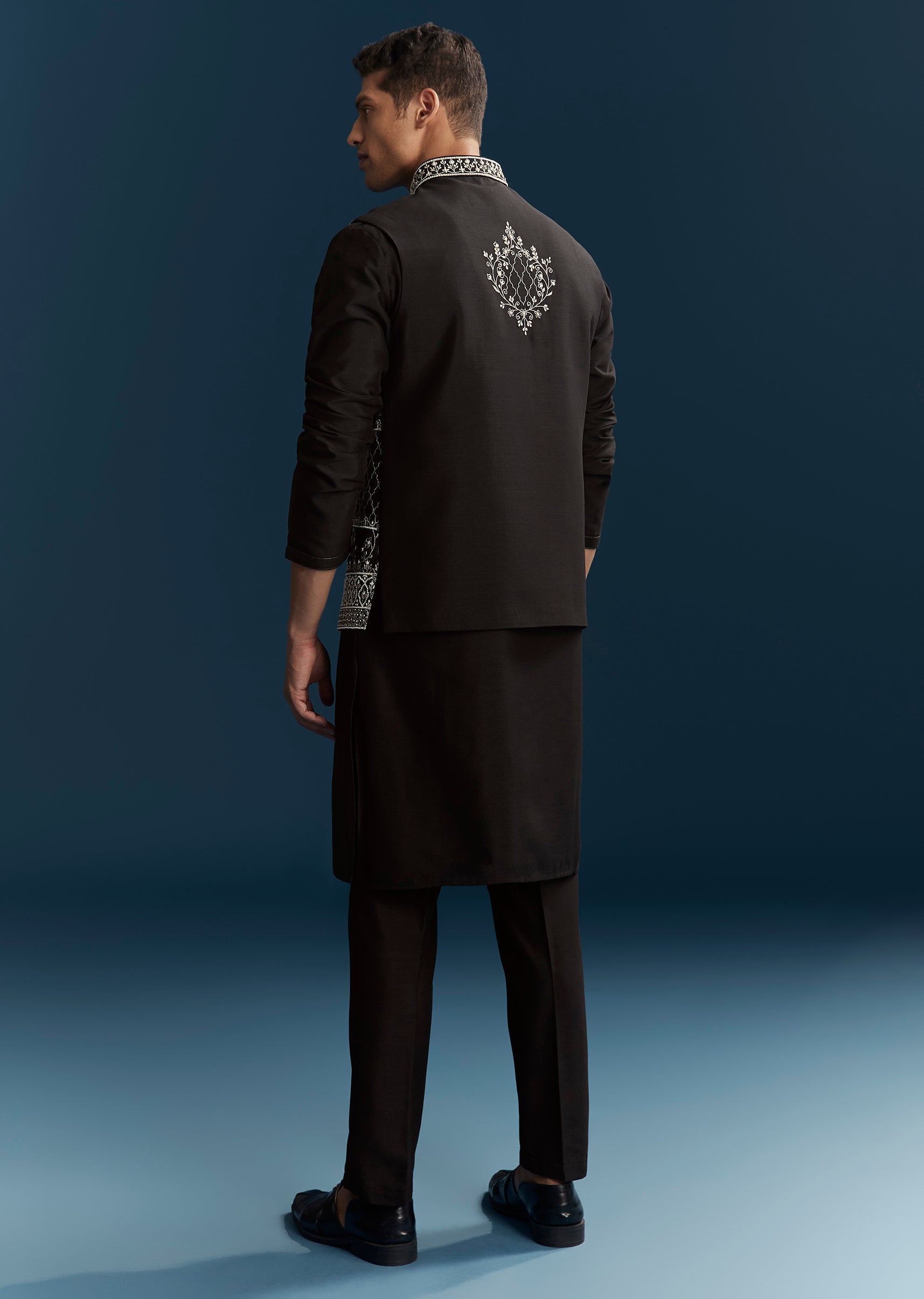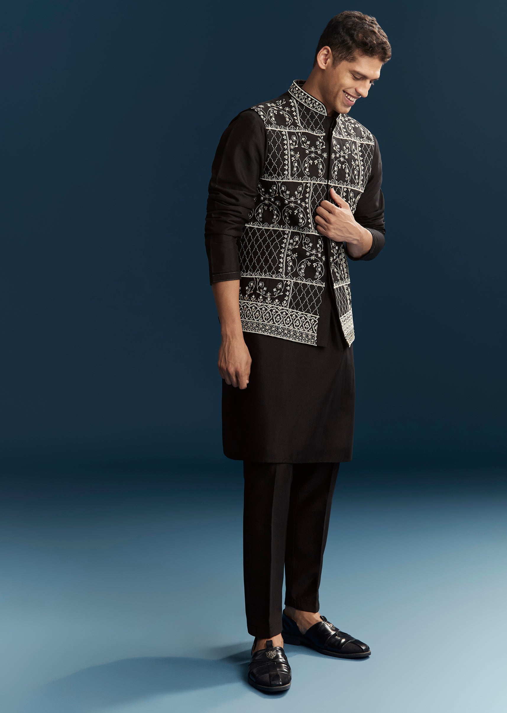 Black Silk Kurta Jacket Set With Thread Detail Work