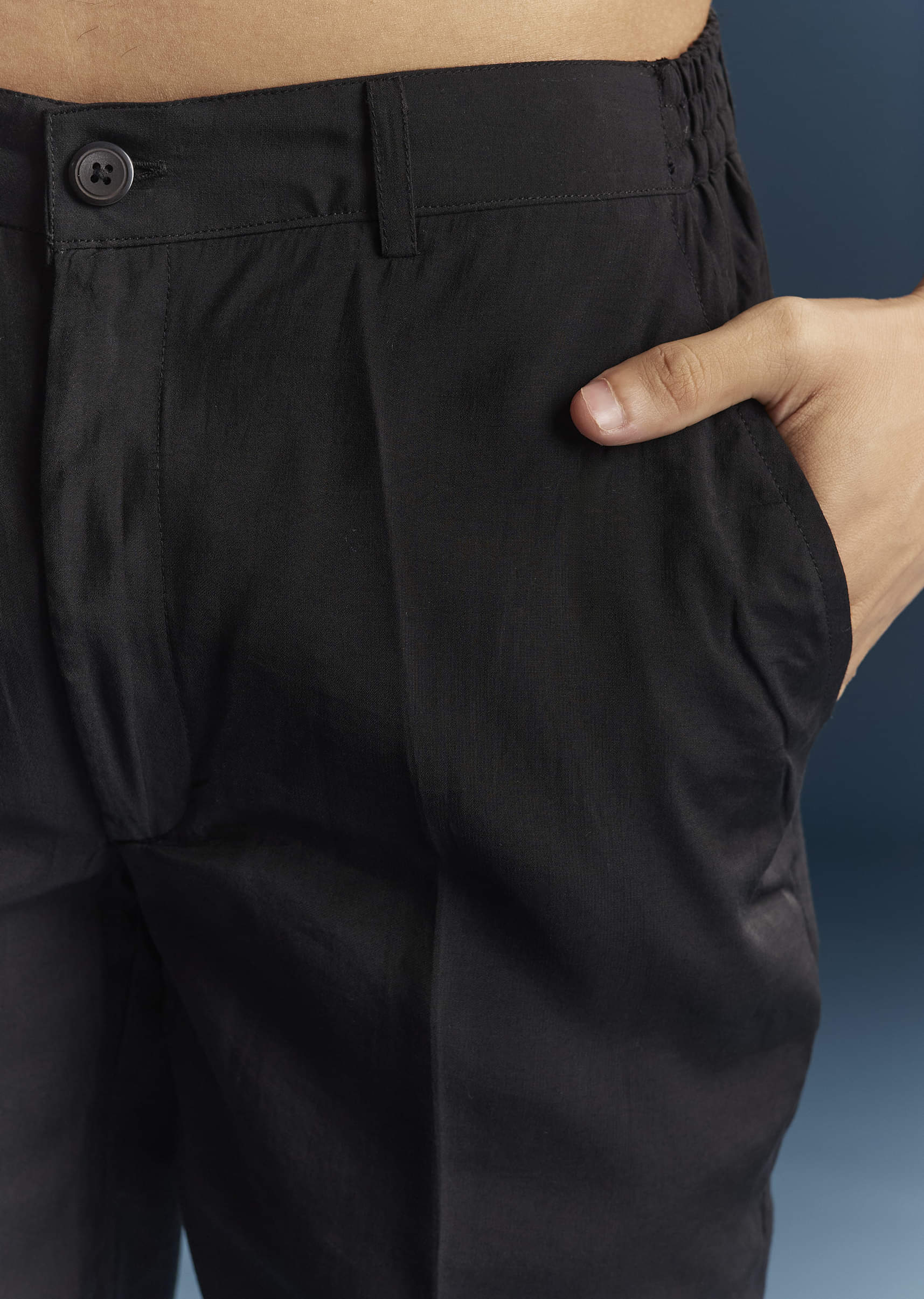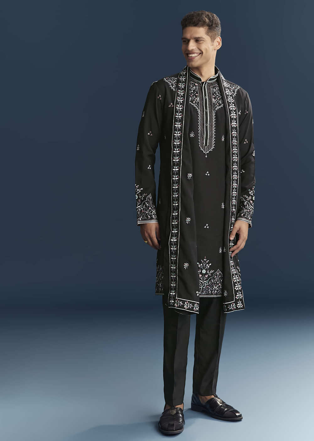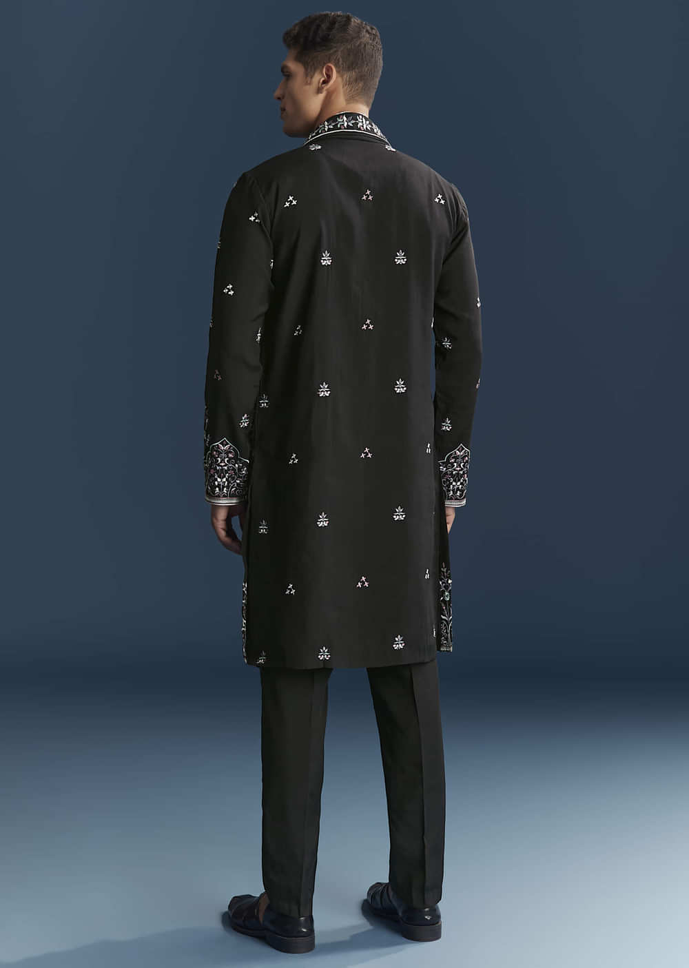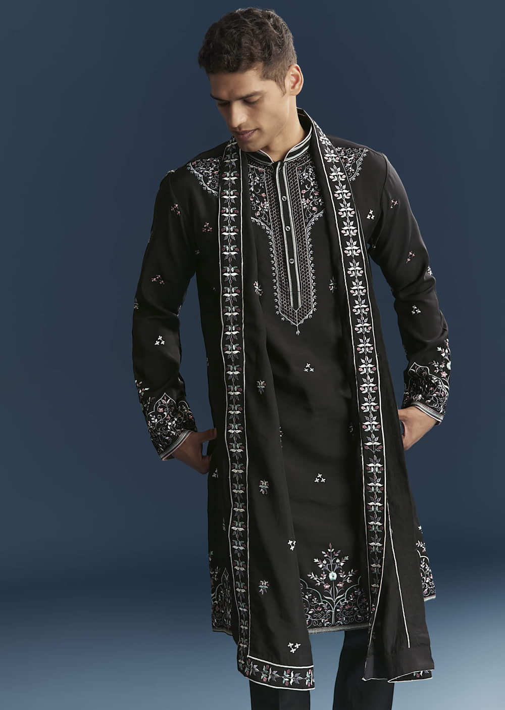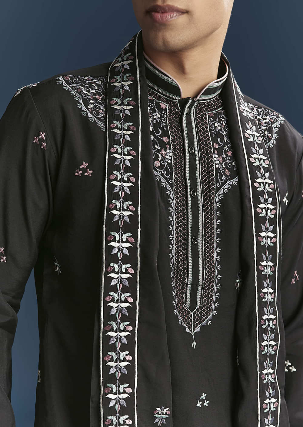 Black Silk Kurta Set For Men With Floral And Geometric Embroidery