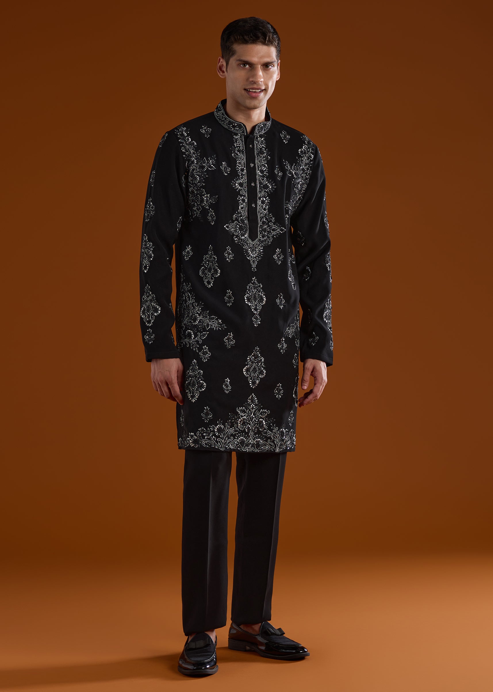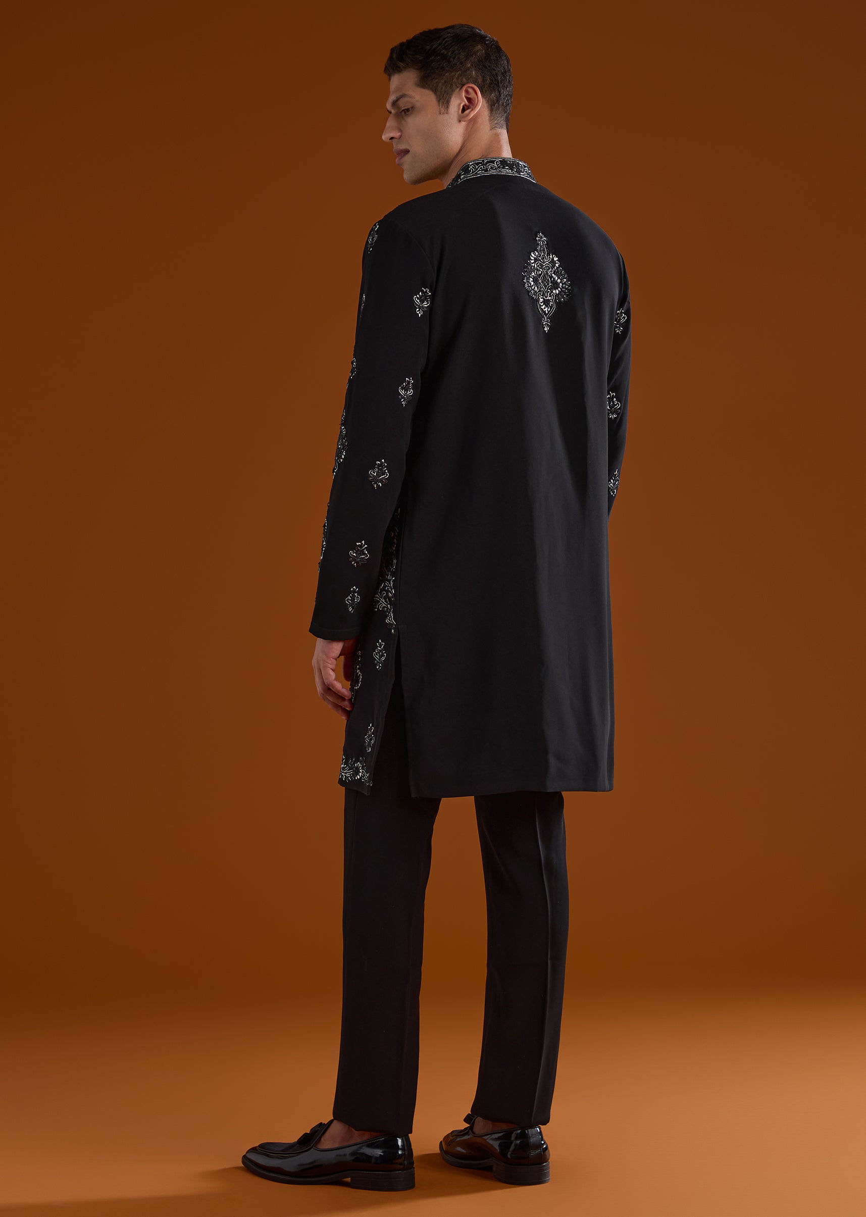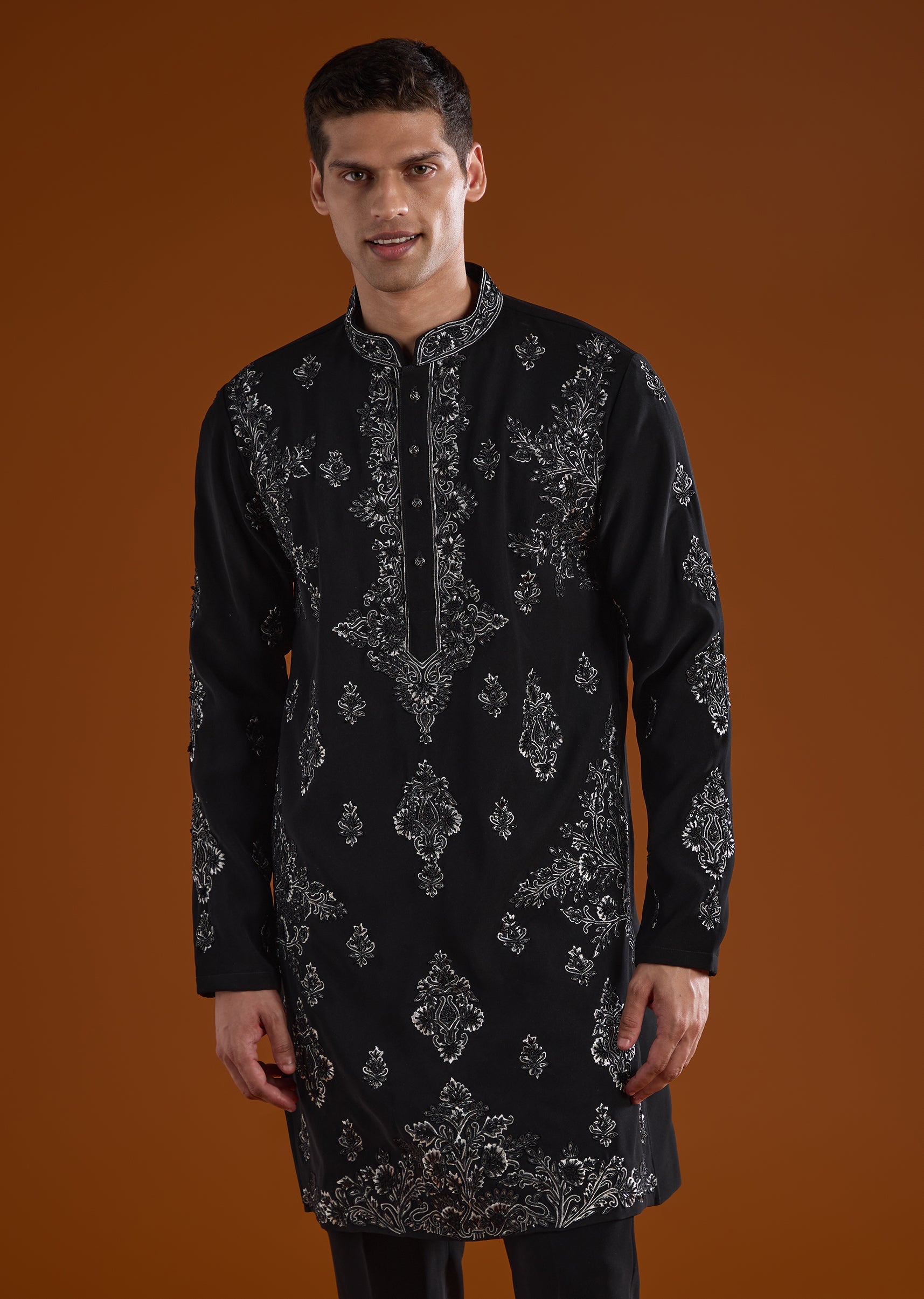 A refined statement for wedding celebrations, this black kurta set is designed for mehendi, sangeet, and reception occasions. Accented with intricate thread and cut dana detail work, it brings a rich festive appeal while remaining elegantly understated. The full sleeves and mandarin collar create a sharp structured silhouette, making it an ideal choice for groomsmen or the groom’s brother. Completed with coordinated bottoms, this ensemble delivers timeless sophistication for ceremonial moments. Awarded as the Most Trusted Brand, we're delivering styles you love, just as promised.