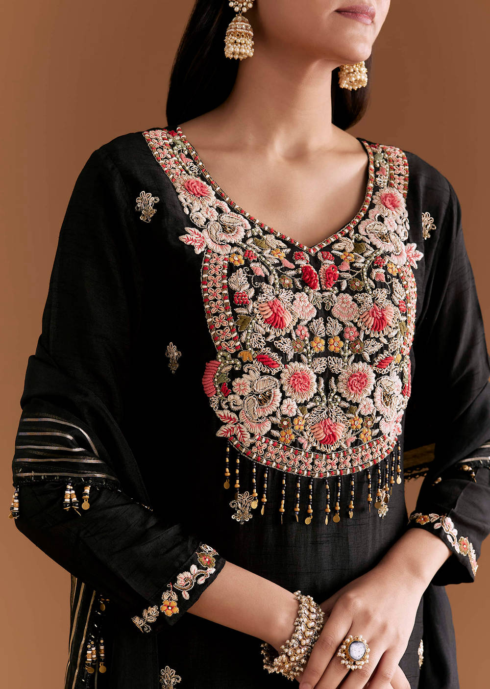 Detail takes the spotlight as this black silk kurta set is traced with zardosi and resham for a crisp, dressy finish. The base remains sleek so the embroidery stands out... More Product Details