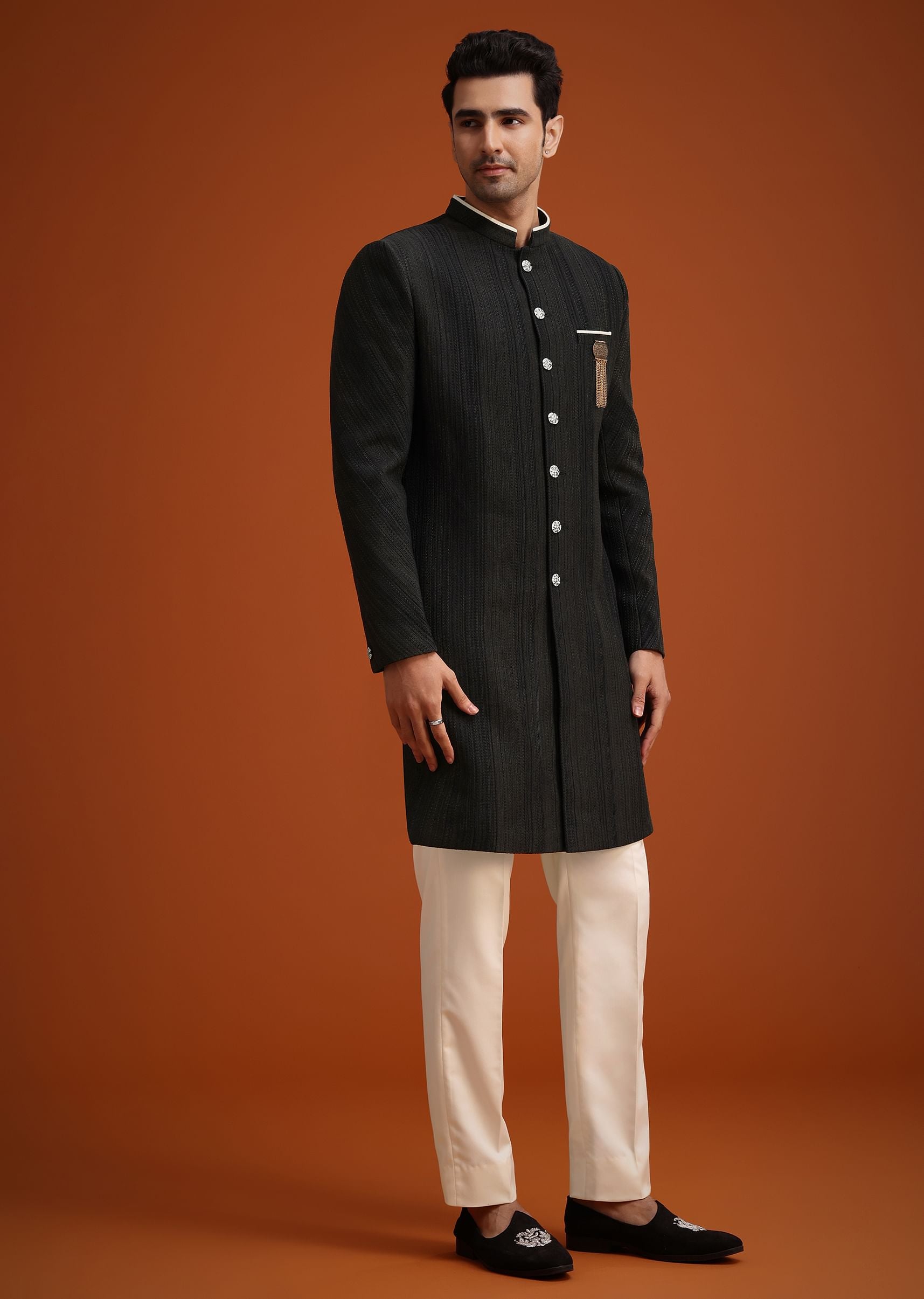 -  This black sherwani set will help you dance through your favorite celebrations in style.