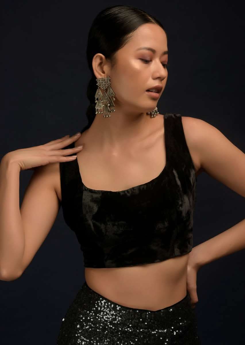 Black Sleeveless Blouse In Velvet With Scooped Neckline And Tassel Dori On The Back
