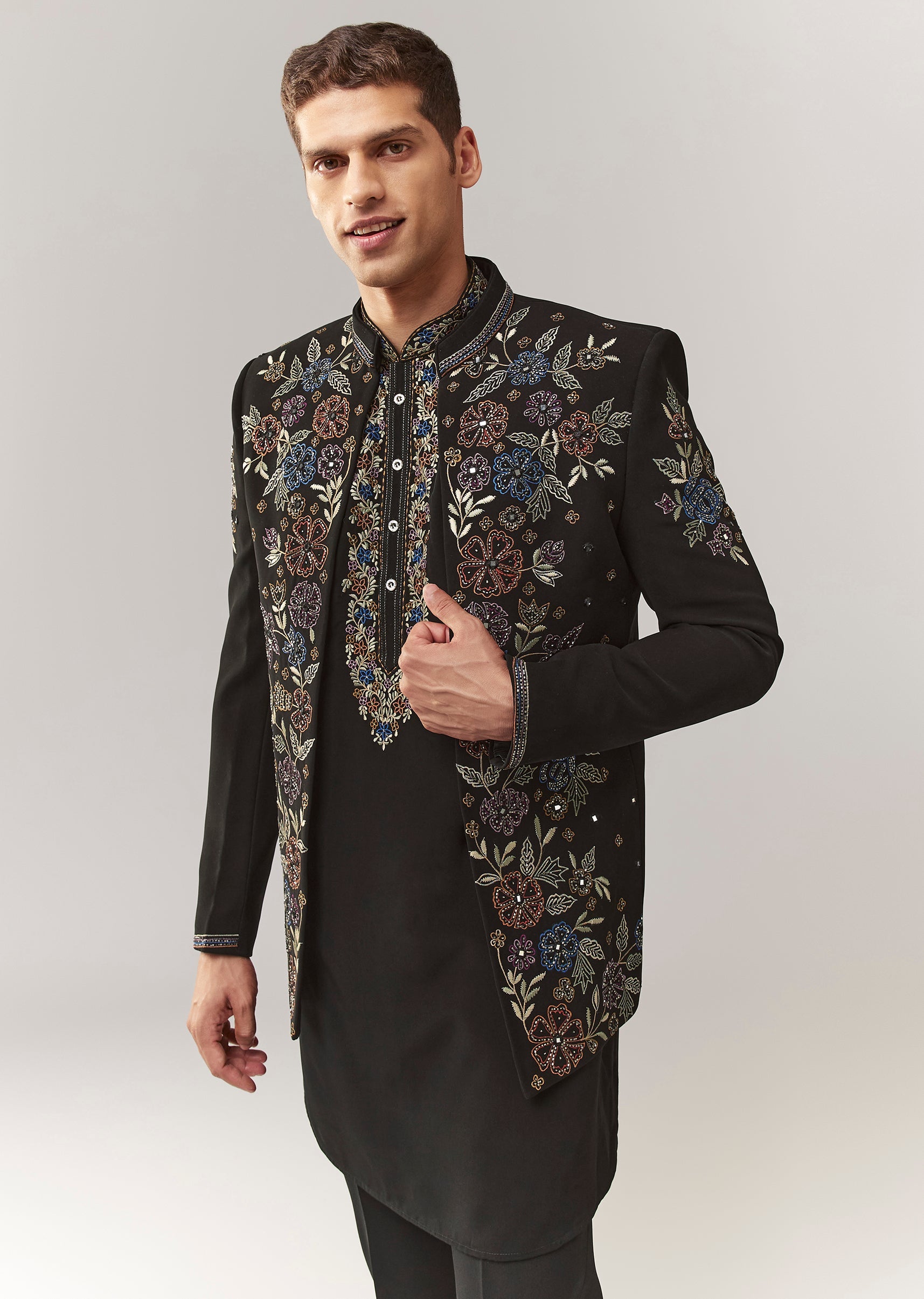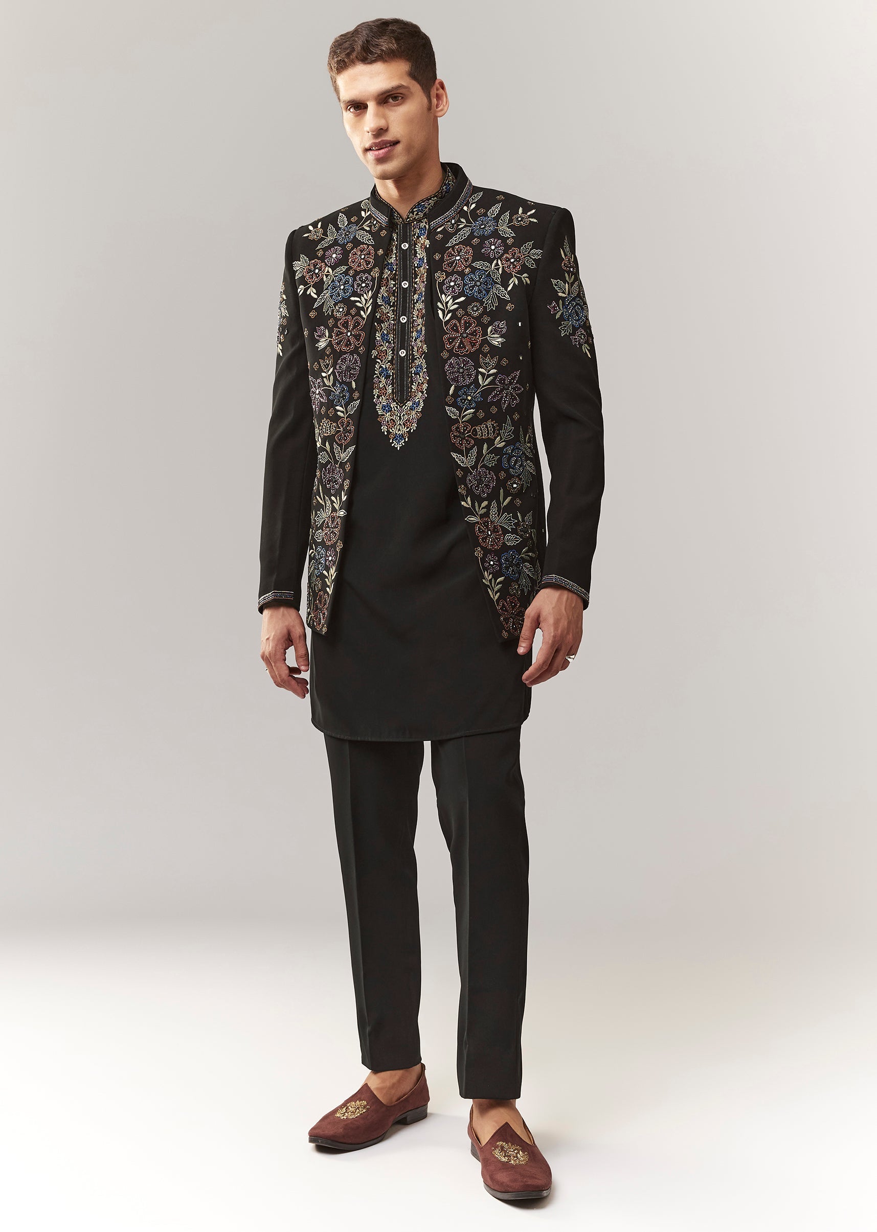 Pair with black mojaris and a sleek pocket square/dupatta drape.