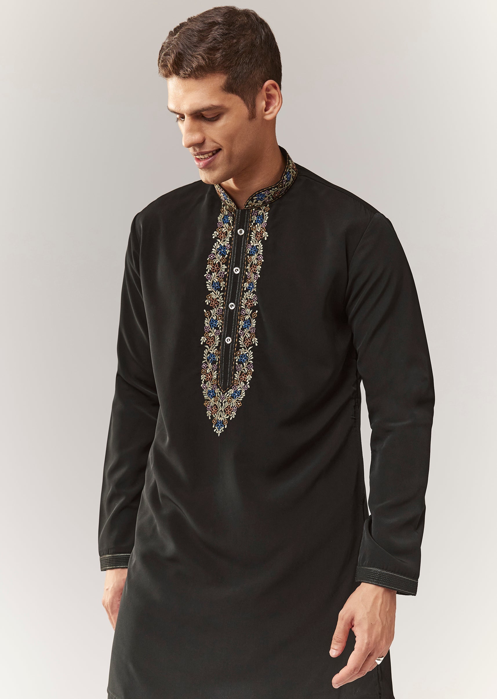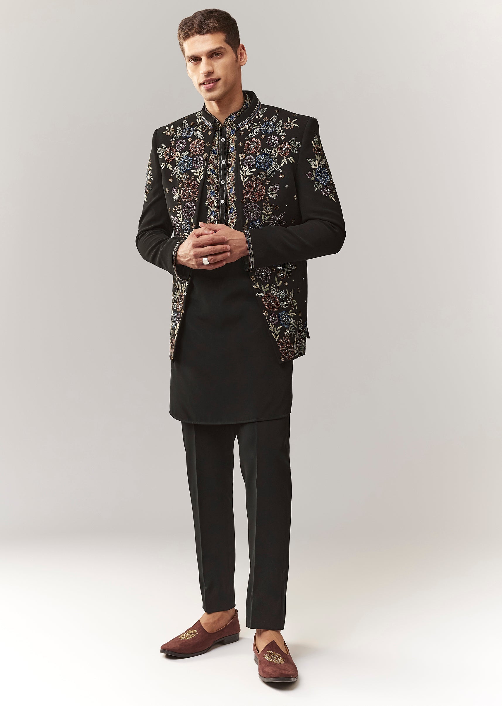 A classic festive jodhpuri set in suiting fabric featuring thread/resham, cutdana, and stone embellishment. Mandarin collar and full sleeves with front button + hook-eye closure. Comes as a 3-piece set:... More Product Details
