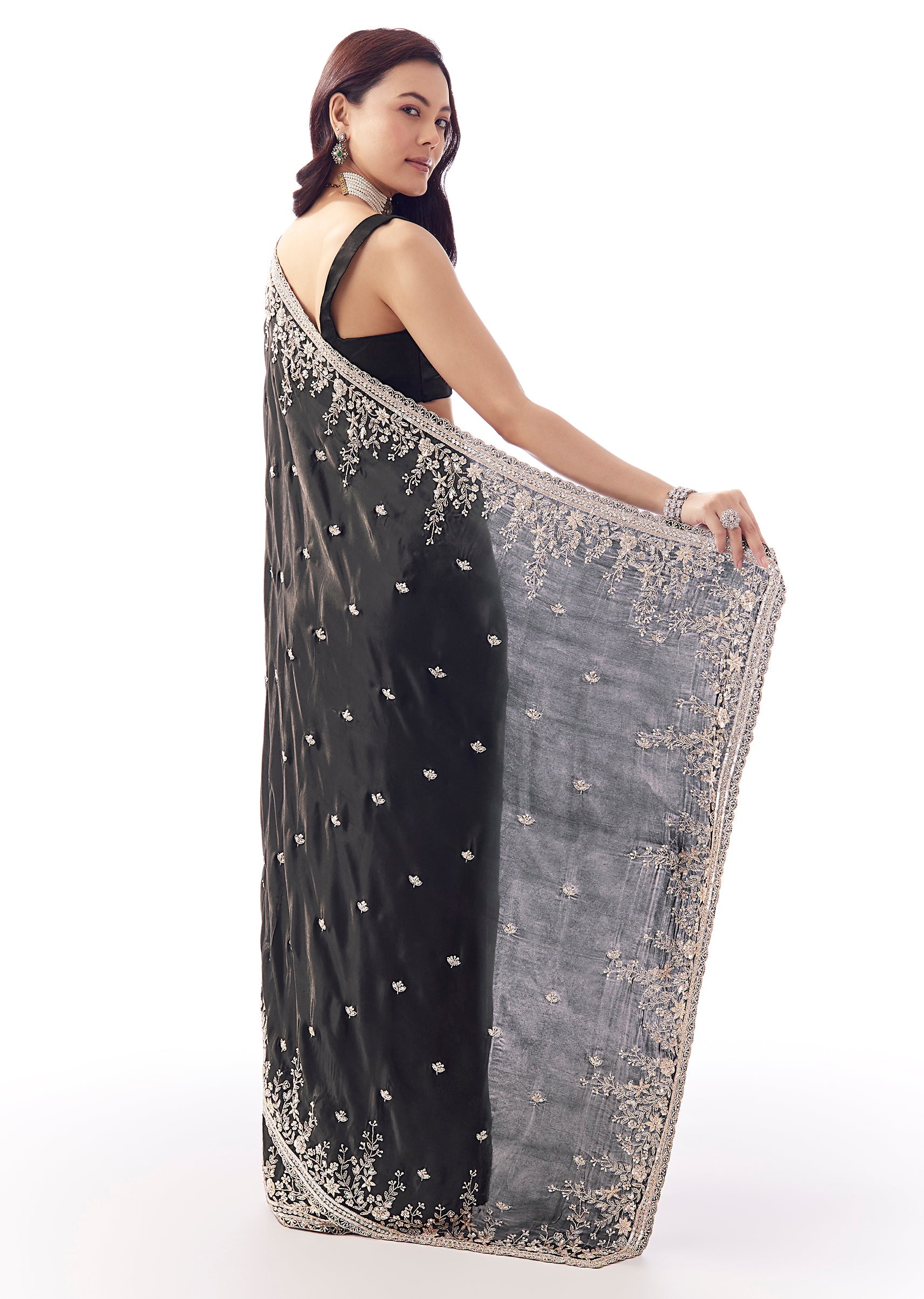 This black tissue silk saree is crafted for glamorous nights. Featuring a heavy floral embroidered uneven border and butti detailing with cutdana, sequins and beads, it gives a couture-like finish while keeping the silhouette fluid. Includes embroidered blouse fabric—perfect for sangeet, mehendi and reception celebrations.