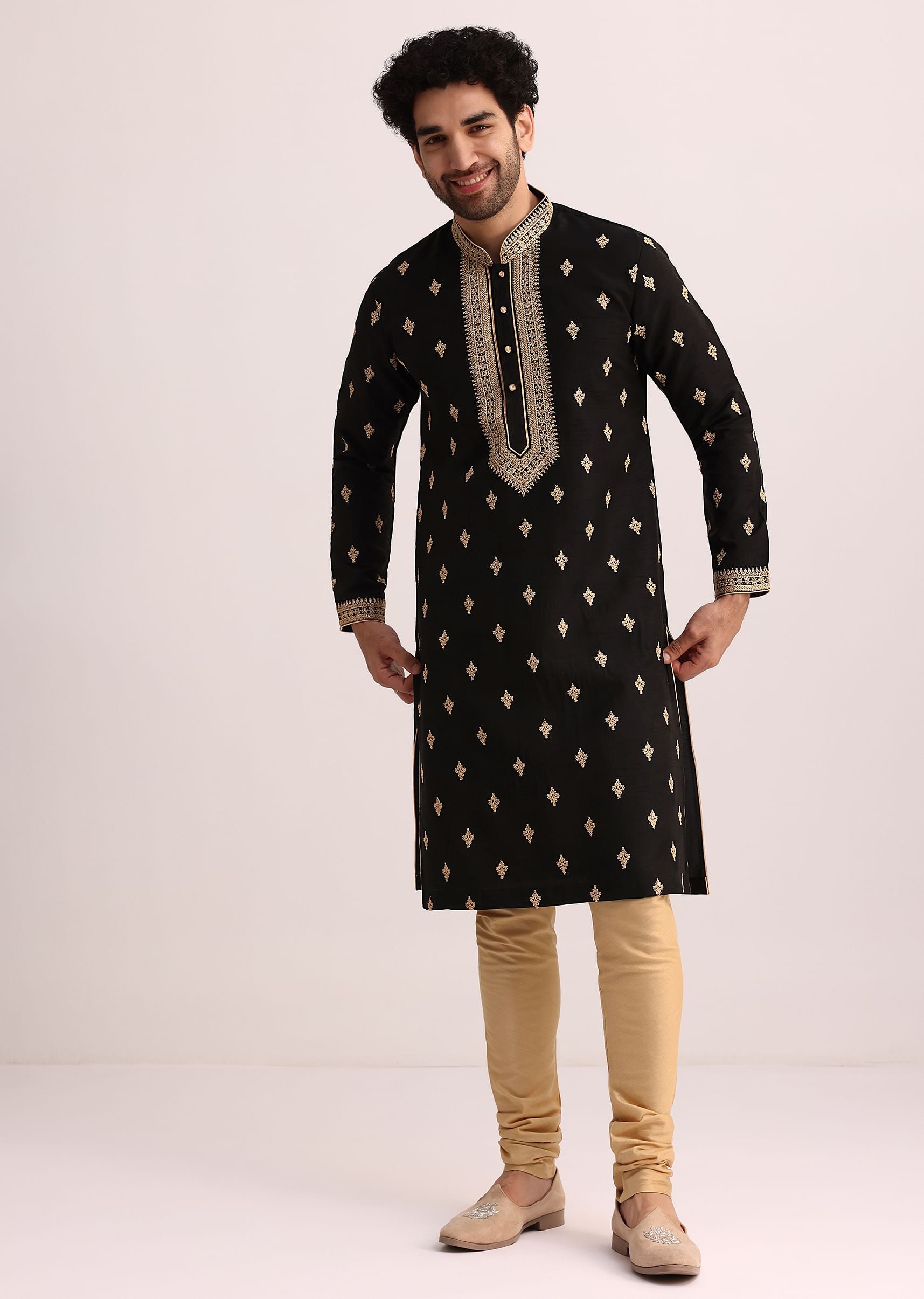 Celebrate the festival of lights and wedding celebrations in this exquisite black kurta set. Crafted from premium silk blend, the precision traditional craftsmanship is highlighted with detailed resham thread embroidered motifs all over. Perfect for any occasion, the kurta comes with co-ordinating pants. Awarded as the Most Trusted Brand, we're delivering styles you love, just as promised.