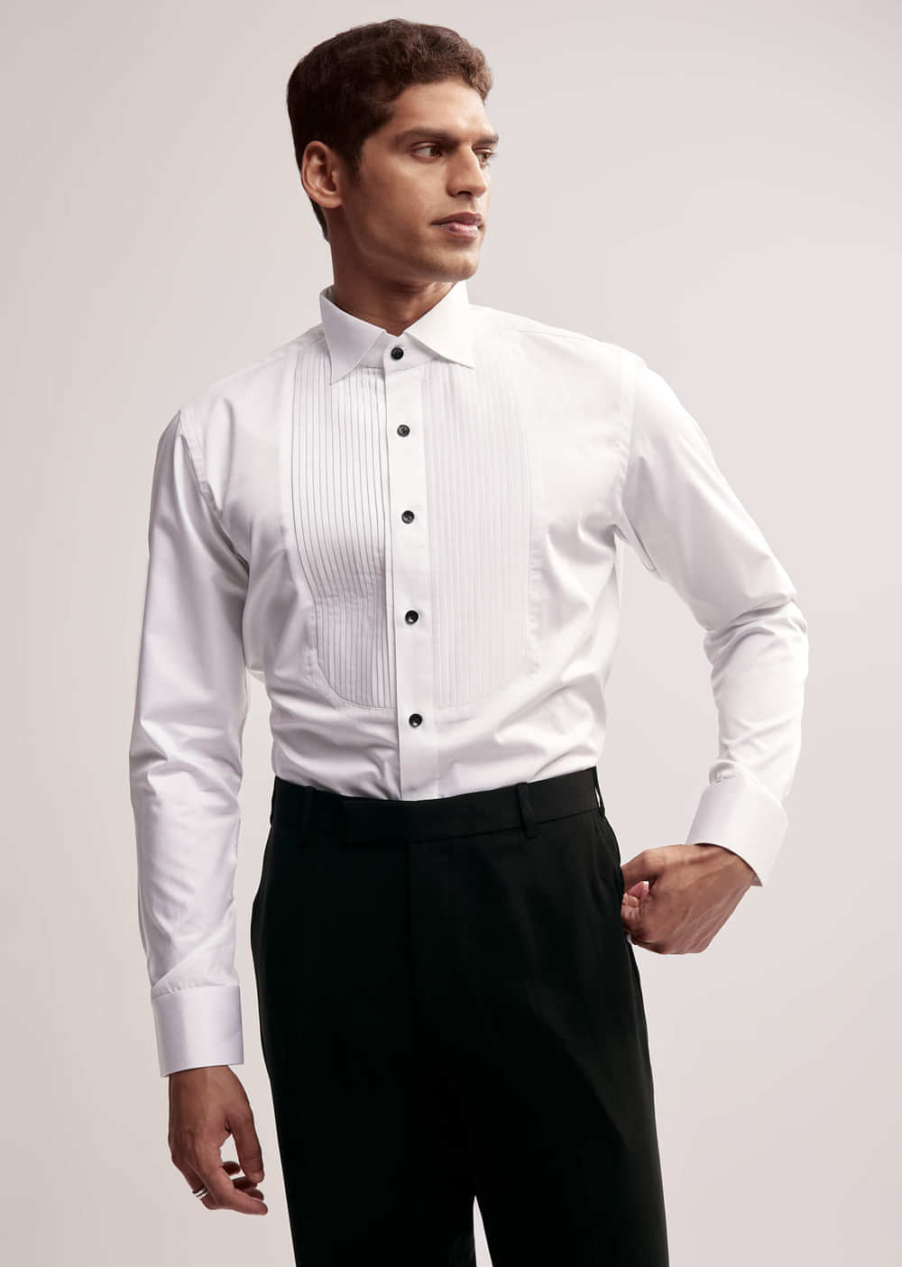 Classic with a twist, this black tuxedo for men makes a strong reception statement. The suiting fabric blazer features a shawl collar highlighted with cut work, paired with shirt, bow, and trousers. It is the go-to pick for grooms or groomsmen at cocktail nights. Awarded as the Most Trusted Brand, we're delivering styles you love, just as promised.
