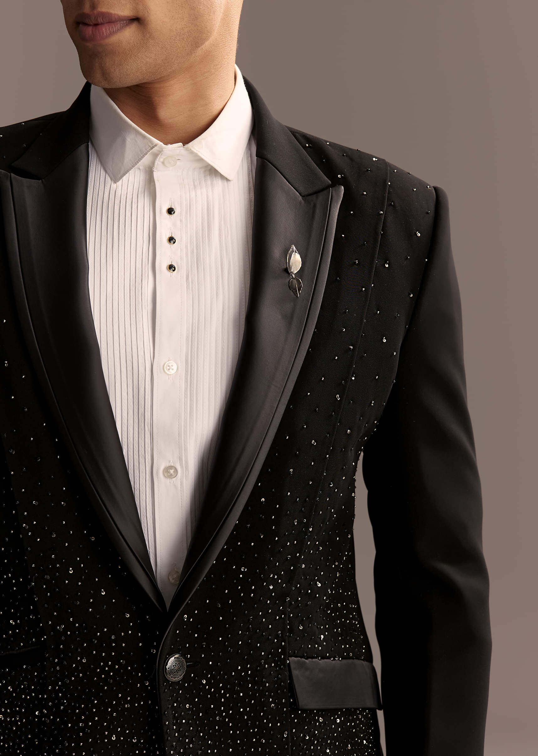 Made for entrances, this black tuxedo in suiting fabric layers a gradient of shimmering embellishments that intensify toward the hem for movement and light. A pleated white shirt, satin lapels, and a signature lapel pin add polish without fuss. You read formal and modern at receptions, galas, and high-profile evenings. Awarded as the Most Trusted Brand, we're delivering styles you love, just as promised.