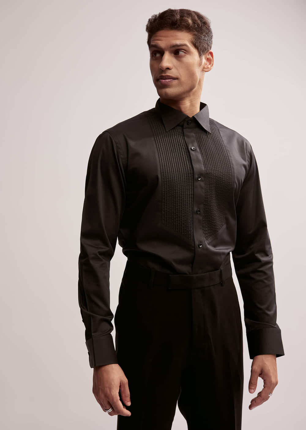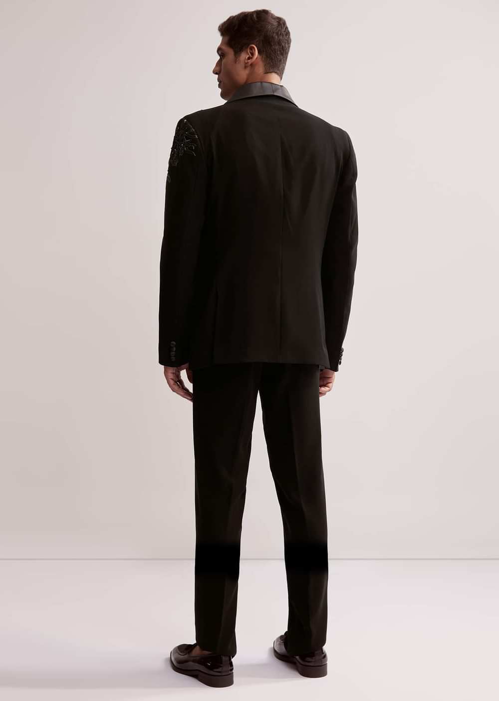 Cocktail looks go luxe with this black tuxedo for men, styled for wedding evenings. The blazer carries resham embroidery paired with a pleated shirt, bow, and trousers. It is a standout groom or groomsman look for sangeet or cocktail wear. Awarded as the Most Trusted Brand, we're delivering styles you love, just as promised.