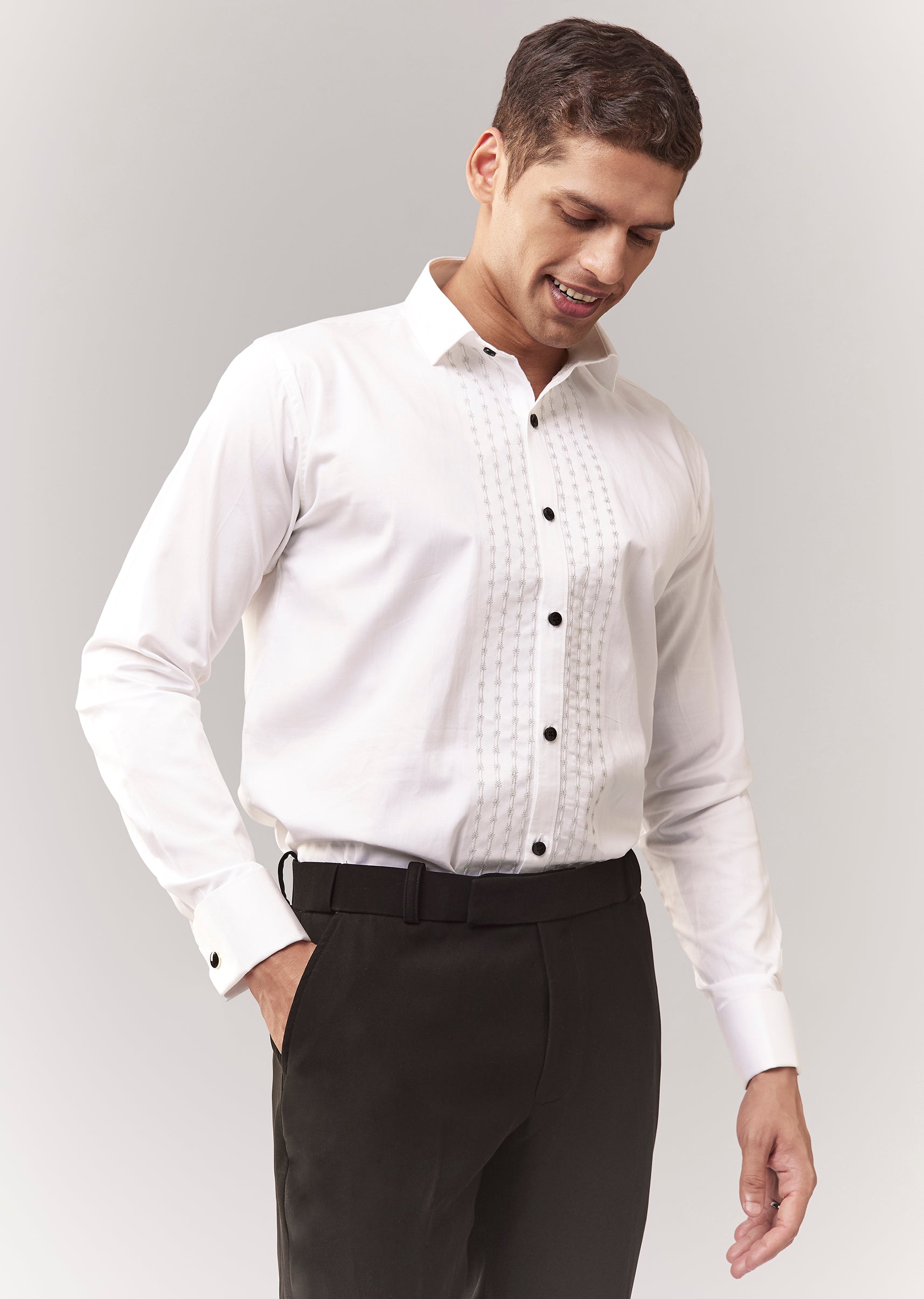 A formal tuxedo set featuring tuxedo + waistcoat + bow + shirt + trouser, highlighted with cutdana embellishment. Mandarin collar and structured front closures make it a reliable cocktail/reception option... More Product Details