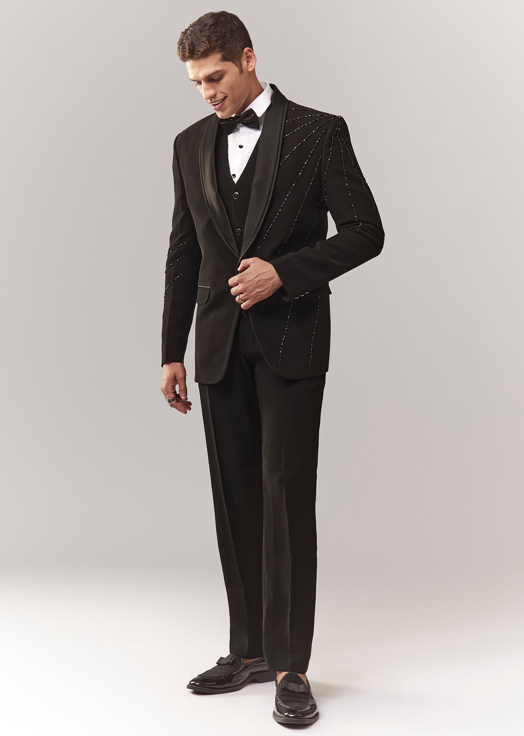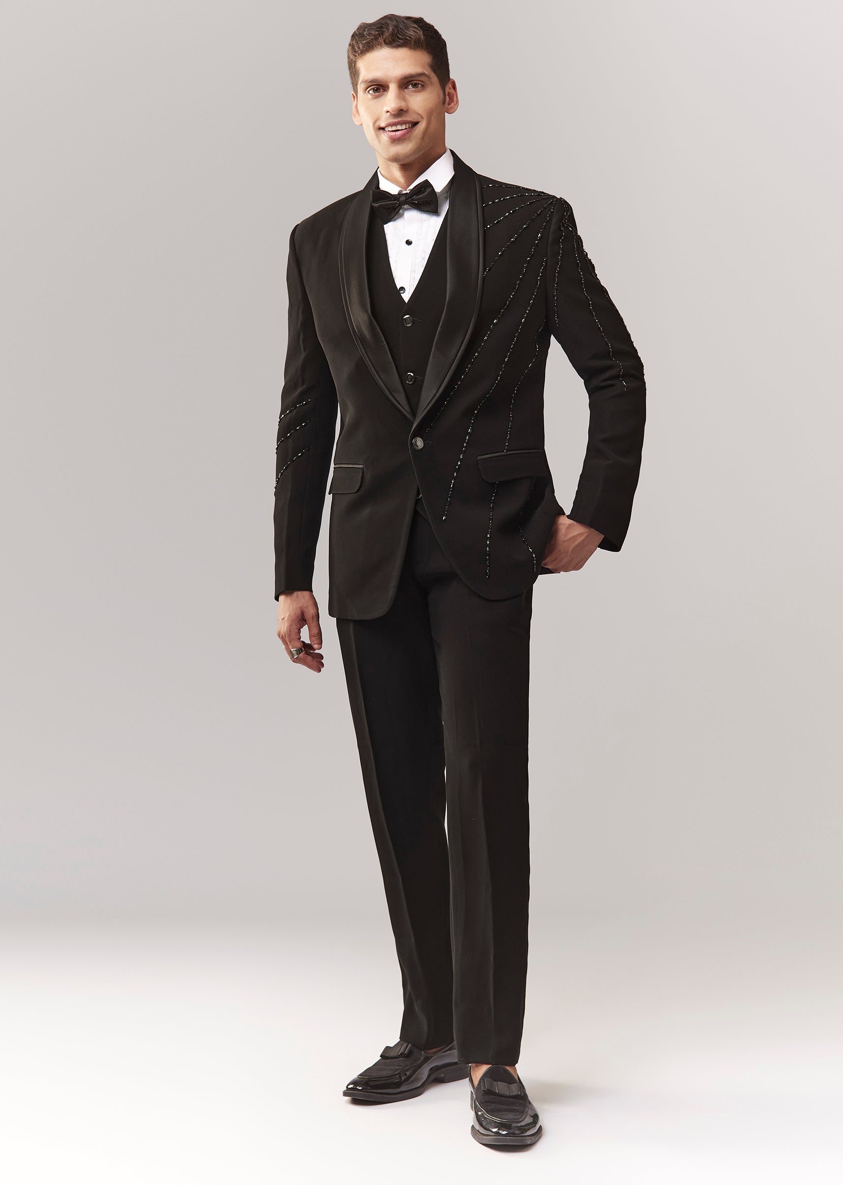 A complete black tuxedo set with waistcoat, bow, shirt, and trouser, featuring cutdana and stone detailing. Mandarin collar with front buttons and hook-eye closure. Great for cocktail/reception dressing where you... More Product Details